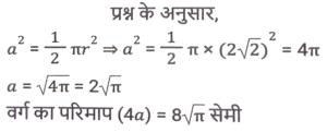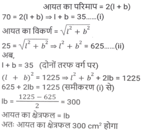 क्षेत्रमिति (Part-VI)Total Questions: 501. दो समरूप त्रिभुजों का क्षेत्रफल 490 वर्ग cm और 640 वर्ग cm है। यदि पहले त्रिभुज की एक भुजा की लंबाई 21 cm है, तो दूसरे त्रिभुज की संगत भुजा की लंबाई क्या है? [SSC CHSL 05/07/2024 (4th Shift)](a) 16 cm(b) 14 cm(c) 24 cm(d) 21 cmCorrect Answer: (c) 24 cmSolution:2. एक रोलर का व्यास 35 cm और इसकी लंबाई 100 cm है। एक खेल के मैदान को समतल बनाने में इसे 200 पूर्ण परिक्रमण लगाने पड़ते हैं। m² में खेल के मैदान का क्षेत्रफल ज्ञात कीजिए। [SSC CHSL 05/07/2024 (4th Shift)](a) 220(b) 2,20,00,000(c) 1,10,000(d) 110Correct Answer: (a) 220Solution:3. एक आयत का परिमाप 70 cm है और इसका विकर्ण 25 cm है। आयत का क्षेत्रफल कितना होगा? [SSC CHSL 08/07/2024 (1st Shift)](a) 425 cm²(b) 420 cm²(c) 300 cm²(d) 625 cm²Correct Answer: (c) 300 cm²Solution:4. 8 cm त्रिज्या के एक ठोस गोले को पिघलाकर प्रत्येक 4 cm व्यास वाली छोटी-छोटी गोलाकार गेंदों में पुनः ढाला जाता है। इस प्रकार प्राप्त गेंदों की संख्या ज्ञात कीजिए। (π = 22/7 का प्रयोग कीजिए)। [SSC CHSL 08/07/2024 (1st Shift)](a) 64(b) 48(c) 32(d) 24Correct Answer: (a) 64Solution:5. यदि एक गोले की त्रिज्या में 3.5 cm की वृद्धि कर दी जाए, तो इसके पृष्ठीय क्षेत्रफल में 550 cm² की वृद्धि हो जाती है। गोले की मूल त्रिज्या क्या थी? ( π = 22/7 का प्रयोग कीजिए) [SSC CHSL 08/07/2024 (2nd Shift)](a) 4 cm(b) 4.5 cm(c) 6 cm(d) 3.5 cmCorrect Answer: (b) 4.5 cmSolution:6. एक वर्ग का परिमाप ज्ञात करें, जिसका क्षेत्रफल 2√2 त्रिज्या के अर्धवृत्त के क्षेत्रफल के बराबर है। [SSC CHSL 08/07/2024 (2nd Shift)](a) 8√π cm(b) 8√2π cm(c) 16√π cm(d) 4√π cmCorrect Answer: (a) 8√π cmSolution:7. 36 cm x 22 cm x 12 cm आयामों वाले एक धातु के ठोस घनाभ को पिघलाकर 6 cm भुजा वाले घनों के रूप में ढाला जाता है। इस प्रकार बने घनों की संख्या ज्ञात कीजिए। [SSC CHSL 08/07/2024 (2nd Shift)](a) 45(b) 46(c) 43(d) 44Correct Answer: (d) 44Solution:8. एक समद्विबाहु समकोण त्रिभुज का क्षेत्रफल 16 m² है। इसका कर्ण __________ है। [SSC CHSL 08/07/2024 (3rd Shift)](a) 0.8 m(b) 8 m(c) 4 m(d) 8 cmCorrect Answer: (b) 8 mSolution:9. 14 cm त्रिज्या वाले गोले के आकार की एक गेंद को पेंट करने की लागत ज्ञात कीजिए, यदि गेंद की पेंटिंग की लागत ₹5 प्रति वर्ग सेंटीमीटर है (π = 22/7 लें) [SSC CHSL 08/07/2024 (4th Shift)](a) ₹12,230(b) ₹12,320(c) ₹13,022(d) ₹13,220Correct Answer: (b) ₹12,320Solution:10. प्रत्येक 5 cm किनारे (edge) वाले दो घनों को उनके फलकों (face) की तरफ से एक-दूसरे के साथ जोड़ा जाता है। इस प्रकार बने घनाभ का पृष्ठीय क्षेत्रफल ज्ञात कीजिए। [SSC CHSL 08/07/2024 (4th Shift)](a) 250 cm²(b) 300 cm²(c) 125 cm²(d) 200 cm²Correct Answer: (a) 250 cm²Solution:Submit Quiz12345Next »