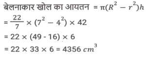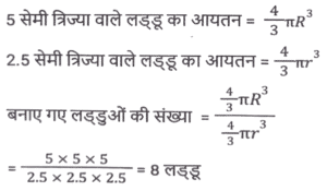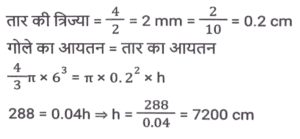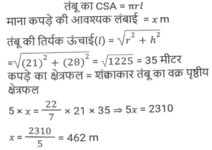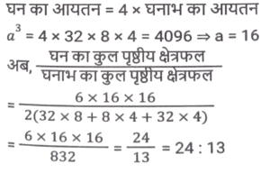 क्षेत्रमिति (Part-VI)Total Questions: 5031. एक समांतर चतुर्भज का आधार उसकी ऊंचाई का दोगुना है। यदि समांतर चतुर्भुज का क्षेत्रफल 338 cm² है, तो इसकी ऊंचाई (cm में) ज्ञात करें। [SSC CPO 27/06/2024 (1st Shift)](a) 13(b) 11(c) 14(d) 12Correct Answer: (a) 13Solution:32. एक शंकु का कुल पृष्ठीय क्षेत्रफल कितना है, जिसकी त्रिज्या r/4 है और तिर्यक ऊंचाई 4ℓ है? [SSC CPO 27/06/2024 (1st Shift)](a)(b)(c)(d)Correct Answer: (b)Solution:33. एक शंक्वाकार तंबू बनाने में कितने मीटर कपड़े की आवश्यकता होगी, जिसके आधार की त्रिज्या 21 मीटर और ऊँचाई 28 मीटर है। कपड़े की चौड़ाई 5 मीटर है। (जहाँ π = 22/7) [SSC CPO 27/06/2024 (1st Shift)](a) 470(b) 462(c) 456(d) 478Correct Answer: (b) 462Solution:34. घन का आयतन, एक घनाभ के आयतन का चार गुना है। यदि घनाभ की भुजाएँ 32 cm, 8 cm और 4 cm हैं, तो घन के कुल पृष्ठीय क्षेत्रफल और घनाभ के कुल पृष्ठीय क्षेत्रफल का अनुपात ज्ञात कीजिए। [SSC CPO 27/06/2024 (2nd Shift)](a) 23:13(b) 24:13(c) 21:13(d) 22:13Correct Answer: (b) 24:13Solution:35. 12 cm व्यास वाले ताँबे के एक गोले को 4 mm व्यास वाले एक तार के रूप में खींचा जाता है। तार की लंबाई (cm में) क्या है? [SSC CPO 27/06/2024 (2nd Shift)](a) 7200(b) 7823(c) 8342(d) 9000Correct Answer: (a) 7200Solution:36. एक घनाकार कमरे में रखी जा सकने वाली छड़ की अधिकतम संभावित लंबाई 42√3 m है। घनाकार कक्ष के भीतर फिट होने वाले गोले का अधिकतम संभावित पृष्ठीय क्षेत्रफल (m² में) क्या होगा? [ π = 22/7 लीजिए।] [SSC CPO 27/06/2024 (2nd Shift)](a) 3590(b) 4589(c) 2564(d) 5544Correct Answer: (d) 5544Solution:37. उस वृत्त के लघु त्रिज्यखंड का क्षेत्रफल ज्ञात कीजिए, जिसकी परिधि 88 cm है और इसके लघु चाप की लंबाई 22 cm है (मान लीजिए π = 22/7)। [SSC CPO 27/06/2024 (2nd Shift)](a) 154 cm²(b) 451 cm²(c) 415 cm²(d) 145 cm²Correct Answer: (a) 154 cm²Solution:38. धातु की एक आयताकार शीट 60 cm x 25 cm है। 5 cm भुजा वाले समान वर्गों को कोनों से काट दिया जाता है और शेष को मोड़कर एक खुला आयताकार बक्सा बनाया जाता है। बक्से का आयतन ज्ञात कीजिए। [SSC CPO 27/06/2024 (3rd Shift)](c) 3750 cm³(a) 2750 cm³(b) 5750 cm³(d) 4750 cm³Correct Answer: (c) 3750 cm³Solution:39. एक जल निकासी टाइल 42 cm लंबा एक बेलनाकार खोल है। आंतरिक और बाह्य व्यास क्रमशः 8 cm और 14 cm है। टाइल के लिए आवश्यक मिट्टी का आयतन (cm³ में) कितना है? (π = 22/7 का उपयोग कीजिए।) [SSC CPO 27/06/2024 (3rd Shift)](a) 5241(b) 4356(c) 4881(d) 4125Correct Answer: (b) 4356Solution:40. 5 cm त्रिज्या वाला एक लड्डू एक दुकानदार का है। उसी एक ही लड्डू से 2.5 cm त्रिज्या के कितने लड्डू बनाए जा सकते हैं? [SSC CPO 28/06/2024 (1st Shift)](a) 2(b) 6(c) 4(d) 8Correct Answer: (d) 8Solution:Submit Quiz« Previous12345Next »