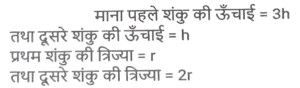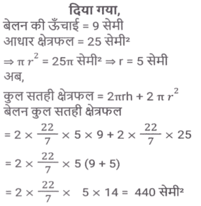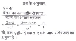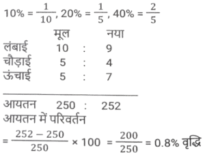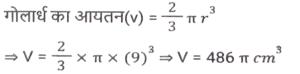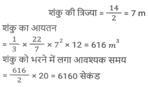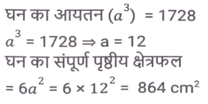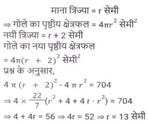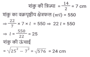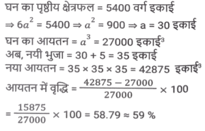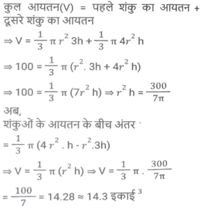 क्षेत्रमिति (Part-VII)Total Questions: 5011. एक शंकु का पार्श्व पृष्ठीय क्षेत्रफल 550 cm² है। यदि शंकु का व्यास 14 cm है, तो इसकी ऊंचाई क्या होगी? [Matriculation Level 20/06/2024 (Shift-1)](a) 24 cm(b) 12.5 cm(c) 12 cm(d) 25 cmCorrect Answer: (a) 24 cmSolution:12. एक अर्धगोले की त्रिज्या 9 cm है। इसका आयतन ज्ञात कीजिए। [Matriculation Level 20/06/2024 (Shift-4)](a) 712π cm³(b) 243π cm³(c) 486π cm³(d) 972π cm³Correct Answer: (c) 486π cm³Solution:13. यदि बेलन की ऊँचाई 9 cm है और आधार का क्षेत्रफल 25π cm² है, तो संपूर्ण पृष्ठीय क्षेत्रफल ज्ञात कीजिए। [Matriculation Level 20/06/2024 (Shift-4)](a) 240 cm²(b) 140 cm²(c) 440 cm²(d) 340 cm²Correct Answer: (c) 440 cm²Solution:14. एक शंकु की ऊंचाई दूसरे शंकु की ऊंचाई से 3 गुना है, जबकि इसकी त्रिज्या दूसरे शंकु की त्रिज्या की आधी है। यदि उनका कुल आयतन 100 इकाई³ है, तो शंकुओं के आयतन में अंतर ___________ इकाई³ है। [Matriculation Level 21/06/2024 (Shift-1)](a) 12.5(b) 14.3(c) 13.4(d) 15.5Correct Answer: (b) 14.3Solution:15. एक घन का पृष्ठीय क्षेत्रफल 5400 वर्ग इकाई है। यदि इसकी भुजा को 5 इकाई बढ़ा दिया जाए तो इसका आयतन लगभग ___________ बढ़ जाएगा। [Matriculation Level 21/06/2024 (Shift-1)](a) 59%(b) 45%(c) 55%(d) 50%Correct Answer: (a) 59%Solution:16. यदि एक गोले की त्रिज्या में 2 cm की वृद्धि की जाती है, तो इसके पृष्ठीय क्षेत्रफल में 704 cm² की वृद्धि होती है। वृद्धि से पहले गोले की त्रिज्या क्या थी? (π = 22/7 का प्रयोग कीजिए) [Matriculation Level 21/06/2024 (Shift-1)](a) 14 cm(b) 11 cm(c) 12 cm(d) 13 cmCorrect Answer: (d) 13 cmSolution:17. यदि किसी घनाभ की लंबाई और चौड़ाई को क्रमशः 10% और 20% कम कर दिया जाता है, जब कि इसकी ऊंचाई को 40% बढ़ा दिया जाता है तो इसके आयतन में कुल कितने प्रतिशत का परिवर्तन होगा? [Matriculation Level 21/06/2024 (Shift - 4)](a) 0.8% की वृद्धि(b) 0.8% की कमी(c) 1.8% की वृद्धि(d) 1.8% की कमीCorrect Answer: (a) 0.8% की वृद्धिSolution:18. एक विशाल शंकु का व्यास 14 m और ऊंचाई 12 m है। इसे प्रति 20 सेकंड में 2 m³ की दर पर पानी से भरा जाता है। शंकु को भरने में कितना समय लगेगा? [Matriculation Level 21/06/2024 (Shift -4)](a) 313 सेकंड(b) 6160 सेकंड(c) 616 सेकंड(d) 12320 सेकंडCorrect Answer: (b) 6160 सेकंडSolution:19. एक घनाभ का आयतन एक घन के आयतन का दोगुना है। यदि घनाभ की विमाएँ 12 cm, 16 cm और 18 cm हैं, तो घन का संपूर्ण पृष्ठीय क्षेत्रफल कितना है? [Matriculation Level 21/06/2024 (Shift-4)](a) 625 cm²(b) 864 cm²(c) 484 cm²(d) 764 cm²Correct Answer: (b) 864 cm²Solution:20. एक ठोस बेलन की ऊंचाई उसकी त्रिज्या की 4 गुनी है। इसका वक्र पृष्ठीय क्षेत्रफल इसके आधार क्षेत्रफल का कितने गुना होगा? [Matriculation Level 21/06/2024 (Shift-4)](a) 2(b) 6(c) 8(d) 4Correct Answer: (c) 8Solution:Submit Quiz« Previous12345Next »