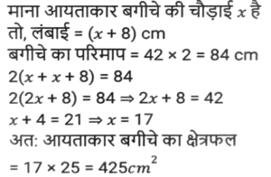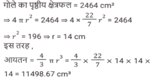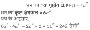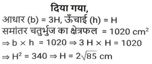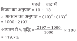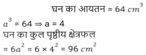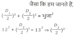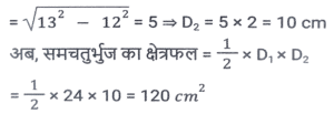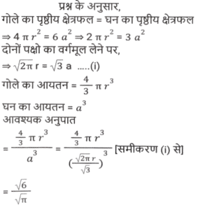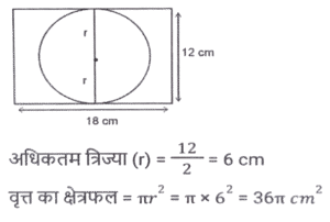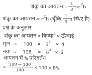 क्षेत्रमिति (Part-VII)Total Questions: 5031. एक समांतरचतुर्भुज का आधार उसकी ऊंचाई का तीन गुना है। यदि समांतरचतुर्भुज का क्षेत्रफल 1020 cm² है, तो इसकी ऊंचाई क्या है? [Higher Secondary 25/06/2024 (Shift-2)](a) 2√85cm(b) √89cm(c) √82cm(d) 2√84cmCorrect Answer: (a) 2√85cmSolution:32. एक गोले और एक घन के पृष्ठीय क्षेत्रफल समान हैं। गोले के आयतन और घन के आयतन का अनुपात ज्ञात करें। [Higher Secondary 25/06/2024 (Shift-4)](a) √6 : √π(b) √π : √8(c) √3 : √π(d) √2 : √πCorrect Answer: (a) √6 : √πSolution:33. एक गोले का पृष्ठीय क्षेत्रफल 2464 cm² है। इसके आयतन की गणना कीजिए। ( π = 22/7 का प्रयोग कीजिए) [Higher Secondary 26/06/2024 (Shift-2)](a) 11598.67 cm³(b) 11478.67 cm³(c) 11488.67 cm³(d) 11498.67 cm³Correct Answer: (d) 11498.67 cm³Solution:34. उस समचतुर्भुज का क्षेत्रफल (सेमी²) में) जिसकी प्रत्येक भुजा 13 सेमी के बराबर है और इसका एक विकर्ण 24 सेमी के बराबर है: [Graduate Level 20/06/2024 (Shift-3)](a) 110(b) 120(c) 60(d) 130Correct Answer: (b) 120Solution:35. उस अधिकतम त्रिज्या वाले एक वृत्त का क्षेत्रफल (cm² में) ज्ञात कीजिए, जिसे 18 cm लंबाई और 12 cm चौड़ाई वाले एक आयत में उत्कीर्ण (inscribe) किया जा सकता है। [Graduate Level 20/06/2024 (Shift-3)](a) 72π(b) 28π(c) 136π(d) 36πCorrect Answer: (d) 36πSolution:36. यदि घन की भुजा 11 cm है, तो घन के कुल पृष्ठीय क्षेत्रफल और पार्श्व पृष्ठ क्षेत्रफल के बीच का अंतर (वर्ग cm में) ___________ है। [Graduate Level 26/06/2024 (Shift-3)](a) 244(b) 243(c) 242(d) 241Correct Answer: (c) 242Solution:37. यदि लंब वृत्तीय शंकु की त्रिज्या 20% बढ़ा दी जाए और इसकी ऊँचाई 25% कम कर दी जाए, तो लंब वृत्तीय शंकु का आयतन कितना बढ़ जाएगा? [Graduate Level 26/06/2024 (Shift-4)](a) 15%(b) 12%(c) 10%(d) 8%Correct Answer: (d) 8%Solution:38. एक आयताकार बगीचे, जिसकी लंबाई इसकी चौड़ाई से 8 cm अधिक है, का आधा परिमाप 42 cm है। आयताकार बगीचे का क्षेत्रफल ज्ञात करें। [Graduate Level 26/06/2024 (Shift-4)](a) 524 cm²(b) 425 cm²(c) 254 cm²(d) 542 cm²Correct Answer: (b) 425 cm²Solution:39. एक घन का आयतन 64 cm³ है। घन का कुल पृष्ठीय क्षेत्रफल __________ है। [Graduate Level 26/06/2024 (Shift-4)](a) 16 cm²(b) 64 cm²(c) 96 cm²(d) 128 cm²Correct Answer: (c) 96 cm²Solution:40. एक गोले के व्यास में 30% की वृद्धि की जाती है। इसके आयतन में प्रतिशतता वृद्धि कितनी होगी ? [SSC CHSL Tier II (02/11/2023)](a) 69%(b) 119.7%(c) 41.7%(d) 90.5%Correct Answer: (b) 119.7%Solution:Submit Quiz« Previous12345Next »
