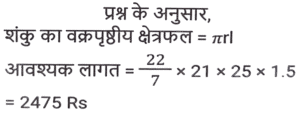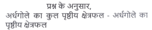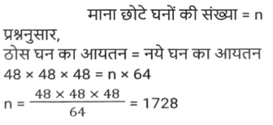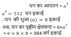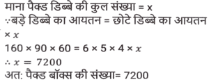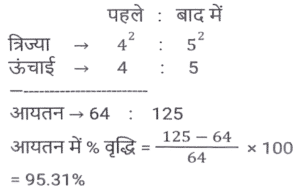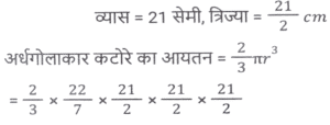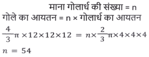 क्षेत्रमिति (Part-VII)Total Questions: 5041. एक अर्धगोलाकार कटोरे का व्यास 21 cm है। कटोरे का आयतन ज्ञात कीजिए। (π = 22/7का प्रयोग कीजिए) [SSC CHSL Tier II (02/11/2023)](a) 2,624.5 cm³(b) 2,425.5 cm³(c) 2,725.5 cm³(d) 2,524.5 cm³Correct Answer: (b) 2,425.5 cm³Solution:42. एक लंब वृत्तीय शंकु की त्रिज्या और ऊंचाई में 25% की वृद्धि की जाती है। शंकु के आयतन में प्रतिशतता में वृद्धि ज्ञात कीजिए (दशमलव के 2 स्थानों तक सन्निकटित)। [SSC CHSL Tier II (02/11/2023)](a) 94.31%(b) 95.31%(c) 94.51%(d) 93.51%Correct Answer: (b) 95.31%Solution:43. एक खोखला घन कागज से बना है जिसका आयतन 512 घन इकाई है। घन बनाने के लिए कितने वर्ग इकाई कागज की आवश्यकता होगी? [SSC CHSL Tier II (10/01/2024)](a) 328(b) 348(c) 288(d) 384Correct Answer: (d) 384Solution:44. एक लंब आयताकार डिब्बे की माप, लंबाई - 1.6 m, चौड़ाई - 90 cm, ऊंचाई - 60 cm है। 6 cm x 5 cm x 40 mm आयामों वाले साबुन के केकों को डिब्बे में इस प्रकार पैक किया जाना कि डिब्बे में कोई खाली जगह न बचे। डिब्बे में कितने केक पैक किए जा सकते हैं? [SSC CHSL Tier II (10/01/2024)](a) 6000(b) 5600(c) 6500(d) 7200Correct Answer: (d) 7200Solution:45. एक संवृत घनाभ की लंबाई, चौड़ाई और ऊँचाई का अनुपात 6 : 3 : 2 दिया गया है। इस घनाभ का संपूर्ण पृष्ठीय क्षेत्रफल 1800 cm² दिया गया है। इस घनाभ का आयतन (cm³ में) ज्ञात कीजिए। [SSC CGL Tier II (26/10/2023)](a) 4650(b) 4800(c) 4500(d) 4200Correct Answer: (c) 4500Solution:46. एक ठोस घन, जिसके प्रत्येक कोर की लंबाई 48cm है, को पिघलाया जाता है। इस पिघले हुए घन से बिना किसी अपव्यय के एक समान ठोस घन, जिनमें से प्रत्येक का आयतन 64 cm³ है, बनाए जाते हैं। ऐसे कितने छोटे घन प्राप्त होंगे? [SSC CGL Tier II (26/10/2023)](a) 1728(b) 1718(c) 1748(d) 1738Correct Answer: (a) 1728Solution:47. ₹25 प्रति m² की दर से एक 30 m ऊंचे ठोस लंब-वृत्तीय बेलन संपूर्ण पृष्ठीय क्षेत्रफल को पेंट करने की लागत ₹18,425 है। इस बेलन का आयतन (m³ में) क्या होगा [π = 22/7 का प्रयोग करें ]? [SSC CPO 03/10/2023 (2nd Shift)](a) 1210(b) 1155(c) 1145(d) 1122Correct Answer: (b) 1155Solution:48. 4 cm व्यास वाले एक अर्धगोले के संपूर्ण पृष्ठीय क्षेत्रफल और वक्र पृष्ठीय क्षेत्रफल का अंतर ज्ञात करें। [SSC CPO 03/10/2023 (2nd Shift)](a) 4.4π cm²(b) 5π cm²(c) 4π cm²(d) 8π cm²Correct Answer: (c) 4π cm²Solution:49. एक शंक्वाकार बर्तन की त्रिज्या 21 cm और तिर्यक ऊंचाई 25 cm है। यदि बर्तन के वक्रीय भाग को सफेद रंग से पेंट किया जाना है, तो ₹1.5 प्रति cm² की दर से पेंटिंग की लागत (₹ में) ज्ञात कीजिए। [SSC CPO 03/10/2023 (2nd Shift)](a) 2475(b) 825(c) 1650(d) 1250Correct Answer: (a) 2475Solution:50. मोम से बने 12 सेमी त्रिज्या वाले एक ठोस गोले को पिघलाया जाता है, और प्रत्येक 4 सेमी त्रिज्या वाले ठोस अर्धगोलों के रूप में ढाला जाता है। इस प्रकार बने ठोस अर्धगोलों की संख्या ज्ञात कीजिए। [SSC CPO 03/10/2023 (3rd Shift)](a) 14(b) 54(c) 28(d) 27Correct Answer: (b) 54Solution:Submit Quiz« Previous12345