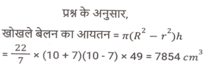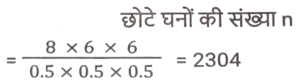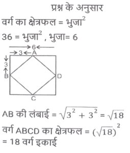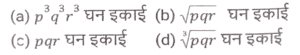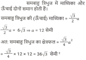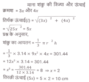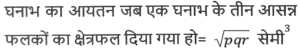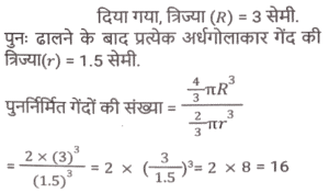 क्षेत्रमिति (Part-VIII)Total Questions: 5011. यदि एक शंकु की तिर्यक ऊंचाई 29 सेमी और ऊंचाई 20 सेमी है, तो इसके संपूर्ण पृष्ठीय क्षेत्रफल और आयतन के परिमाणों का अनुपात ज्ञात कीजिए। [SSC CPO 05/10/2023 (3rd Shift)](a) 3:7(b) 3:14(c) 5:14(d) 7:15Correct Answer: (c) 5:14Solution:12. धातु की एक गोलाकार गेंद की त्रिज्या 3 सेमी है। यदि धातु की इस गेंद को पिघलाया जाता है, और इसकी त्रिज्या के आधे के बराबर त्रिज्या वाले x अर्धगोलों के रूप में पुनः ढाला जाता है, तो x का मान ज्ञात कीजिए। [SSC CPO 05/10/2023 (3rd Shift)](a) 14(b) 16(c) 13(d) 15Correct Answer: (b) 16Solution:13. प्लास्टिक से बनी एक खोखली बेलनाकार नली 3 सेमी मोटी है। यदि बाहरी व्यास 20 सेमी और ट्यूब की लंबाई 49 सेमी है, तो प्लास्टिक का आयतन ज्ञात कीजिए। [SSC CPO 05/10/2023 (3rd Shift)](a) 7644 सेमी³(b) 7238 सेमी³(c) 7854 सेमी³(d) 7546 सेमी³Correct Answer: (c) 7854 सेमी³Solution:14. एक धातु के गोले का व्यास 6 cm है। इसे पिघलाकर एक तार बनाया जाता है, जिसके अनुप्रस्थ काट का व्यास 0.4 cm है। तार की लंबाई (मीटर में) ज्ञात कीजिए। [SSC MTS 01/09/2023 (1st Shift)](a) 18(b) 9(c) 12(d) 10Correct Answer: (b) 9Solution:15. 8 × 6 × 6 इकाई के आयाम वाले घनाभसे 0.5 × 0.5 × 0.5 इकाई आयाम के छोटे-छोटे घन काटे जाते हैं। बड़े घनाभ से कितने छोटे-छोटे घन काटे जा सकते हैं? [SSC MTS 01/09/2023 (3rd Shift)](a) 576(b) 1152(c) 2304(d) 1552Correct Answer: (c) 2304Solution:16. एक लम्ब वृत्तीय शंकु की त्रिज्या और ऊंचाई का अनुपात 3 : 4 है। यदि इसका आयतन 301.44 m³ है, तो शंकु की तिर्यक ऊंचाई ज्ञात कीजिए (π = 3.14 का प्रयोग कीजिए)। [SSC MTS 04/09/2023 (1st Shift)](a) 5 cm(b) 20 cm(c) 10 cm(d) 15 cmCorrect Answer: (c) 10 cmSolution:17. एक घनाकार जलाशय में 50 लीटर प्रति मिनट की दर से पानी डाला जा रहा है। जलाशय का आयतन 120 m³ है। जलाशय को भरने में कितने घंटे लगेंगे ? [SSC MTS 04/09/2023 (3rd Shift)](a) 35(b) 45(c) 40(d) 30Correct Answer: (c) 40Solution:18. 36 वर्ग इकाई क्षेत्रफल वाले एक वर्ग की भुजाओं के मध्य बिन्दुओं का प्रयोग करते हुए एक अन्य वर्ग बनाया जाता है। नए बने वर्ग का क्षेत्रफल वर्ग इकाई में क्या है? [SSC MTS 05/09/2023 (2nd Shift)](a) 24(b) 27(c) 18(d) 21Correct Answer: (c) 18Solution:19. एक समबाहु त्रिभुज की माध्यिका की लंबाई 6√3cm है। इस त्रिभुज का क्षेत्रफल क्या है? [SSC MTS 05/09/2023 (3rd Shift)](a) 36√3 cm²(b) 36 cm²(c) 72 cm²(d) 72√3 cm²Correct Answer: (a) 36√3 cm²Solution:20. एक घनाभ के तीन आसन्न फलकों का क्षेत्रफल क्रमशः p, q और r (इकाई²) है। इसका आयतन कितना है ? [SSC MTS 06/09/2023 (3rd Shift)](a)(b)(c)(d)Correct Answer: (b)Solution:Submit Quiz« Previous12345Next »