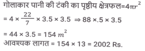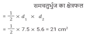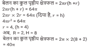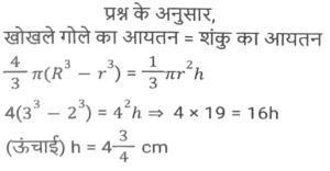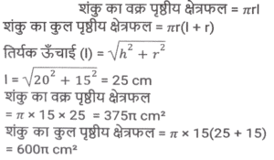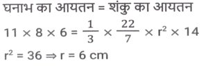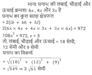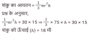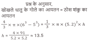 क्षेत्रमिति (Part-VIII)Total Questions: 5021. एक बेलन का कुल पृष्ठीय क्षेत्रफल 641 वर्ग इकाई है, जहाँ बेलन की ऊँचाई इसकी त्रिज्या के बराबर है। यदि ऊंचाई दोगुनी और त्रिज्या आधी कर दी जाए, तो नए बेलन का कुल पृष्ठीय क्षेत्रफल ____________ वर्ग इकाई होगा। [SSC MTS 08/09/2023 (3rd Shift)](a) 54π(b) 40π(c) 64π(d) 48πCorrect Answer: (b) 40πSolution:22. क्रमश: 5 cm और 6 cm आंतरिक और बाह्य त्रिज्याओं वाले एक खोखले धातु के गोले को पिघलाकर 5.2 cm आधार की त्रिज्या के एक ठोस शंकु में ढाला जाता है। शंकु की ऊंचाई (cm में, दशमलव के 1 स्थान तक सन्निकटित) क्या है? [SSC MTS 11/09/2023 (1st Shift)](a) 11.8(b) 12.8(c) 13.5(d) 14.5Correct Answer: (c) 13.5Solution:23. उस समचतुर्भुज का क्षेत्रफल (cm² में) ज्ञात कीजिए जिसके विकर्णों की लंबाई क्रमशः 7.5 cm और 5.6 cm है। [SSC MTS 11/09/2023 (3rd Shift)](a) 21(b) 28(c) 27(d) 30Correct Answer: (a) 21Solution:24. यदि एक खोखले गोले को, जिसके बाह्य और आंतरिक व्यास क्रमशः 6 cm और 4 cm है, को पिघलाकर 8 cm आधार व्यास का एक शंकु बनाया जाता है, तो इस शंकु की ऊंचाई कितनी है? [SSC MTS 12/09/2023 (1st Shift)](a)(b)(c)(d)Correct Answer: (a)Solution:25. 15 व्यक्तियों के रहने के लिए एक शंक्वाकार तम्बू बनाया जाता है। प्रत्येक व्यक्ति के पास जमीन पर 5 वर्ग मीटर जगह है और सांस लेने के लिए 30 घन मीटर हवा होगी। शंक्वाकार तम्बू की ऊंचाई कितनी है ? [SSC MTS 12/09/2023 (2nd Shift)](a) 15 m(b) 22 m(c) 13m(d) 18 mCorrect Answer: (d) 18 mSolution:26. 11 cm लंबाई, 8 cm चौड़ाई और 6 cm ऊंचाई वाले एक ठोस धातु के घनाभ को पिघलाकर 14 cm ऊंचाई वाला एक शंकु बनाया जाता है। इस प्रकार बने शंकु की त्रिज्या क्या है? [SSC MTS 13/09/2023 (3rd Shift)](a) 6 cm(b) 9 cm(c) 7 cm(d) 8 cmCorrect Answer: (a) 6 cmSolution:27. एक घनाभ की लंबाई, चौड़ाई, और ऊंचाई 6 : 4 : 3 के अनुपात में है। यदि घनाभ का कुल पृष्ठीय क्षेत्रफल 972 cm² है, तो घनाभ के विकर्ण की लंबाई (cm में) क्या हैं? [SSC MTS 14/09/2023 (1st Shift)](a)(b)(c)(d)Correct Answer: (b)Solution:28. एक त्रिभुज की भुजाएं 5 cm, 12 cm और 13 cm है। तीनों भुजाओं के मध्य बिंदु को जोड़ने से बने त्रिभुज का क्षेत्रफल क्या होगा? [SSC MTS 14/09/2023 (2nd Shift)](a)(b)(c)(d)Correct Answer: (a)Solution:29. एक लम्ब वृत्तीय शंकु की ऊंचाई 20 cm है, और इसके आधार का व्यास 30 cm है। लम्ब वृत्तीय शंकु का क्रमशः वक्र पृष्ठीय क्षेत्रफल और कुल पृष्ठीय क्षेत्रफल कितना है? [SSC MTS 14/09/2023 (2nd Shift)](a) 335π cm² और 525π cm²(b) 390π cm² और 475π cm²(c) 450π cm² और 625π cm²(d) 375π cm² और 600π cm²Correct Answer: (d) 375π cm² और 600π cm²Solution:30. अमन अपने 7 मी. व्यास वाले गोलाकार उपरी पानी के टैंक को पेंट करवाना चाहता है। यदि पेंटिंग की लागत ₹13 प्रति वर्ग मीटर है, तो अमन के गोलाकार उपरी पानी की टंकी की पेंटिंग की लागत ज्ञात कीजिए। ( π = 22/7 लीजिए) [SSC CHSL 02/08/2023 (2nd Shift)](a) ₹1,872(b) ₹1,984(c) ₹2,002(d) ₹1,926Correct Answer: (c) ₹2,002Solution:Submit Quiz« Previous12345Next »