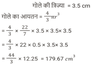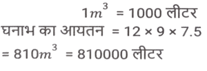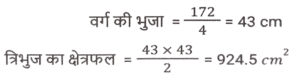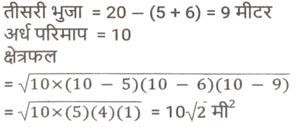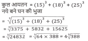 क्षेत्रमिति (Part-VIII)Total Questions: 5031. यदि एक शंकु की ऊंचाई और तिर्यक ऊंचाई क्रमशः 21 सेमी और 29 सेमी है। आयतन ज्ञात कीजिए। (π = 22/7 का प्रोयग करें) [SSC CHSL 02/08/2023 (3rd Shift)](a) 8800 cm³(b) 8780 cm³(c) 8440 cm³(d) 8080 cm³Correct Answer: (a) 8800 cm³Solution:32. एक समांतर चतुर्भुज का परिमाप 48 cm है। यदि समांतर चतुर्भुज की ऊँचाई 6 cm और आसन्न भुजा की लंबाई 8 cm है, तो इसका क्षेत्रफल ज्ञात कीजिए। [SSC CHSL 03/08/2023 (1st Shift)](a) 90 cm²(b) 80 cm²(c) 84 cm²(d) 96 cm²Correct Answer: (d) 96 cm²Solution:33. एक समद्विबाहु त्रिभुज में, यदि असमान भुजा 8 cm है और समान भुजा 5 cm है, तो त्रिभुज का क्षेत्रफल ज्ञात कीजिए । [SSC CHSL 03/08/2023 (1st Shift)](a) 12 cm²(b) 25 cm²(c) 6 cm²(d) 11 cm²Correct Answer: (a) 12 cm²Solution:34. 7 cm किनारे वाले एक घन द्वारा परिगत सबसे बड़े संभावित गोले का आयतन ज्ञात कीजिए। [SSC CHSL 03/08/2023 (2nd Shift)](a) 179.67 cm³(b) 169.67 cm³(c) 189.67 cm³(d) 199.67 cm³Correct Answer: (a) 179.67 cm³Solution:35. यदि एक शहर के नक्शे में एक km के माप को एक पैमाने पर 0.2 cm से दर्शाया गया है और यदि उस देश का क्षेत्रफल 22500 km² है, तो उस क्षेत्रफल को निम्न विकल्पों में कैसे दर्शाया जाएगा ? [SSC CHSL 04/08/2023 (2nd Shift)](a) 2500 cm²(b) 2250 cm²(c) 5625 cm²(d) 900 cm²Correct Answer: (d) 900 cm²Solution:36. धातु के तीन घनों की भुजाएं क्रमशः 15 cm, 18 cm और 25 cm हैं। इन घनों को एक साथ मिलाकर पिघलाने पर बने नए घन की भुजा (cm में) ज्ञात कीजिए ? [SSC CHSL 04/08/2023 (2nd Shift)](a)(b)(c)(d)Correct Answer: (d)Solution:37. एक दुकानदार समान्यतः 9 cm की त्रिज्या का एक बड़ा बेसन का लड्डू (आकार में गोलाकार) बनाता है। बेसन के इस बड़े लड्डू से 3 cm त्रिज्या वाले कितने बेसन के लड्डू बनाए जा सकते हैं ? (π = 22/7 का प्रयोग करे) [SSC CHSL 04/08/2023 (3rd Shift)](a) 9(b) 18(c) 36(d) 27Correct Answer: (d) 27Solution:38. एक त्रिभुज का क्षेत्रफल, एक वर्ग के क्षेत्रफल का आधा है। वर्ग का परिमाप 172 है। त्रिभुज का क्षेत्रफल (cm² में) क्या है? [SSC CHSL 04/08/2023 (4th Shift)](a) 924.5(b) 1984(c) 1849(d) 992Correct Answer: (a) 924.5Solution:39. एक घनाभ के आकार की पानी की टंकी 12 m लंबी, 9m चौड़ी और 7.5 m गहरी है। इसमें कितने लीटर पानी आ सकता है? [SSC CHSL 08/08/2023 (1st Shift)](a) 840000(b) 805000(c) 780000(d) 810000Correct Answer: (d) 810000Solution:40. एक बगीचे की उस त्रिकोणीय फूलों की क्यारी का क्षेत्रफल क्या है जिसका परिमाप 20 मीटर है और दो भुजाएं 5 मीटर और 6 मीटर हैं? [SSC CHSL 08/08/2023 (4th Shift)](a)(b)(c)(d)Correct Answer: (a)Solution:Submit Quiz« Previous12345Next »