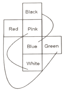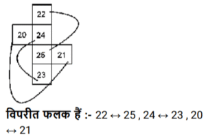 घन और पासा (भाग-II)Total Questions: 5011. यदि नीचे दी गई शीट को मोड़कर एक घन बनाया जाए तो Feb के विपरीत फलक पर कौन-सा शब्द होगा ? [SSC CHSL 05/07/2024 (3rd Shift)](a) Jan(b) June(c) May(d) MarCorrect Answer: (c) MaySolution:विपरीत फलक हैं:- March ↔ April, May ↔ February , Jan ↔ June12. एक पासे के अलग-अलग फलकों पर छः अक्षर - E, J, K, L, M और P अंकित है। निम्न आकृति में इसी पासे की दो अलग-अलग स्थितियां दर्शाई गई हैं। अक्षर M वाले फलक के विपरीत फलक पर कौन-सा अक्षर है? [SSC CHSL 09/07/2024 (1st Shift)](a) J(b) P(c) K(d) ECorrect Answer: (a) JSolution:दो पासों से विपरीत फलक हैं:- P ↔ E , L ↔ K , J ↔ M13. यदि नीचे दी गई शीट को मोड़कर एक घन बनाया जाए तो ‘16’ के विपरीत फलक पर कौन-सी संख्या होगी ? [SSC CHSL 09/07/2024 (1st Shift)](a) 11(b) 14(c) 15(d) 13Correct Answer: (c) 15Solution:विपरीत फलक हैं:- 11 ↔ 12 , 15 ↔ 16 , 13 ↔ 1414. यदि नीचे दी गई शीट को मोड़कर एक घन बनाया जाए तो 'Green' शब्द के विपरीत फ़लक पर कौन-सा शब्द होगा ? [SSC CHSL 09/07/2024 (3rd Shift)](a) Pink(b) Red(c) White(d) BlackCorrect Answer: (b) RedSolution:विपरीत फलक हैं:- Black ↔ Blue , Pink ↔ White , Red ↔ Green15. एक पासे के अलग-अलग फलकों पर छः अक्षर A, R, T, W, Y और Z अंकित हैं। निम्न आकृति में इसी पासे की दो अलग-अलग स्थितियां दर्शाई गई हैं। A अक्षर वाले फलक के विपरीत फलक पर कौन-सा अक्षर है ? [SSC CHSL 09/07/2024 (4th Shift)](a) Y(b) R(c) W(d) ZCorrect Answer: (a) YSolution:दोनों पासों से विपरीत फलक हैं A ↔ Y , R ↔ T16. एक पासे के अलग-अलग फलकों पर छः अक्षर - N, P, R, S, T और U अंकित हैं। निम्न आकृति में इसी पासे की दो अलग-अलग स्थितियां दर्शाई गई हैं। अक्षर U वाले फलक के विपरीत फलक पर कौन-सा अक्षर है ? [SSC CHSL 10/07/2024 (2nd Shift)](a) N(b) R(c) P(d) SCorrect Answer: (b) RSolution:दो पासों से विपरीत फलक हैं:- P ↔ S , U ↔ R17. यदि नीचे दी गई शीट को मोड़कर एक घन बनाया जाए तो ‘VI' के विपरीत फलक पर कौन-सी रोमन संख्या होगी ? [SSC CHSL 10/07/2024 (3rd Shift)](a) V(b) I(c) III(d) IICorrect Answer: (d) IISolution:18. यदि नीचे दी गई शीट को मोड़कर एक घन बनाया जाए तो 23' के विपरीत फलक पर कौन-सी संख्या होगी ? [SSC CHSL 11/07/2024 (1st Shift)](a) 22(b) 20(c) 21(d) 24Correct Answer: (d) 24Solution:19. एक पासे के अलग-अलग फलकों पर छः संख्याएं 1, 2, 4, 5, 7 और 9 अंकित हैं। निम्न आकृति में इसी पासे की दो अलग-अलग स्थितियां दर्शाई गई हैं। संख्या 9 वाले फलक के विपरीत फलक पर कौन-सी संख्या है ? [SSC CHSL 11/07/2024 (2nd Shift)](a) 5(b) 1(c) 7(d) 2Correct Answer: (a) 5Solution:दो पासों से विपरीत फलक हैं:- 1 ↔ 7 , 2 ↔ 4 , 5 ↔ 920. यदि नीचे दी गई शीट को मोड़कर एक घन बनाया जाए तो P' के विपरीत फलक पर कौन-सा अक्षर होगा ? [SSC CHSL 11/07/2024 (4th Shift)](a) L(b) N(c) M(d) KCorrect Answer: (b) NSolution:Submit Quiz« Previous12345Next »