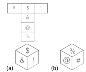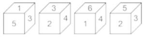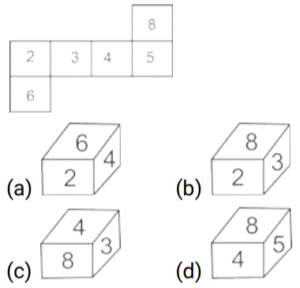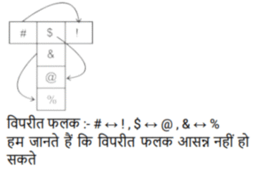 घन और पासा (भाग-III)Total Questions: 5021. एक ही पासे की तीन अलग-अलग स्थितियाँ यहाँ दर्शायी गई हैं। '1' दर्शाने वाले फलक के विपरीत वाले फलक पर आने वाली संख्या ज्ञात कीजिए । [SSC CGL 25/07/2023 (3rd shift)](a) 5(b) 6(c) 2(d) 3Correct Answer: (d) 3Solution:चित्र 1 और 2 से विपरीत फलक :- 4 ↔ 2 , 5 ↔ 6 , 1 ↔ 322. एक ही पासे की दो अलग-अलग स्थितियां दर्शाई गई हैं। 'X' दर्शाने वाले फलक के विपरीत वाले फलक पर कौन-सा अक्षर होगा ? [SSC CGL 27/07/2023 (2nd shift)](a) W(b) S(c) V(d) TCorrect Answer: (d) TSolution:पासा 1 और पासा 2 से, U और S फलक उभयनिष्ठ हैं इसलिए ‘X’ के विपरीत फलक पर 'T' होगा।23. एक ही पासे की दो अलग-अलग स्थितियों को दर्शाया गया है, जिसके फलकों पर B, C, D, E, F और G अक्षर लिखे हुए हैं। [Graduate Level 27/06/2023 (Shift - 4)](a) G(b) D(c) F(d) BCorrect Answer: (c) FSolution:विपरीत फलक हैं:- E ↔ F , G ↔ D , C ↔ B24. यदि दी गई शीट को मोड़कर एक घन बनाया जाता है, तो दी गई आकृतियों में से कौन-सी आकृति बनना संभव नहीं है? [Graduate Level 28/06/2023 (Shift - 3)](a)(b)(c)(d)Correct Answer: (c)Solution:25. यदि दी गई शीट को मोड़कर एक घन बनाया जाता है, तो दी गई आकृतियों में से कौन-सी आकृति बनना संभव नहीं है? [Higher Secondary 27/06/2023 (Shift - 3)](a)(b)(c)(d)Correct Answer: (a)Solution:26. एक ही पासे की दो अलग-अलग स्थितियाँ दिखाई गई हैं, जिसके छह फलक 1 से 6 तक संख्यांकित हैं। ''1” दर्शाने वाले फलक के विपरीत फलक पर अपेक्षित संख्याओं का योग कितना होगा? [Higher Secondary 30/06/2023 (Shift - 2)](a) 8(b) 6(c) 5(d) 7Correct Answer: (a) 8Solution:दिए गए चित्र से5 और 1 उभयनिष्ठ है। अतः , 4 का विपरीत फलक 3 है। 1 का विपरीत 2 या 6 भी हो सकता है। 1 के विपरीत फलक पर अपेक्षित संख्या का योग 8 है।27. एक ही पासे की दो अलग-अलग स्थितियों दिखाई गई हैं, जिनके छ: फलकों पर 1 से6 तक संख्याएँ अंकित है। उस संख्या को चुनिए जो '4’ वाले फलक के विपरीत फलक पर होगी। [SSC CHSL 09/03/2023 (3rd Shift)](a) 5(b) 2(c) 1(d) 3Correct Answer: (d) 3Solution:दिए गए पासे से हम कह सकते हैं कि विपरीत फलक हैं 2 ↔ 6 , 1 ↔ 5 , 3 ↔ 4 अतः , 3 फलक 4 के विपरीत होगा।28. दिए गए कागज को मोड़कर, निम्नलिखित में से कौन सा बक्सा नहीं बनाया जा सकता है? [SSC CHSL 09/03/2023 (4th Shift)](a)(b)(c)(d)Correct Answer: (a)Solution:यह स्पष्ट है की , A ↔ L, B ↔ Y, N ↔ X इसलिए (a) विकल्प है जिसे नहीं बनाया जा सकता है क्योंकि L और A आसन्न नहीं हो सकते है।29. नीचे एक पासे की तीन स्थितियाँ दी गई हैं। '4' वाले फलक के विपरीत फलक पर क्या आएगा? [SSC CHSL 09/03/2023 (4th Shift)](a) 5(b) 6(c) M(d) RCorrect Answer: (c) MSolution:पासा 2 और पासा 3 में, पासे को R से दक्षिणावर्त घुमाते हुए, R ⟶ 9 ⟶ M , R ⟶ 6 ⟶ 4 इसलिए, 4, M के विपरीत है।30. एक ही पासे की चार अलग-अलग स्थितियाँ दर्शाई गई हैं, जिनके छ: फलकों पर 1 से 6 तक संख्याएँ अंकित हैं। उस संख्या का चयन कीजिए जो '1' वाले फलक के विपरीत फलक पर होगी। [SSC CHSL 10/03/2023 (1st Shift)](a) 5(b) 6(c) 4(d) 2Correct Answer: (d) 2Solution:पहले और चौथे पासे में फलक 3 और 5 उभयनिष्ठ हैं। अतः 1 के विपरीत फलक पर 2 होगा ।Submit Quiz« Previous12345Next »