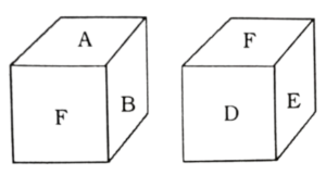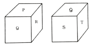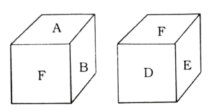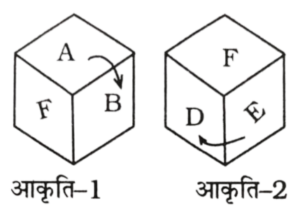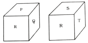 घन और पासा Type-I (1-28 प्रश्न)Total Questions: 2821. नीचे चित्र के अनुसार दर्शाए गए एक पासे की सतहों पर 6 अक्षर PQ, R, S, T और U अंकित हैं। T अंकित सतह के विपरीत की सतह पर कौन-सा अक्षर अंकित है? [RRB RPF SI एवं RPSF परीक्षा, 11.01.2019 द्वितीय पाली](1) Q(2) S(3) P(4) RCorrect Answer: (3) PSolution:P ⇔ T ये सभी एक दूसरे के विपरीतR ⇔ S फलक पर स्थित है।T अंकित सतह के विपरीत सतह पर P अंकित है।22. नीचे चित्र के अनुसार दर्शाए गए एक पासे की सतहों पर 6 अक्षर A, B, C, D, E और F अंकित हैं। D अंकित सतह के विपरीत की सतह पर कौन-सा अक्षर अंकित है? [RRB RPF SI एवं RPSF परीक्षा, 11.01.2019 तृतीय पाली](1) A(2) B(3) C(4) ECorrect Answer: (2) BSolution:आकृति - 1 आकृति -2आकृति - 1 तथा - 2 से,A ⇔ EB ⇔ DF ⇔ Cये सभी एक दूसरे के विपरीत फलक पर स्थित है।अतः D के विपरीत सतह पर B अंकित है।23. पासे के प्रत्येक पृष्ठ पर 6 अक्षर P, Q. R, S, T और U अंकित हैं जैसा कि चित्र में दर्शाया गया है। अक्षर T के विपरीत पृष्ठ पर कौन-सा अक्षर अंकित हैं? [RRB RPF SI एवं RPSF परीक्षा, 12.01.2019 द्वितीय पाली](1) R(2) S(3) U(4) PCorrect Answer: (1) RSolution:आकृति-1 तथा -2 से,S ⇔ UQ ⇔ PT ⇔ Rये सभी एक-दूसरे के विपरीत फलक पर स्थित हैं।"T" के विपरीत फलक पर 'R' अंकित हैं।24. दिए हुए चित्र के अनुसार पासे की प्रत्येक सतह पर 6 अक्षर A, B, C, D, E और F अंकित है। जिस सतह पर C अक्षर अंकित है, उसके विपरीत वाली सतह पर कौन-सा अक्षर अंकित होगा। [RRB RPF SI एवं RPSF परीक्षा, 12.01.2019 तृतीय पाली](1) F(2) A(3) B(4) ECorrect Answer: (1) FSolution:आकृति – 1 तथा आकृति -2 सेA ⇔ EB ⇔ DF ⇔ Cये सभी एक-दूसरे के विपरीत फलक पर स्थित है।अतः C के विपरीत फलक पर F स्थित है।25. दिए हुए चित्र के अनुसार पासे की प्रत्येक सतह पर 6 अक्षर A, B, C, D, E और F अंकित हैं। जिस सतह पर D अक्षर अंकित है, उसके विपरीत वाली सतह पर कौन-सा अक्षर अंकित होगा। [RRB RPF SI एवं RPSF परीक्षा, 13.01.2019 द्वितीय पाली](1) F(2) C(3) A(4) ECorrect Answer: (3) ASolution:(C ⇔ E) ये सभी विपरीत फलक पर स्थित है।(D ⇔ A) ये सभी विपरीत फलक पर स्थित है।(B ⇔ F) ये सभी विपरीत फलक पर स्थित है।D के विपरीत सतह पर A अंकित है।26. नीचे चित्र के अनुसार दर्शाये गए एक पांसे की प्रत्येक सतह बैंगनी (Purple), लाल (red), पीले (Yellow), नीले (Blue), ग्रे (Gray) और सफेद (white) रंगों से रंगी हुई हैं। पीले रंग की सतह के विपरीत की सतह किस रंग से रंगी हुई है? [RRB RPF SI एवं RPSF परीक्षा, 13.01.2019 तृतीय पाली](1) नीले (Blue)(2) ग्रे (Gray)(3) सफेद (White)(4) लाल (Red)Correct Answer: (3) सफेद (White)Solution:आकृति - 1 तथा 2 से,नीला ⇔ बैंगनीग्रे ⇔ लालसफेद ⇔ पीलाये सभी एक-दूसरे के विपरीत फलक पर स्थित हैं।पीला के विपरीत फलक पर सफेद स्थित हैं।27. नीचे चित्र के अनुसार दर्शाये गए एक पासे की सतहों पर 6 अक्षर, P, Q, R, S, T और U अंकित हैं। P अंकित सतह के विपरीत सतह पर कौनसा अक्षर अंकित है? [RRB RPF SI एवं RPSF परीक्षा, 16.01.2019 द्वितीय पाली](1) Q(2) R(3) T(4) SCorrect Answer: (4) SSolution:(P ⇔ S) ये सभी एक दूसरे के विपरीत फलक पर स्थित है। (Q ⇔ T) ये सभी एक दूसरे के विपरीत फलक पर स्थित है। (R ⇔ U) ये सभी एक दूसरे के विपरीत फलक पर स्थित है।P के विपरीत सतह पर 'S' अंकित है।28. एक पासे की तीन अलग-अ
