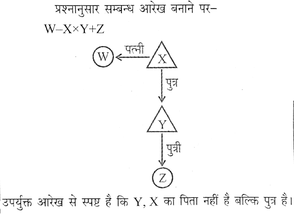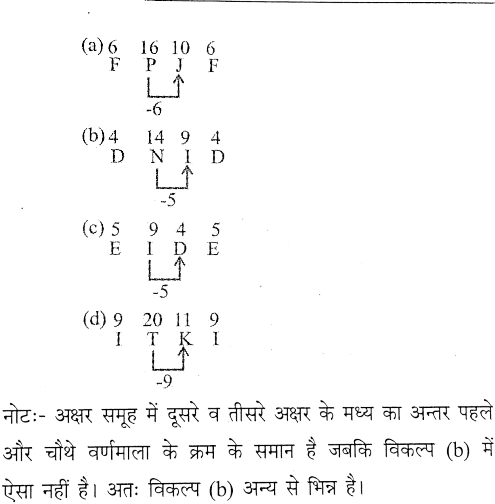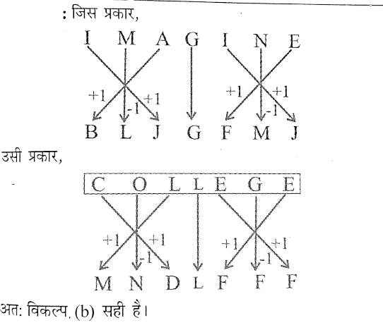 घरेलू विज्ञान शिक्षा (परीक्षा 2023)Total Questions: 4211. सात व्यक्ति A, B, C, D, E, F और G हैं, सभी अलग- अलग कक्षाओं में पढ़ रहे हैं, जिनमें से प्रत्येक की लंबाई अलग-अलग है। D, F से लंबा है, जबकि C, B से लंबा है। B, F और E से लंबा है। A किसी से भी लंबा नहीं है। D, B से छोटा है। G, C से लंबा है। E, F से छोटा है। सभी में दूसरा सबसे लंबा कौन है?(a) E(b) C(c) B(d) FCorrect Answer: (b) CSolution:प्रश्नानुसार,G>C>B>D>F>E>Aअतः स्पष्ट है कि सभी में दूसरा सबसे लंबा 'C' है।12. किसी निश्चित कूट भाषा में, "IMAGINE” को BLJGFMJ लिखा जाता है। निम्नलिखित में से किस शब्द को "MNDLFFF" के रूप में कूटबद्ध किया गया है?(a) FAILURE(b) COLLEGE(c) COMMAND(d) SUCCESSCorrect Answer: (b) COLLEGESolution:13. धरातल पर स्थित सात बिंदुओं के बारे में दी गई जानकारी को ध्यानपूर्वक पढ़ेंः1. A, B के 10 m पश्चिम में है, जो C के 10 m उत्तर में है।2. E, D के 20 m उत्तर में है, जो C के 10 m पश्चिम में है।3. G, F के 20 m दक्षिण में है, जो E के 10 m पश्चिम में है।G और C के बीच की दूरी और C के सन्दर्भ में G की दिशा क्या है?(a) 10 m, पूर्व(b) 10 m, पश्चिम(c) 20 m, पश्चिम(d) 20 m, पूर्वCorrect Answer: (c) 20 m, पश्चिमSolution:14. एक ही पासे की तीन अलग-अलग स्थितियां दिखाई गई हैं। उस पैटर्न का चयन करें, जो वाले के सामने वाले फलक पर होगा। (a)(b)(c)(d)Correct Answer: (d)Solution:15. किसी निश्चित कूट भाषा में, "THEORY" को IUPFZS लिखा जाता है। तो उस भाषा में "HOTELS" कैसे लिखा जाएगा?(a) PIFUMT(b) PFIUT M(c) PIFT UM(d) PIFUT MCorrect Answer: (d) PIFUT M16. निम्नलिखित जानकारी का ध्यानपूर्वक अध्ययन करें और नीचे दिए गए प्रश्न का उत्तर देंः'M + N' का अर्थ है कि 'N, M की पुत्री है,'M × N' का अर्थ कि ' N. M का पुत्र हैऔर 'M - N' का अर्थ है कि 'M, N की पत्नी हैं।यदि 'W - X x Y + Z' है, तो निम्न में से कौन-सा सत्य नहीं है?(a) X, W का पति है।(b) Y, X का पिता है।(c) W, Y की माता है।(d) Z, X की पोती/नातिन है।Correct Answer: (b) Y, X का पिता है।Solution:17. चार अक्षर-समूह दिए गए हैं, जिनमें से तीन किसी प्रकार से एक समान हैं और एक असंगत है। असंगत चुनें।(a) FPJF(b) DNID(c) EIDE(d) ITKICorrect Answer: (b) DNIDSolution:18. चार संख्या-युग्म दिए गए हैं, जिनमें से तीन किसी प्रकार से एक समान हैं और एक अंसगत है। वह असंगत संख्या-युग्म चुनें।(a) 25-85.4(b) 19-64.6(c) 29-98.6(d) 23-78.2Correct Answer: (a) 25-85.4Solution:(a) 25-85.4 → 85.4/25 = 3.416(b) 19-64.6 → 64.6/19 = 3.40(c) 29-98.6 → 98.6/29 = 3.40(d) 23-78.2 → 78.2/23 = 3.40अतः स्पष्ट है कि विकल्प (a) अन्य से भिन्न है।19. राहुल और अजमल ने एक कक्षा में शीर्ष से क्रमशः 15वां और 38वां स्थान प्राप्त किया। यदि वे स्थान आपस में बदल लेते हैं, तो राहुल नीचे से 56 वें स्थान पर होता है। कक्षा में कितने विद्यार्थी हैं?(a) 95(b) 92(c) 94(d) 93Correct Answer: (d) 93Solution:20. एक प्रश्न दिया गया है, जिसके बाद I और II नामक दो कथन दिए गए हैं। पहचानें कि कौन सा/से कथन प्रश्न का उत्तर देने के लिए पर्याप्त/आवश्यक है/हैं। प्रश्नः दिए गए महीने का सातवाँ दिन क्या था?कथनः1. महीने का अंतिम दिन सोमवार था।II. उस महीने में 29 दिन होते थे।(a) कथन I में दिया गया डेटा अकेले प्रश्न का उत्तर देने के लिए पर्याप्त है, जबकि कथन II में दिया गया डेटा अकेले प्रश्न क