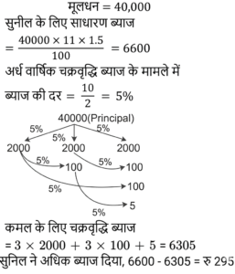 चक्रवृद्धि ब्याज Part-3Total Questions: 5021. चक्रवृद्धि ब्याज की किस वार्षिक दर पर ₹1,500 की धनराशि 2 वर्ष में बढ़कर ₹1,591.35 हो जाएगी ? [RRB NTPC 13/03/2021 (Evening)](a) 3% (b) 2% (c) 4% (d) 5%Correct Answer: (a) 3% Solution:22. ₹. 20,609 को A और B के बीच इस प्रकार विभाजित करें कि 7 वर्षों के बाद A की राशि (₹. में), 9 वर्ष बाद B की राशि (₹. में) के बराबर हो, यदि ब्याज 3% प्रतिवर्ष की दर से संयोजित किया जा रहा हो। [RRB NTPC 15/03/2021 (Morning)](a) A= Rs. 10,609, B= Rs. 10,000(b) A= Rs. 10,601, B= Rs. 10,000(c) A= Rs. 10,605, B= Rs. 10,100(d) A= Rs. 10,509, B= Rs. 10,004Correct Answer: (a) A= Rs. 10,609, B= Rs. 10,000Solution:23. सुनील और कमल ने एक साहूकार से 1 वर्ष 6 महीने के लिए 40,000 रुपये का ऋण लिया, जिसमें सुनील से 11% प्रति वर्ष साधारण ब्याज और कमल से 10% प्रति वर्ष चक्रवृद्धि ब्याज अर्ध-वार्षिक रूप से लिया। किसने अधिक ब्याज और कितनी राशि का भुगतान किया ? [RRB NTPC 15/03/2021 (Evening)](a) कमल ने 195 रुपये अधिक का भुगतान किया(b) सुनील ने 295 रुपये अधिक का भुगतान किया(c) उन्होंने समान ब्याज का भुगतान किया(d) कमल ने 305 रुपये और भुगतान कियाCorrect Answer: (b) सुनील ने 295 रुपये अधिक का भुगतान कियाSolution:24. 4,800 रुपये चक्रवृद्धि ब्याज की एक निश्चित दर पर 4 साल में 6,000 रुपये हो जाते हैं। चक्रवृद्धि ब्याज की समान दर पर 12 वर्ष बाद कितनी राशि होगी ? [RRB NTPC 21/03/2021 (Evening)](a) Rs. 12,000(b) Rs. 8,400(c) Rs. 9,600(d) Rs. 9,375Correct Answer: (d) Rs. 9,375Solution:25. एक कार का मूल्य 12% प्रति वर्ष की दर से मूल्यह्रास होता है। इसकी मौजूदा कीमत 7,74,400 रुपये है। 2 साल पहले कार का मूल्य क्या था ? [RRB NTPC 27/03/2021 (Evening)](a) Rs. 9,99,999(b) Rs. 11,00,000(c) Rs. 9,00,000(d) Rs. 10,00,000Correct Answer: (d) Rs. 10,00,000Solution:26. एक निश्चित वार्षिक चक्रवृद्धि ब्याज की दर पर निवेश की गई एक धनराशि का मिश्रधन 4 वर्ष में ₹729 और 7 वर्ष में ₹1,331 हो जाता है, जबकि ब्याज की गणना वार्षिक चक्रवृद्धि आधार पर की जाती है। वार्षिक ब्याज की दर ज्ञात कीजिए। [RRB NTPC 01/04/2021 (Evening)](a)(b)(c)(d)Correct Answer: (c)Solution:27. 5,000 रुपये पर 2 साल के लिए चक्रवृद्धि ब्याज 253.125 रुपये है। यदि समान राशि को समान अवधि के लिए समान साधारण ब्याज दर पर निवेश किया जाता है, तो ब्याज क्या होगा ? [RRB NTPC 01/04/2021 (Evening)](a) Rs.250(b) Rs.255(c) Rs.248(d) Rs.240Correct Answer: (a) Rs.250Solution:28. प्रति वर्ष किस दर पर, चक्रवृद्धि ब्याज 2 वर्षों में एक राशि का 9/4 गुना हो जाता है ? [RRB NTPC 03/04/2021 (Evening)](a) 50%(b) 35%(c) 60%(d) 40%Correct Answer: (a) 50%Solution:29. एक निश्चित राशि पर 5% प्रति वर्ष की दर से चक्रवृद्धि और साधारण ब्याज के बीच का अंतर 1 रुपये है। राशि है : [RRB NTPC 05/04/2021 (Morning)](a) Rs. 450(b) Rs. 550(c) Rs. 400(d) Rs. 500Correct Answer: (c) Rs. 400Solution:30. किस राशि पर 2 वर्ष के लिए 12½% प्रति वर्ष की दर से चक्रवृद्धि ब्याज 6,800 रुपये होगा ? [RRB NTPC 06/04/2021 (Evening)](a) Rs. 27,200(b) Rs. 27,260(c) Rs. 25,600(d) Rs. 54,400Correct Answer: (c) Rs. 25,600Solution:Submit Quiz« Previous12345Next »