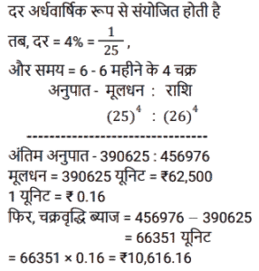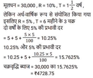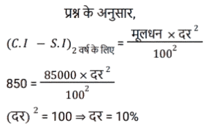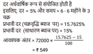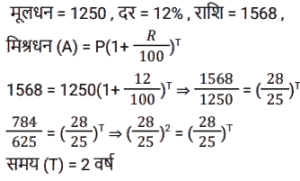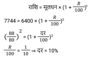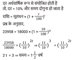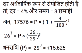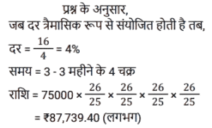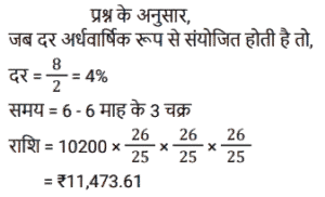 चक्रवृद्धि ब्याज (SSC) (Part-II)Total Questions: 5011. 2 वर्षों में ₹85,000 की धनराशि के लिए चक्रवृद्धि ब्याज (वार्षिक रूप से संयोजित) और साधारण ब्याज के बीच का अंतर ₹850 है। वार्षिक ब्याज की दर ज्ञात कीजिए। [SSC MTS 04/09/2023 (3rd Shift)](a) 5%(b) 10%(c) 8%(d) 12%Correct Answer: (b) 10%Solution:12. वार्षिक रूप से संयोजित 12% वार्षिक दर से ₹1,250 की धनराशि कितने वर्ष में ₹1,568 हो जाएगी ? [SSC MTS 05/09/2023 (1st Shift)](a) 4 वर्ष(b) 1 वर्ष(c) 2 वर्ष(d) 3 वर्षCorrect Answer: (c) 2 वर्षSolution:13. यदि ब्याज त्रैमासिक रूप से संयोजित किया जाता है, तो ₹75,000 की धनराशि 16% वार्षिक दर से एक वर्ष में कितनी हो जाएगी। (दशमलव के दो स्थानों तक सन्निकटित) [SSC MTS 05/09/2023 (2nd Shift)](a) ₹87,379.40(b) ₹89,773.40(c) ₹87,937.40(d) ₹87,739.40Correct Answer: (d) ₹87,739.40Solution:14. ₹ 18,000 की धनराशि अर्धवार्षिक रूप से संयोजित 20% की वार्षिक दर से कितने वर्षों में ₹23,958 हो जाएगी ? [SSC MTS 05/09/2023 (3rd Shift)](a) 1½(b) 3½(c) 1¼(d) 2½Correct Answer: (a) 1½Solution:15. ₹72,000 की धनराशि पर 1.5 वर्ष के लिए 10% वार्षिक दर से अर्धवार्षिक रूप से संयोजित चक्रवृद्धि ब्याज और समान धनराशि पर 5% वार्षिक दर से 3 वर्ष के लिए साधारण ब्याज के बीच का अंतर कितना होगा ? [SSC MTS 06/09/2023 (1st Shift)](a) ₹559(b) ₹549(c) ₹540(d) ₹449Correct Answer: (b) ₹549Solution:16. किस वार्षिक दर पर ₹6,400 की धनराशि पर 2 वर्षों में ₹1,344 का (वार्षिक रूप से संयोजित) चक्रवृद्धि ब्याज प्राप्त होगा ? [SSC MTS 06/09/2023 (3rd Shift)](a) 10%(b) 8%(c) 12%(d) 5%Correct Answer: (a) 10%Solution:17. 8% वार्षिक दर से निवेश की गई कितनी धनराशि 1½ वर्षों में, अर्ध वार्षिक रूप से संयोजित होकर ₹17,576 हो जाएगी ? [SSC MTS 06/09/2023 (3rd Shift)](a) ₹16,500(b) ₹15,000(c) ₹15,525(d) ₹15,625Correct Answer: (d) ₹15,625Solution:18. A ने ₹62,500 अर्धवार्षिक रूप से संयोजित 8% वार्षिक की दर पर जमा किए, तो दो वर्षों के अंत में चक्रवृद्धि ब्याज कितना होगा ? [SSC MTS 08/09/2023 (1st Shift)](a) ₹18,161.12(b) ₹12,171.72(c) ₹10,821.18(d) ₹10,616.16Correct Answer: (d) ₹10,616.16Solution:19. यदि ₹10,200 का 1½ वर्ष के लिए 8% वार्षिक चक्रवृद्धि ब्याज की दर से निवेश किया जाता है और जब ब्याज अर्धवार्षिक रूप से संयोजित होता है, तो परिपक्वता के बाद धनराशि ज्ञात कीजिए (दशमलव के दो स्थानों तक)। [SSC MTS 08/09/2023 (2nd Shift)](a) ₹11,743.61(b) ₹11,473.61(c) ₹11,764.28(d) ₹11,347.28Correct Answer: (b) ₹11,473.61Solution:20. ₹30,000 पर 10% वार्षिक दर से 1½ वर्ष का चक्रवृद्धि ब्याज कितना होगा, जब ब्याज अर्धवार्षिक रूप से संयोजित किया जाता है? [SSC MTS 08/09/2023 (3rd Shift)](a) ₹4,728.75(b) ₹4,800.75(c) ₹5,728.75(d) ₹4,928.75Correct Answer: (a) ₹4,728.75Solution:Submit Quiz« Previous12345Next »