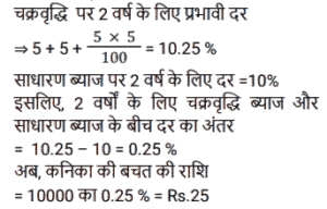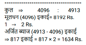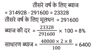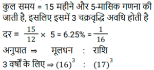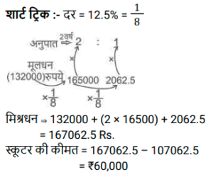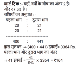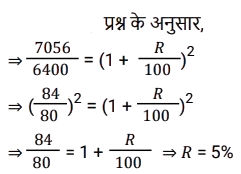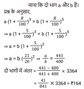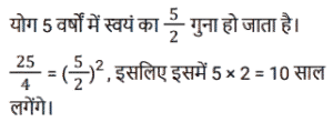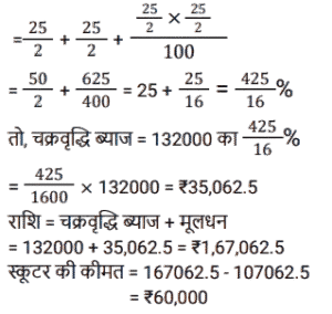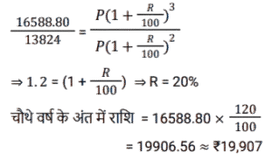 चक्रवृद्धि ब्याज (SSC) (Part-III)Total Questions: 5041. एक राशि चक्रवृद्धि ब्याज पर 4 वर्ष बाद ₹11,880 और 6 वर्ष बाद चक्रवृद्धि ब्याज पर ₹17,820 हो जाती है, यदि ब्याज को वार्षिक रूप से संयोजित किया जाता है। राशि का आधा (₹ में) क्या है ? [SSC CGL Tier II (29/01/2022)](a) 2,410(b) 2,640(c) 2,750(d) 2,530Correct Answer: (b) 2,640Solution:42. ब्याज की वार्षिक चक्रवृद्धि के आधार पर निवेशित ₹6,400 की राशि दो वर्षों में बढ़कर ₹7,056 हो जाती है तो ब्याज की प्रतिशत दर क्या है? [SSC MTS 05/10/2021 (Morning)](a) 6.25(b) 4(c) 7.5(d) 5Correct Answer: (d) 5Solution:43. ₹3,364 की राशि को दो भागों में इस प्रकार विभाजित किया जाता है कि क्रमशः 3 वर्ष और 5 वर्ष के बाद उन पर प्राप्त राशि समान होती है, जब ब्याज की दर 5% प्रति वर्ष होती है, जो वार्षिक रूप से संयोजित होती है। दो भागों के बीच का अंतर है: [SSC MTS 08/10/2021 (Evening)](a) ₹180(b) ₹166(c) ₹164(d) ₹160Correct Answer: (c) ₹164Solution:44. चक्रवृद्धि ब्याज पर निवेश की गई राशि 2 वर्षों में ₹13,824 और 3 वर्षों में ₹16,588.80 प्रति वर्ष एक निश्चित दर प्रतिशत पर हो जाती है, ब्याज वार्षिक रूप से संयोजित होता है। चौथे वर्ष के अंत में इसकी राशि कितनी होगी (रुपये के करीब) ? [SSC MTS 14/10/2021 (Evening)](a) ₹20,238(b) ₹18,248(c) ₹19,907(d) ₹18579Correct Answer: (c) ₹19,907Solution:45. एक किसान ने अपने खेत में खेती करने के लिए साहूकार से ₹1,32,000 उधार लिए। ब्याज दर 12.5% प्रति वर्ष वार्षिक रूप से संयोजित है। दो साल के अंत में, उसने ₹1,07,062.50 और अपने स्कूटर का भुगतान करके अपना कुल ऋण चुका दिया। स्कूटर की लागत (₹ में) है: [SSC MTS 20/10/2021 (Afternoon)](a) 50,000(b) 45,000(c) 75,000(d) 60,000Correct Answer: (d) 60,000Solution:46. यदि एक निश्चित राशि चक्रवृद्धि ब्याज पर 5 वर्षों में 2½ गुना हो जाती है, तो कितने वर्षों में यह समान वार्षिक ब्याज दर पर 6 ¼ गुना हो जाएगी ? [SSC MTS 22/10/2021 (Afternoon)](a) 9 वर्ष(b) 12 वर्ष(c) 8 वर्ष(d) 10 वर्षCorrect Answer: (d) 10 वर्षSolution:47. कनिका ने 5% प्रति वर्ष की दर से चक्रवृद्धि ब्याज पर 2 वर्ष के लिए ₹10,000 का ऋण लिया, ब्याज वार्षिक रूप से संयोजित होता है। यदि उसने साधारण ब्याज पर ऋण लिया होता तो वह कितने पैसे बचा लेती ? [SSC MTS 27/10/2021 (Morning)](a) ₹1,025(b) ₹1,000(c) ₹25(d) ₹400Correct Answer: (c) ₹25Solution:48. अमित 10% प्रति वर्ष की दर से ₹8,000 की राशि उधार लेता है। 4 साल के लिए चक्रवृद्धि ब्याज। वह पहले वर्ष के अंत में ₹2,800 और दूसरे वर्ष के अंत में ₹2,600 चुकाता है। ऋण चुकाने के लिए, उसे 4 साल बाद कितना भुगतान करना चाहिए, ब्याज वार्षिक रूप से संयोजित किया जा रहा है ? [SSC MTS 27/10/2021 (Afternoon)](a) ₹4,800(b) ₹4,880(c) ₹4,840(d) ₹4,780Correct Answer: (c) ₹4,840Solution:49. 8192 रुपये की राशि पर 1¼ वर्षों के लिए 15% प्रति वर्ष की दर से चक्रवृद्धि ब्याज (रुपये में) क्या है, यदि ब्याज 5-मासिक चक्रवृद्धि है ? [SSC CGL 13/08/2021 (Morning)](a) 1640(b) 1740(c) 1634(d) 1735Correct Answer: (c) 1634Solution:50. एक निश्चित राशि सालाना चक्रवृद्धि ब्याज पर 2 साल में 291600 रुपये और 3 साल में 314928 रुपये हो जाती है। 2 वर्ष के लिए समान दर पर 40,000 रुपये पर साधारण ब्याज (रु में) कितना होगा ? [SSC CGL 16/08/2021 (Evening)](a) 7500(b) 6400(c) 8000(d) 9600Correct Answer: (b) 6400Solution:Submit Quiz« Previous12345