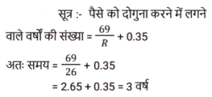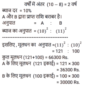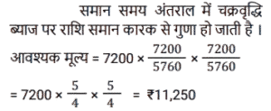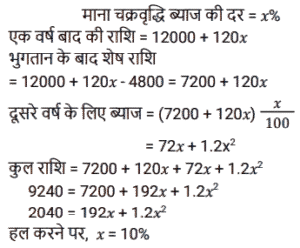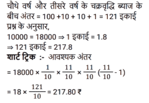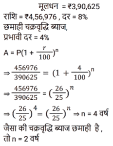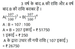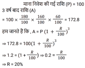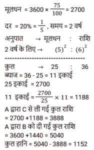 चक्रवृद्धि ब्याज (SSC)Total Questions: 5021. A, B से 2 वर्षों के लिए 20% साधारण ब्याज की दर से ₹3,600 की राशि उधार लेता है और इस राशि का 75% C को 20% चक्रवृद्धि ब्याज पर 2 वर्षों के लिए उधार देता है। A शेष राशि का उपयोग अपने निजी उद्देश्य के लिए करता है। A को हुई कुल हानि ज्ञात कीजिए। [SSC MTS 12/07/2022 (Afternoon)](a) ₹928(b) ₹852(c) ₹1,152(d) ₹1,024Correct Answer: (c) ₹1,152Solution:22. ₹3,90,625 की राशि 8% प्रति वर्ष की दर से कितने समय में ₹4,56,976 हो जाएगी, यदि ब्याज अर्ध-वार्षिक रूप से संयोजित किया जाता हो ? [SSC CHSL 08/06/2022 (Afternoon)](a) 2 वर्ष(b) 1½ वर्ष(c) 2½ वर्ष(d) 1 वर्षCorrect Answer: (a) 2 वर्षSolution:23. एक निश्चित राशि को 26% की वार्षिक ब्याज दर पर निवेश किया जाता है, जिस पर ब्याज वार्षिक रूप में चक्रवृद्धि होता है। यह राशि कितने वर्षों में दोगुनी हो जाएगी ? [SSC CHSL 01/06/2022 (Morning)](a) 4(b) 3(c) 2(d) 5Correct Answer: (b) 3Solution:24. ₹66,300 को A और B के बीच इस प्रकार विभाजित करें कि A को 8 वर्ष बाद प्राप्त होने वाली राशि, B को 10 वर्षों के बाद प्राप्त होने वाली राशि के बराबर हो यदि चक्रवृद्धि ब्याज में प्रतिवर्ष 10% की दर हो। [SSC CGL 20/04/2022 (Evening)](a) A = ₹35,520, B = ₹30,810(b) A = 35,200, B = ₹31,100(c) A = ₹37,000, B = ₹29,300(d) A = ₹36,300, B = ₹30,000Correct Answer: (d) A = ₹36,300, B = ₹30,000Solution:25. एक योजना में तीन वर्षों के लिए एक निश्चित राशि का निवेश किया गया था जिसमें ब्याज वार्षिक रूप से संयोजित होता है। पहले दो वर्षों के दौरान, योजना ने क्रमशः 80% और 60% की दर से वृद्धि प्रदान की, लेकिन तीसरे वर्ष के दौरान 40% की गिरावट आई। तीन वर्षों के लिए कुल ब्याज दर क्या थी ? [SSC MTS 12/10/2021 (Afternoon)](a) 24%(b) 20%(c) 22.5%(d) 48.6%Correct Answer: (b) 20%Solution:26. ₹5,760 की राशि प्रति वर्ष एक निश्चित दर प्रतिशत से 4 वर्षों में ₹7,200 और 12 वर्षों में ₹x हो जाती है, जबकि ब्याज दोनों मामलों में वार्षिक रूप से संयोजित होता है। x का मूल्य क्या है ? [SSC MTS 06/10/2021 (Evening)](a) 11500(b) 11250(c) 12500(d) 12250Correct Answer: (b) 11250Solution:27. अतुल ने 12000 रुपये की राशि उधार ली और प्रथम वर्ष के अंत में 4800 रु और दूसरे वर्ष के अंत में 9240 रु का भुगतान करके इसे चुकाने के लिए सहमत हुए। वार्षिक चक्रवृद्धि ब्याज की दर क्या है ? [SSC CGL 24/08/2021 (Afternoon)](a) 10%(b) 12%(c) 8/5%(d) 8%Correct Answer: (a) 10%Solution:28. A तथा B ने एक साथ 7% प्रति वर्ष की दर से ₹ 51,750 रुपये की राशि इस प्रकार उधार ली कि ऋण चुकता करने के लिए A ने उधार लेने वाले दिन से तीन वर्षों के बाद उतनी ही राशि का भुगतान किया जितनी राशि का भुगतान B ने 4 वर्षों के बाद किया। A के द्वारा उधार ली गयी राशि (रुपये में) है : [SSC CGL 05/03/2020 (Afternoon)](a) 25,000(b) 25,650(c) 24,860(d) 26,750Correct Answer: (d) 26,750Solution:29. एक निश्चित राशि 15% की वार्षिक ब्याज दर जिस पर ब्याज वार्षिक रूप में चक्रवृद्धि होता है, 2⅖ वर्षों में 4205.55 रुपये हो जाती है । [SSC CGL Tier II (13/09/2019)](a) 3,200(b) 3,500(c) 2,700(d) 3,000Correct Answer: (d) 3,000Solution:30. 18000 रुपये की राशि 10% प्रति वर्ष वार्षिक चक्रवृद्धि ब्याज पर उधार दी जाती है। तीसरे और चौथे वर्ष के चक्रवृद्धि ब्याज में अंतर ज्ञात करें। [SSC CGL Tier II (11/09/2019)](a) 220.60 रु(b) 217.80 रु(c) 221.80 रु(d) 215.40 रुCorrect Answer: (b) 217.80 रुSolution:Submit Quiz« Previous12345Next »
