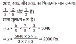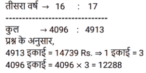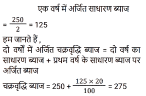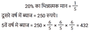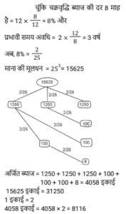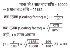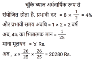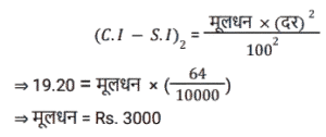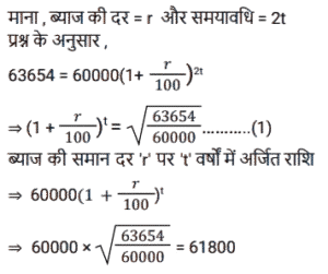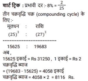 चक्रवृद्धि ब्याज (SSC)Total Questions: 5031. 31,250 रुपये की एक राशि पर 12% प्रति वर्ष की दर से 2 वर्षों का चक्रवृद्धि ब्याज ज्ञात करें, यदि ब्याज की चक्रवृद्धि 8 माह की है। [SSC CGL Tier II (11/09/2019)](a) ₹8106(b) ₹8116(c) ₹8016(d) ₹8156Correct Answer: (b) ₹8116Solution:32. यदि किसी राशि पर 8% प्रति वर्ष की दर से तीसरे वर्ष का चक्रवृद्धि ब्याज 3600 रुपये है, तो चौथे और पांचवें वर्ष में चक्रवृद्धि ब्याज के बीच अंतर ज्ञात करें। (किसी पूर्णांक के निकटतम रुपये में) [SSC MTS 22/08/2019 (Evening)](a) ₹304(b) ₹335(c) ₹288(d) ₹311Correct Answer: (d) ₹311Solution:33. 6.25% वार्षिक चक्रवृद्धि ब्याज की दर से 3 वर्ष में देय रु 14739 की राशि का आज का मान कितना है ? [SSC MTS 21/08/2019 (Evening)](a) Rs 12184(b) Rs 12288(c) Rs 12473(d) Rs 12148Correct Answer: (b) Rs 12288Solution:34. यदि ब्याज की दर प्रति वर्ष 20% चक्रवृद्धि वार्षिक है और किसी निश्चित राशि पर दूसरे वर्ष का ब्याज 250 रुपये है, तो पांचवें वर्ष में इस राशि पर ब्याज कितना होगा ? [SSC MTS 20/08/2019 (Morning)](a) ₹ 518(b) ₹400(c) ₹360(d) ₹432Correct Answer: (d) ₹432Solution:35. चक्रवृद्धि ब्याज (वार्षिक रूप से संयोजित) पर निवेश की गयी एक निश्चित राशि तीन वर्षों में 5040 रुपये तक बढ़ जाती है। यदि ब्याज की दर पहले वर्ष के लिए 20%, दूसरे वर्ष के लिए 40% और तीसरे वर्ष के लिए 50% है, तो यह राशि ज्ञात करें। [SSC MTS 07/08/2019 (Morning)](a) ₹1210(b) ₹2566(c) ₹1800(d) ₹2000Correct Answer: (d) ₹2000Solution:36. किसी निश्चित राशि पर 20% प्रतिवर्ष की ब्याज दर से दो वर्षों का साधारण ब्याज रु 250 है । समान ब्याज दर पर समान अवधि के लिए समान राशि पर चक्रवृद्धि ब्याज (वार्षिक रूप से संयोजित) कितनी है ? [SSC MTS 05/08/2019 (Evening)](a) ₹275(b) ₹900(c) ₹550(d) ₹750Correct Answer: (a) ₹275Solution:37. एक निश्चित राशि वार्षिक चक्रवृद्धि की किसी निश्चित दर पर निवेश की जाती है जो पांच वर्षों में बढ़ कर उतनी हो जाती है जो तीन वर्षों में इसमें हुई वृद्धि से 1.1881 अधिक का एक गुणक है। दर प्रतिशत ज्ञात करें। [SSC CHSL 04/07/2019 (Evening)](a) 9(b) 8.1(c) 8(d) 9.2Correct Answer: (a) 9Solution:38. एक निश्चित दर पर सम संख्या के वर्षों के लिए निवेश किये गए 60000 रुपये वार्षिक चक्रवृद्धि पर बढ़ कर 63,654 रुपये हो जाते हैं। यदि यह राशि आधी अवधि के लिए निवेश की जाए, तो यह बढ़ कर कितनी हो जाएगी ? [SSC CHSL 04/07/2019 (Afternoon)](a) Rs 61800(b) Rs 61809(c) Rs 61675(d) Rs 61827Correct Answer: (a) Rs 61800Solution:39. 8% प्रति वर्ष की दर से निवेश की गयी कोई राशि पहले वर्ष के अंत में 20280 रुपये हो जाती है, जब ब्याज की चक्रवृद्धि अर्धवार्षिक है। इस राशि पर पहले की तुलना में ब्याज की दोगुनी दर से 4⅗ वर्षों का साधारण ब्याज क्या होगा ? [SSC CHSL 04/07/2019 (Morning)](a) Rs 13500(b) Rs 13800(c) Rs 14200(d) Rs 14500Correct Answer: (b) Rs 13800Solution:40. 8% प्रति वर्ष की दर से x रुपये पर 2 वर्षों के चक्रवृद्धि ब्याज और साधारण ब्याज में 19.20 रुपये का अंतर है। x का मान क्या है ? [SSC CGL 10/06/2019 (Afternoon)](a) 2,500(b) 3,200(c) 2,800(d) 3,000Correct Answer: (d) 3,000Solution:Submit Quiz« Previous12345Next »