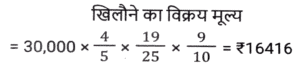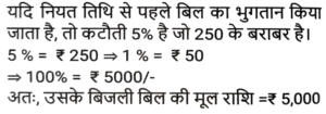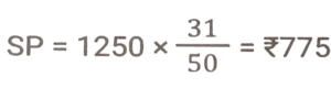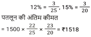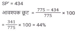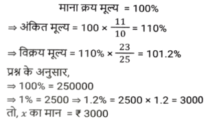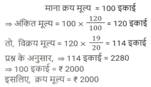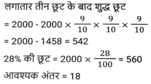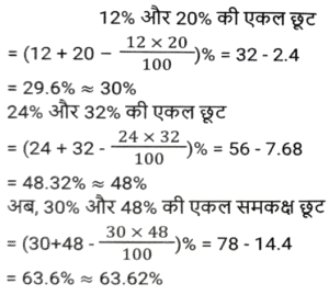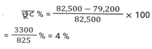 छूट/बट्टा (SSC) (Part-II)Total Questions: 5031. एक स्टोर में, ₹82,500 अंकित मूल्य वाली एक वस्तु बट्टाकृत मूल्य पर ₹79,200 में उपलब्ध है। उस वस्तु पर कितने प्रतिशत की छूट दी गई है [SSC CPO 27/06/2024 (3rd Shift)](a) 4%(b) 3%(c) 1%(d) 2%Correct Answer: (a) 4%Solution:32. एक दुकानदार ₹2,000 मूल्य वाले उत्पाद बेचना चाहता था। लेकिन उसके पास दो विकल्प थे, प्रत्येक 10% की तीन क्रमिक छूट देना या 28% की एकल छूट देना। छूट के दोनों विकल्पों में कितना अंतर था (₹ में) ? [SSC CPO 29/06/2024 (1st Shift)](a) 28(b) 18(c) 16(d) 22Correct Answer: (b) 18Solution:33. 12%, 20%, 24% और 32% की क्रमिक छूटों के बराबर एक एकल छूट ज्ञात कीजिए। (दशमलव के दो स्थानों तक शुद्ध) [Matriculation Level 20/06/2024 (Shift-1)](a) 43.41%(b) 73.71%(c) 63.62%(d) 53.51%Correct Answer: (c) 63.62%Solution:34. एक फैंसी खिलौने का अंकित मूल्य ₹ 30,000 है। इसे क्रमशः 20% और 24% की दो क्रमिक छूट देते हुए बेचा जाना है। नकद भुगतान करने पर कुल मूल्य पर 10% की अतिरिक्त छूट भी दी जाती है। खिलौने का विक्रय मूल्य (₹ में) कितना है ? [Matriculation Level 20/06/2024 (Shift-1)](a) 16416(b) 16520(c) 17280(d) 18350Correct Answer: (a) 16416Solution:35. एक पतलून की कीमत में पहले 12% की कमी की जाती है और फिर 15% की वृद्धि की जाती है। यदि पतलून की शुरुआती कीमत ₹1,500 थी, तो पतलून की अंतिम कीमत (₹ में) ज्ञात करें। [Matriculation Level 20/06/2024 (Shift-1)](a) 1,518(b) 1,581(c) 1,545(d) 1,554Correct Answer: (a) 1,518Solution:36. यदि नियत तारीख से पहले बिजली बिल का भुगतान किया जाता है, तो बिल की राशि पर 5% की छूट दी जाती है। नियत तारीख से पहले बिल का भुगतान करने पर एक व्यक्ति को ₹250 की छूट प्राप्त हुई। उसके बिजली बिल की मूल राशि (₹ में) कितनी थी ? [Matriculation Level 20/06/2024 (Shift-4)](a) 4000(b) 4500(c) 5000(d) 5500Correct Answer: (c) 5000Solution:37. वस्तुओं के स्टॉक को खाली करने के लिए एक विक्रेता अंकित मूल्य पर 8% की छूट देता है। वह ₹x इस छूट ऑफर के प्रचार पर खर्च करता है। उसकी वस्तुओं की कुल लागत ₹2,50,000 है और अंकित मूल्य लागत मूल्य से 10% अधिक है। अंत में उसे न तो लाभ और न ही हानि होती है। x का मान क्या है ? [Matriculation Level 21/06/2024 (Shift-1)](a) 6000(b) 4500(c) 3000(d) 7500Correct Answer: (c) 3000Solution:38. एक डीलर किसी वस्तु को अंकित मूल्य पर 5% की छूट देकर बेचता है। यदि अंकित मूल्य, क्रय मूल्य से 20% अधिक है और वस्तु ₹2,280 में बेची गई, तो क्रय मूल्य कितना होगा ? [Matriculation Level 21/06/2024 (Shift-1)](a) ₹2,500(b) ₹2,000(c) ₹3,500(d) ₹3,000Correct Answer: (b) ₹2,000Solution:39. छूट वाली एक योजना में Rs.1250 के अंकित मूल्य पर 38% की छूट है, लेकिन बिक्री केवल Rs.434 पर की जाती है, तो ग्राहक ने कितनी अतिरिक्त छूट प्राप्त की ? [Matriculation Level 21/06/2024 (Shift-4)](a) 48%(b) 40%(c) 58%(d) 44%Correct Answer: (d) 44%Solution:40. एक दुकानदार लैपटॉप की बिक्री पर पहले ₹275 की नकद छूट और फिर 10%, 8% और 5% की तीन क्रमिक छूट प्रदान करता है। यदि लैपटॉप का अंकित मूल्य ₹85,275 है, तो ग्राहक के लिए इसकी कीमत ज्ञात कीजिए। [Matriculation Level 24/06/2024 (Shift-1)](a) ₹65,561(b) ₹66,561(c) ₹65,861(d) ₹66,861Correct Answer: (d) ₹66,861Solution:Submit Quiz« Previous12345Next »