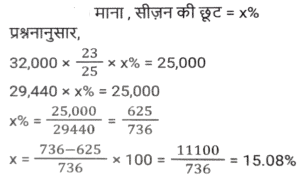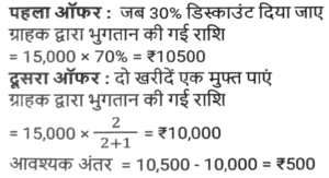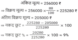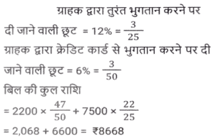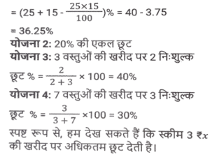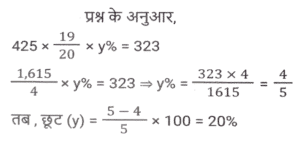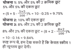 छूट/बट्टा (SSC) (Part-II)Total Questions: 5041. एक मनोरंजन पार्क अपने ग्राहकों को एक ऑफर देता है कि एक व्यक्ति को चार अन्य लोगों के साथ मुफ्त प्रवेश दिया जाएगा। मनोरंजन पार्क द्वारा दी गई प्रभावी प्रतिशत छूट कितनी है ? [Matriculation Level 24/06/2024 (Shift-1)](a) 14%(b) 18%(c) 20%(d) 16%Correct Answer: (c) 20%Solution:42. एक वस्तु का अंकित मूल्य ₹425 प्रति kg दिया गया। क्रमशः 5% और y% की दो क्रमिक छूट के बाद, खुदरा विक्रेता ने इसे ₹323 प्रति kg पर खरीदा। y का मान क्या था ? [Matriculation Level 24/06/2024 (Shift-4)](a) 19(b) 20(c) 24(d) 18Correct Answer: (b) 20Solution:43. एक दुकान ग्राहक द्वारा तुरंत भुगतान करने पर 12% की छूट और क्रेडिट कार्ड से खरीदारी करने पर 6% की छूट देने की योजना चला रहा है। योजना का लाभ भुगतान की राशि पर विभक्त किया जा सकता है, हालाँकि एक वस्तु पर केवल एक छूट दी जाएगी। किसी अन्य प्रकार के लेनदेन पर कोई छूट नहीं है। दुकान से अंकुर ने क्रेडिट कार्ड से एक शर्ट खरीदी, जिसका अंकित मूल्य ₹2,200 था और ₹7,500 अंकित मूल्य वाले कोट को खरीदने के लिए तुरंत भुगतान किया। बिल की कुल राशि (₹ में) क्या थी ? [Matriculation Level 25/06/2024 (Shift-1)](a) 8668(b) 8814(c) 8778(d) 8568Correct Answer: (a) 8668Solution:44. एक वस्तु की कीमत 15,000 रुपये है। ग्राहक या तो 30% छूट चुन सकता है या दो खरीदने पर एक मुफ्त ऑफर चुन सकता है। जीवन ने पहला ऑफर चुना और रक्षित ने दूसरा ऑफर चुना। किसी एक वस्तु के लिए उनके भुगतान में अंतर ज्ञात कीजिए। [Matriculation Level 25/06/2024 (Shift-1)](a) Rs.500(b) Rs.10,500(c) Rs.750(d) Rs.10,000Correct Answer: (a) Rs.500Solution:45. एक दुकानदार सभी खिलौनों पर 25% की छूट प्रदान करता है। वह उन ग्राहकों को कम की हुई कीमत पर 5% की अतिरिक्त छूट प्रदान करता है जो नकद भुगतान करते हैं। ₹510 के खिलौने के लिए एक ग्राहक को कितना (₹ में) नकद भुगतान करना होगा ? (दो दशमलव स्थानों तक सही) [Matriculation Level 26/06/2024 (Shift-1)](a) 360.38(b) 250.65(c) 363.38(d) 146.25Correct Answer: (c) 363.38Solution:46. एक मशीन पर ₹2,56,000 के अंकित मूल्य पर 12% की व्यापारिक छूट है, लेकिन नकद छूट देने के बाद मशीन को ₹2,05,000 में बेचा जाता है। यह नकद छूट (% में) कितनी है ? (निकटतम पूर्ण संख्या तक पूर्णांकित) [Higher Secondary 21/06/2024 (Shift-2)](a) 12%(b) 8%(c) 9%(d) 10%Correct Answer: (c) 9%Solution:47. एक दुकानदार ने एक वस्तु के अंकित मूल्य पर 17% की छूट की घोषणा की। यदि वस्तु का विक्रय मूल्य ₹1,245 है, तो वस्तु का अंकित मूल्य (₹ में) ___________ है। [Higher Secondary 25/06/2024 (Shift-4)](a) 1500(b) 1780(c) 1600(d) 1820Correct Answer: (a) 1500Solution:48. निम्नलिखित में से कौन सी योजना ₹x की खरीद पर अधिकतम छूट देगी ? [Graduate Level 20/06/2024 (Shift - 3)]1) 25% और 15% की 2 क्रमिक छूट 2) 20% की एकल छूट 3) 3 वस्तुओं की खरीद पर 2 वस्तुएं मुफ्त 4) 7 वस्तुओंकी खरीद पर 3 वस्तुएं मुफ्त(a) योजना 4(b) योजना 2(c) योजना 1(d) योजना 3Correct Answer: (d) योजना 3Solution:49. निम्नलिखित में से किस योजना में सबसे कम छूट मिलेगी ? [Graduate Level 21/06/2024 (Shift - 3)]1) 5% और 5% की 2 क्रमिक छूट 2) 10% की एकल छूट 3) 8% और 2% की 2 क्रमिक छूट(a) केवल योजना 2(b) योजना 1 और 3, दोनों(c) केवल योजना 1(d) केवल योजना 3Correct Answer: (c) केवल योजना 1Solution:50. एक वस्तु पर ₹32,000 के अंकित मूल्य पर 8% की छूट है। सीज़न की अतिरिक्त छूट 