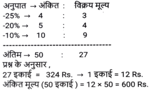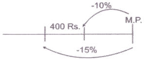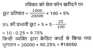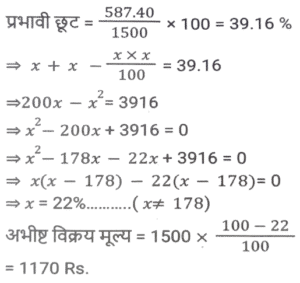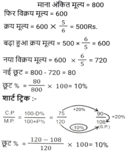 छूट/बट्टा (SSC)Total Questions: 5021. सुनील ने एक पंखा अंकित मूल्य पर 10% की छूट पर खरीदा। यदि उसने इसे 15% की छूट पर खरीदा होता, तो उसे ₹400 की बचत होती । पंखे का अंकित मूल्य ज्ञात कीजिए । [SSC CGL 02/12/2022 (3rd Shift)](a) ₹8,400(b) ₹7,500(c) ₹800(d) ₹8,000Correct Answer: (d) ₹8,000Solution:22. बिक्री प्रस्ताव के तहत, नकद में भुगतान किए अंकित मूल्य के हिस्से पर तनवीर को 32% छूट का प्रस्ताव दिया गया था, लेकिन क्रेडिट कार्ड के माध्यम से भुगतान किए गए अंकित मूल्य के हिस्से पर 1.2% जोड़ना पड़ा। यदि तनवीर ने अंकित मूल्य का 75% नकद और शेष क्रेडिट कार्ड के माध्यम से भुगतान किया, तो उसका कुल अंतिम भुगतान अंकित मूल्य का कितना प्रतिशत था ? [SSC CHSL 31/05/2022 (Evening)](a) 76.6%(b) 75.9%(c) 76.1%(d) 76.3%Correct Answer: (d) 76.3%Solution:23. एक सेल फोन की कीमत ₹20,000 है। रविवार को, दुकानदार सेल फोन की खरीद पर ₹1,000 की नकद छूट प्रदान करता है। इसके अलावा, अगर कोई इसे क्रेडिट कार्ड से खरीदता है, तो वह 5% अतिरिक्त छूट देता है। यदि कोई रविवार को क्रेडिट कार्ड से सेल फोन खरीद रहा है तो उसे कितना भुगतान करना होगा? [SSC CHSL 27/05/2022 (Afternoon)](a) ₹18,350(b) ₹18,900(c) ₹18,050(d) ₹18,500Correct Answer: (c) ₹18,050Solution:24. एक वस्तु का मूल्य x रुपये अंकित किया गया था तथा उसे (x - 40)% की छूट पर बेचा गया। यदि ग्राहक ने (x - 32) रुपये का भुगतान किया, तो उस वस्तु का अंकित मूल्य कितना था ? [SSC CHSL 14/10/2020 (Evening)](a) 75(b) 60(c) 80(d) 50Correct Answer: (c) 80Solution:25. एक डीलर एक वस्तु के अंकित मूल्य पर 25% की छूट देता है और 20% का लाभ प्राप्त करता है। यदि वस्तु के क्रय मूल्य में 20% की वृद्धि होती है, तो उसे अंकित मूल्य पर कितने प्रतिशत की छूट देनी चाहिए ताकि उसका लाभ प्रतिशत समान रहे ? [SSC CPO 13/12/2019 (Evening)](a) 8.5%(b) 10%(c) 12%(d) 7.25%Correct Answer: (b) 10%Solution:26. एक वस्तु का अंकित मूल्य 1500 रुपये है। यदि अंकित मूल्य पर x% की दो क्रमिक छूटें 587.40 रुपये की एकल छूट के बराबर है, तो वस्तु का विक्रय मूल्य ज्ञात करें यदि अंकित मूल्य पर x% की एकल छूट दी जाती है। [SSC CGL Tier II (13/09/2019)](a) Rs 1025(b) Rs 1155(c) Rs 1170(d) Rs 1200Correct Answer: (c) Rs 1170Solution:27. एक विक्रेता 20000 रुपये अंकित मूल्य वाली कोई वस्तु 20% और 5% की दो क्रमिक छूट पर खरीदता है। वह इसके मरम्मत पर 1000 रुपये खर्च करता है तथा इसे 20000 रुपये में बेच देता है। उसके लाभ या हानि का प्रतिशत (दशमलव के दो स्थान तक) ज्ञात करें। [SSC CHSL 08/07/2019 (Morning)](a) 25.64% लाभ(b) 23.64% हानि(c) 23.46% लाभ(d) 25.64% हानिCorrect Answer: (c) 23.46% लाभSolution:28. शर्ट पर 25% की छूट थी। एक महिला ने वह शर्ट ख़रीदा और उसे नकद में भुगतान करने के कारण 20% की अतिरिक्त छूट प्राप्त हुई तथा इसके बाद निष्ठावान ग्राहक होने के कारण उसे 10% की छूट और मिली। उसने 324 रुपये का भुगतान किया। इस शर्ट का अंकित मूल्य (रुपये में) ज्ञात करें। [SSC CHSL 05/07/2019 (Afternoon)](a) 650(b) 725(c) 600(d) 750Correct Answer: (c) 600Solution:29. एक वस्तु की कीमत क्रय मूल्य से कितनी अधिक होनी चाहिए ताकि इस पर 20% और 6.25% की दो क्रमिक छूट देने के बाद क्रय मूल्य पर 20% का कुल लाभ हो ? [SSC CGL 07/06/2019 (Evening)](a) 66 ⅔ %(b) 44 ¼ %(c) 50%(d) 60%Correct Answer: (d) 60%Solution:30. एक दुकानदार एक वस्तु को इसके 