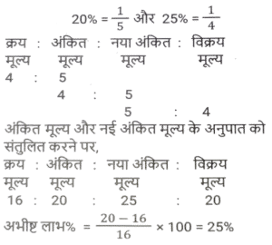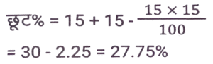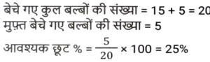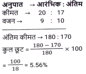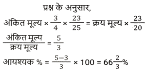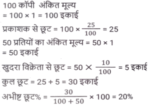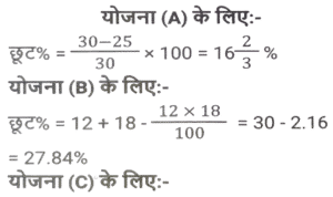 छूट/बट्टा (SSC)Total Questions: 5031. एक व्यापारी किसी वस्तु को इसके अंकित मूल्य से 20% की छूट पर खरीदता है और फिर इसका मूल्य अंकित मूल्य से 25% अधिक तय करता है। यदि वह नए अंकित मूल्य पर 20% की छूट देता है, तो उसके लाभ का प्रतिशत ज्ञात करें । [SSC CGL 07/06/2019 (Morning)](a) 24(b) 25(c) 20(d) 27Correct Answer: (b) 25Solution:32. एक व्यक्ति प्रकाशक से किसी पुस्तक की 100 प्रतियाँ खरीदता है और 25% की छूट प्राप्त करता है । वह खुदरा विक्रेता से 50 प्रतियाँ खरीदता है और 10% की छूट प्राप्त करता है। उसे कुल कितनी छूट प्राप्त हुई ? [SSC CGL 04/06/2019 (Evening)](a) 16.5%(b) 17.5%(c) 20%(d) 35%Correct Answer: (c) 20%Solution:33. किसी रेफ्रीजिरेटर का मूल्य 22,000 रुपये है । एक दुकानदार इसका मूल्य क्रय मूल्य से 15% अधिक निर्धारित करता है तथा 8% की छूट देता है। छूट की राशि है। [SSC CPO 15/03/2019 (Morning)](a) Rs.1960(b) Rs.1824(c) Rs. 1672(d) Rs.2024Correct Answer: (d) Rs.2024Solution:34. एक व्यापारी 25,000 रुपये से अधिक की खरीद पर 4%, 35000 रुपये से अधिक की खरीद पर 6% तथा 50,000 रुपये से अधिक की खरीद पर 8% की छूट देता है। यदि किसी वस्तु का मूल्य 38,500 रुपये अंकित किया गया है, तो छूट की राशि क्या होगी ? [SSC CPO 15/03/2019 (Morning)](a) Rs.3740(b) Rs.1810(c) Rs.3080(d) Rs.2310Correct Answer: (d) Rs.2310Solution:35. एक वस्तु का अंकित मूल्य ₹2,800 है। इसे 15%, 8% और 5% की तीन क्रमिक छूटों पर बेचा जाता है। वस्तु का विक्रय मूल्य (₹ में) ज्ञात कीजिए। [SSC CHSL Tier II (18/11/2024)](a) 1,923.56(b) 1,890.20(c) 2,080.12(d) 1,997.26Correct Answer: (c) 2,080.12Solution:36. पहले तीन वर्षों के दौरान एक इलेक्ट्रॉनिक मशीन के मूल्य में 5%, 10% और 15% की कमी हुई। तीन वर्ष बाद मशीन का मूल्य कितना होगा, यदि प्रारंभ में मशीन का मूल्य ₹8,000 था? [SSC CHSL Tier II (18/11/2024)](a) ₹ 5,000(b) ₹ 6,721(c) ₹ 7,000(d) ₹5,814Correct Answer: (d) ₹5,814Solution:37. एक खुदरा विक्रेता अपने उत्पादों के अंकित मूल्य पर 25% की व्यापार छूट और 8% की अतिरिक्त छूट देता है, यदि भुगतान उसकी दुकान के सदस्यता कार्ड (membership card) के साथ किया जाता है। वह लागत पर 15% का निवल लाभ अर्जित करता है। उसके द्वारा उत्पादों का अंकित मूल्य कितने प्रतिशत अधिक रखा गया है? [SSC MTS 01/10/2024 (Morning)](a) 66 ⅔ %(b) 84 ⅓ %(c) 59 ⅔ %(d) 46 ⅓ %Correct Answer: (a) 66 ⅔ %Solution:38. दिवाली के अवसर पर, इलेक्ट्रॉनिक्स दुकान की मालकिन, रजनी अपने ग्राहकों को एक छूट योजना प्रदान करती है कि 15 सजावटी बल्ब खरीदने पर उन्हें 5 सजावटी बल्ब मुफ्त मिलेंगे। रजनी द्वारा अपने ग्राहकों को दी गई प्रभावी प्रतिशत छूट कितनी है ? [SSC MTS 07/10/2024 (Evening)](a) 25%(b) 33%(c) 30%(d) 20%Correct Answer: (a) 25%Solution:39. एक दुकानदार छूट की निम्नलिखित तीन योजनाओं की घोषणा करता है। कौन-सी योजना ग्राहक के लिए सबसे अधिक लाभदायक है ? [SSC MTS 08/10/2024 (Afternoon)]A. 25 वस्तुएँ खरीदें और 30 समान वस्तुएँ प्राप्त करेंB. 12% और 18% की दो क्रमिक छूटC. 15% की दो समान क्रमिक छूट(a) A(b) B और C(c) केवल C(d) केवल BCorrect Answer: (d) केवल BSolution:40. एक व्यापारी 25 kg चावल ₹1,400 में बेचता है। एक ग्राहक 15% छूट की मांग करता है। दुकानदार इसके लिए सहमत हो जाता है लेकिन वह 1 kg के बजाय 10% कम चावल देता है। ग्राहक को मिलने वाली प्रभावी छूट क्या है (दशमलव के एक स्थान तक सही) ? [SSC MTS 15/10/