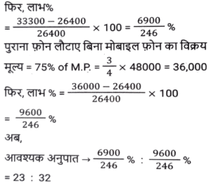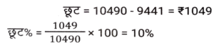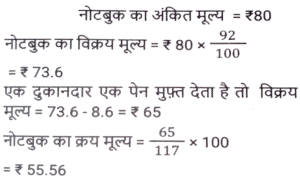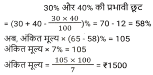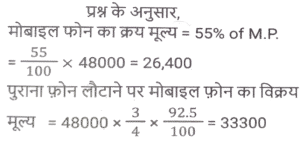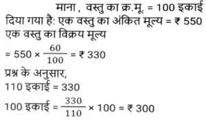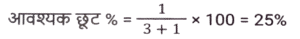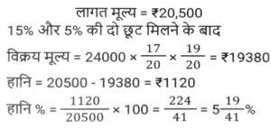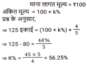 छूट/बट्टा (SSC)Total Questions: 5041. एक दुकानदार अपने माल पर उनके क्रय मूल्य से k% अधिक अंकित करता है। यदि दुकानदार 20% छूट देता है और फिर भी 25% का लाभ प्राप्त करता है, तो k का मान ज्ञात कीजिए। [SSC MTS 17/10/2024 (Evening)](a) 65.25%(b) 56.25%(c) 65.52%(d) 56.52%Correct Answer: (b) 56.25%Solution:42. एक दुकानदार ₹80 अंकित मूल्य वाली एक नोटबुक 8% की छूट पर बेचता है और प्रत्येक नोटबुक के साथ ₹8.60 मूल्य वाला एक पेन मुफ़्त में देता है। फिर भी उसे 17% का लाभ प्राप्त होता है। प्रत्येक नोटबुक का दो दशमलव स्थानों तक पूर्णांकित क्रय मूल्य ज्ञात कीजिए। [SSC MTS 18/10/2024 (Morning)](a) ₹49.75(b) ₹45.35(c) ₹55.56(d) ₹51.32Correct Answer: (c) ₹55.56Solution:43. एक दुकानदार एक ऑफर देता है तीन खरीदो, एक मुफ्त पाओ; इस योजना में दुकानदार द्वारा कितने प्रतिशत की छूट दी जा रही है ? [SSC MTS 18/10/2024 (Afternoon)](a) 33.33%(b) 30%(c) 20%(d) 25%Correct Answer: (d) 25%Solution:44. एक व्यापारी के लिए एक टेलीविजन का क्रय मूल्य ₹20,500 है। वह इसका अंकित मूल्य ₹24,000 निर्धारित करता है और 15% की छूट देता है। वह नकद भुगतान करने पर 5% की अतिरिक्त छूट भी देता है। उसका लाभ या हानि प्रतिशत ज्ञात कीजिए। [SSC MTS 22/10/2024 (Morning)](a) लाभ 5 ⁹⁄₄ %(b) हानि 5 ¼ %(c)लाभ 5 ¹⁹⁄₄₁ %(d) हानि 5 ¹⁹⁄₄₁ %Correct Answer: (d) हानि 5 ¹⁹⁄₄₁ %Solution:45. एक दुकानदार, एक वस्तु पर खरीदारों के लिए निम्नलिखित चार अलग-अलग छूट योजनाएं प्रदान करता है। यदि राजीव इस दुकान से न्यूनतम मूल्य पर वस्तु खरीदना चाहता है, तो उसे किस छूट योजना का चयन करना चाहिए ? [SSC MTS 23/10/2024 (Afternoon)]A. 8% की दो क्रमागत छूट B. 11% की छूट के बाद 5% की छूट C. 13% और 3% की क्रमागत छूट D. 16% की छूट(a) C(b) B(c) A(d) DCorrect Answer: (d) DSolution:46. एक खुदरा विक्रेता ₹48,000 अंकित मूल्य वाले मोबाइल फोन की बिक्री पर 25% की छूट की घोषणा करता है। मोबाइल फोन का क्रय मूल्य उसके अंकित मूल्य से 45% कम है। यदि खरीदार अपना पुराना मोबाइल फोन लौटाता है तो वह 7.5% की और छूट देता है। पुराने मोबाइल फोन लौटाने की योजना के साथ और पुराना मोबाइल फोन लौटाने की योजना के बिना खुदरा विक्रेता को होने वाले क्रमशः प्रतिशत लाभ का अनुपात ज्ञात करें। [SSC MTS 13/11/2024 (Morning)](a) 32:23(b) 12:11(c) 11:12(d) 23:32Correct Answer: (d) 23:32Solution:47. एक दुकान में दो प्रकार के प्रचार ऑफर दिए जा रहे हैं: तीन शर्ट खरीदें, एक शर्ट मुफ्त पाएँ, या अंकित मूल्य पर 25% की छूट। यदि कोई ग्राहक दोनों ऑफ़र का उपयोग करके पाँच शर्ट खरीदता है, तो उसे कुल मिलाकर कितनी छूट मिलेगी ? [SSC MTS 14/11/2024 (Evening)](a) 30%(b) 50%(c) 25%(d) 27.5%Correct Answer: (c) 25%Solution:48. एक वस्तु पर ₹550 अंकित है। यदि इसे 40% की छूट पर बेचा जाता है, तो विक्रय मूल्य इसके क्रय मूल्य से 10% अधिक हो जाता है। क्रय मूल्य (₹ में) ज्ञात करें। [SSC CGL 09/09/2024 (1st Shift)](a) 220(b) 330(c) 300(d) 200Correct Answer: (c) 300Solution:49. क्लीयरेंस सेल में, एक साड़ी जिसका अंकित मूल्य ₹10,490 था, अब ₹9,441 में बेची जाती है। साड़ी पर छूट प्रतिशत क्या है ? [SSC CGL 09/09/2024 (3rd Shift)](a) 10%(b) 15%(c) 18%(d) 12%Correct Answer: (a) 10%Solution:50. यदि अंकित मूल्य पर 65% की छूट और 30% और 40% की दो क्रमिक छूट के बाद विक्रय मूल्यों के बीच का अंतर ₹105 है, तो अंकि