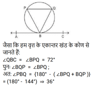 5. रेखा ABC, B पर एक वृत्त की स्पर्श रेखा है। यदि BP = BQ और ∠QBC = 72°, तो ∠PBQ का मान क्या है? [RRB NTPC 10/01/2021 (Morning)]