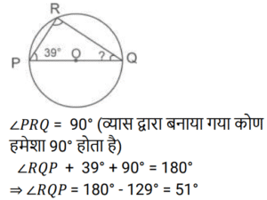 10. PQ एक वृत्त का व्यास है जिसका केंद्र O है। यदि बिंदु R वृत्त पर स्थित है और ∠RPO = 39° तो ∠RQP का माप क्या होगा? [RRB NTPC 12/01/2021 (Morning)]