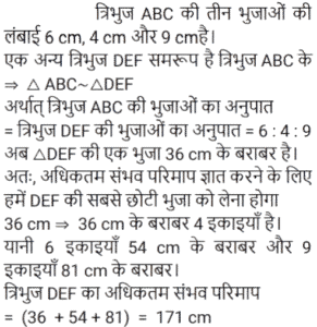 4. त्रिभुज ABC की तीन भुजाओं की लंबाई 6 सेमी, 4 सेमी और 9 सेमी है। एक अन्य त्रिभुज DEF जिसकी एक भुजा 36 सेमी है, त्रिभुज ABC के समरूप है। त्रिभुज DEF का अधिकतम संभव परिमाप क्या है? [RRB NTPC 10/01/2021 (Morning)]