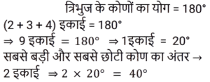 26. एक त्रिभुज में कोणों का अनुपात 2 : 3 : 4 है। सबसे बड़े और सबसे छोटे कोण के बीच का अंतर ज्ञात कीजिए। [RRB NTPC 30/01/2021 (Morning)]