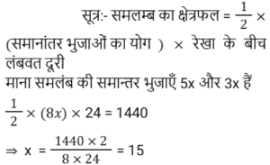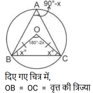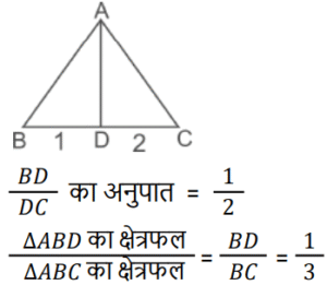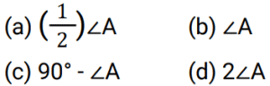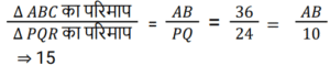 ज्यामिति Part-7Total Questions: 4711. दी गई आकृति में, ∠BAC + ∠OBC का माप बराबर है: [RRB NTPC 31/07/2021 (Morning)](a) 45°(b) निर्धारित नहीं किया जा सकता है(c) 90°(d) 60°Correct Answer: (c) 90°Solution:12. ABCD एक वर्ग है और Q इसके अंंतर्न में एक ऐसा बिंदु है कि ΔQAB समबाहु है। ∠QCB का माप है: [RRB NTPC 31/07/2021 (Morning)](a) 60° (b) 45° (c) 75°(d) 30°Correct Answer: (c) 75°Solution:13. यदि एक समकोण त्रिभुज, A पर समकोण है और AC = 6, BC = 10 है, तो tan B × tan C का मान ज्ञात कीजिए। [RRB JE 26/05/2019 (Afternoon)](a) 1/2 (b) 3/5 (c) 1(d) 4/5Correct Answer: (c) 1Solution:14. यदि 'O' एक त्रिभुज ABC का परिकेन्द्र है और OD, BC पर लंब है, तो कोण ∠BOD का मान ज्ञात कीजिए [RRB JE 27/05/2019 (Afternoon)](a)(b)(c)(d)Correct Answer: (b)Solution:15. D, त्रिभुज ABC की भुजा BC पर स्थित एक ऐसा बिंदु है, जहाँ BD = (1/2) DC। त्रिभुज ABD और त्रिभुज ABC के क्षेत्रफलों का अनुपात ज्ञात कीजिए। [RRB JE 30/05/2019 (Afternoon)](a) 1 : 3 (b) 3 : 1 (c) 3 : 2 (d) 2 : 3Correct Answer: (a) 1 : 3 Solution:16. समलम्ब चतुर्भुज की आकृति वाले एक खेत का क्षेत्रफल 1440 वर्ग मीटर है। समान्तर भुजाओं के बीच की लंबवत दूरी 24 मीटर है। लंबी समान्तर भुजाओं का अनुपात 5 : 3 है। लंबी समान्तर भुजा की लंबाई ज्ञात कीजिए। [RRB JE 30/05/2019 (Evening)](a) 30 मीटर (b) 60 मीटर (c) 45 मीटर (d) 75 मीटरCorrect Answer: (d) 75 मीटरSolution:17. ΔABC में, बिंदु D और E क्रमशः भुजाओं AB और AC पर इस प्रकार हैं कि DE ∥ BC और AD : DB = 3 : 1। यदि EA = 3.3 सेमी है, तो AC का मान ज्ञात कीजिए। [RRB JE 01/06/2019 (Afternoon)](a) 5.5 सेमी (b) 4 सेमी (c) 4.4 सेमी(d) 1.1 सेमीCorrect Answer: (c) 4.4 सेमीSolution:18. ΔABC की भुजाओं BC, CA, AB के मध्यबिंदु क्रमशः बिंदु D, E, F हैं। यदि ΔABC का क्षेत्रफल 20 वर्ग सेमी हो, तो समलम्ब चतुर्भुज FBCE का क्षेत्रफल क्या होगा? [RRB JE 02/06/2019 (Afternoon)](a) 10 वर्ग सेमी (b) 5 वर्ग सेमी (c) 15 वर्ग सेमी(d) 12 वर्ग सेमीCorrect Answer: (c) 15 वर्ग सेमीSolution:19. ΔABC में कोण B = 90°, AB = 5 सेमी। ΔABC का रचना संभव नहीं है। यदि BC ~ AC = ______। [RRB JE 02/06/2019 (Afternoon)](a) 2.5 सेमी (b) 4 सेमी (c) 6.5 सेमी(d) 4.8 सेमीCorrect Answer: (c) 6.5 सेमीSolution:20. ΔABC, ΔPQR के इस प्रकार समरूप हैं कि उनके परिमाप क्रमशः 36 और 24 हैं। यदि PQ = 10, तो AB का मान ज्ञात कीजिए। [RRB JE 26/06/2019 (Morning)](a) 15 (b) 16 (c) 20 (d) 18Correct Answer: (a) 15 Solution:Submit Quiz« Previous12345Next »