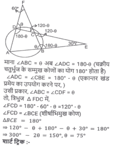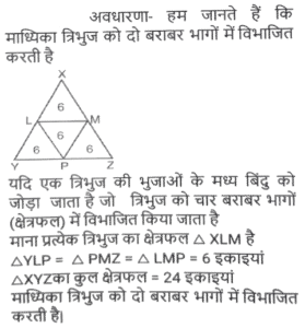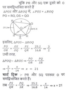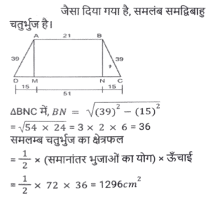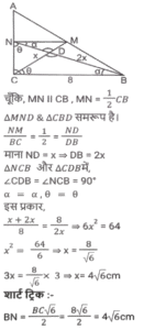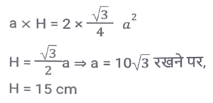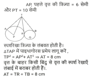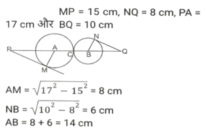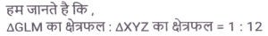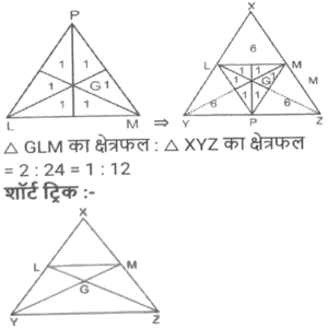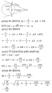 ज्यामिति (Part-II)Total Questions: 5021. XYZ एक त्रिभुज है। यदि माध्यिका ZL और YM एक-दूसरे को G पर प्रतिच्छेद करती हैं, तो (△GLM का क्षेत्रफल : △XYZ का क्षेत्रफल) ज्ञात कीजिए। [SSC CHSL 12/10/2020 (Afternoon)](a) 1:14(b) 1:12(c) 1:11(d) 1:10Correct Answer: (b) 1:12Solution:22. PA और PB वृत्त के स्पर्श रेखा हैं और 0 वृत्त का केंद्र है। त्रिज्या 5 सेमी और PO = 13 सेमी है। यदि त्रिभुज PAB का क्षेत्रफल M है, तो √M/15 का मान है: [SSC CHSL 18/03/2020 (Morning)](a) √24/13(b) 24/13(c) 12/13(d) √12/13Correct Answer: (b) 24/13Solution:23. दी गयी आकृति में, MP एक वृत्त की स्पर्श रेखा है जिसका केंद्र A है तथा NQ उस वृत्त की स्पर्श रेखा है जिसका केंद्र B है। यदि MP = 15 सेमी, NQ = 8 सेमी, PA = 17 सेमी तथा BQ = 10 सेमी है, तो AB का मान क्या होगा ? [SSC CGL 07/03/2020 (Morning)](a) 13.5 cm(b) 23 cm(c) 14 cm(d) 28 cmCorrect Answer: (c) 14 cmSolution:24. दी गयी आकृति में, दो वृत्त जिनके केंद्र P तथा Q हैं, वे एक-दूसरे को बाहर से R पर स्पर्श करते हैं। स्पर्श रेखाएँ AT तथा BT उभयनिष्ठ स्पर्श रेखा TR से T पर मिलती हैं। यदि AP = 6 सेमी तथा PT = 10 सेमी है, तो BT = ? [SSC CGL 05/03/2020 (Evening)](a) 6 cm(b) 12 cm(c) 8cm(d) 10 cmCorrect Answer: (c) 8cmSolution:25. PRT एक वृत्त, जिसका केंद्र O है, पर स्थित बिंदु R से जाने वाली स्पर्श रेखा है। वृत्त के व्यास SQ को बढ़ाया जाता है जो स्पर्श रेखा से P पर मिलता है तथा QR को मिलाया जाता है। यदि ∠QRP = 28° है, तो ∠SPR का मान क्या होगा ? [SSC CGL 04/03/2020 (Afternoon)](a) 29°(b) 34°(c) 62°(d) 32°Correct Answer: (b) 34°Solution:26. PQRS एक चक्रीय चतुर्भुज है जिसमें PQ = x सेमी, QR = 16.8 सेमी तथा RS = 14 सेमी एवं PS = 25.2 सेमी है । PR, QS को समद्विभाजित करता है। x का मान कितना है ? [SSC CGL 03/03/2020 (Afternoon)](a) 18(b) 21(c) 28(d) 24Correct Answer: (b) 21Solution:27. ∆ABC में, ∠C = 90°, M और N क्रमशः भुजा AB और AC के मध्य-बिंदु हैं। CM और BN एक दूसरे को D पर काटते हैं, और ∠BDC = 90° I यदि BC = 8 सेमी, तो BN की लंबाई है: [SSC CPO 13/12/2019 (Morning)](a) 6√3cm(b) 6√6cm(c) 4√6cm(d) 8√3cmCorrect Answer: (c) 4√6cmSolution:28. 10√3 सेमी भुजा वाले दो समबाहु त्रिभुज को जोड़कर एक चतुर्भुज बनाया जाता है। चतुर्भुज की ऊंचाई कितनी है? [SSC CPO 12/12/2019 (Evening)](a) 12cm(b) 14cm(c) 16 cm(d) 15cmCorrect Answer: (d) 15cmSolution:29. एक समलंब की समांतर भुजाओं की लंबाई 51 सेमी और 21 सेमी है, और अन्य दो भुजाओं में से प्रत्येक की लंबाई 39 सेमी है। समलम्ब चतुर्भुज का क्षेत्रफल (सेमी² में) क्या है? [SSC CPO 12/12/2019 (Morning)](a) 1206(b) 1296(c) 1152(d) 1260Correct Answer: (b) 1296Solution:30. ABCD एक चक्रीय चतुर्भुज है। भुजाएँ AB और DC को बढ़ाने पर, E पर मिलती हैं, और भुजाएँ BC और AD को बढ़ाने पर F पर मिलती हैं। यदि ∠BFA = 60° और ∠AED = 30° है, तो ∠ABC का माप है: [SSC CPO 12/12/2019 (Morning)](a) 65°(b) 75°(c) 70°(d) 80°Correct Answer: (b) 75°Solution:Submit Quiz« Previous12345Next »