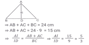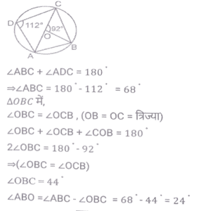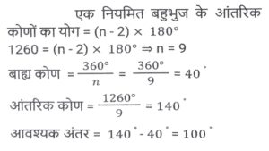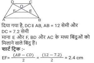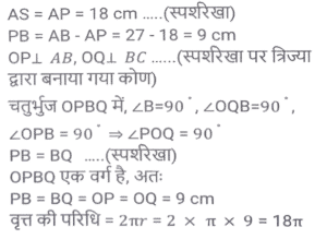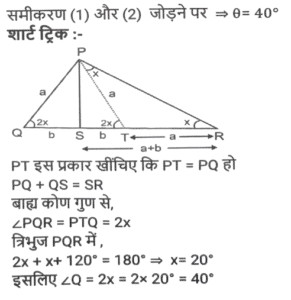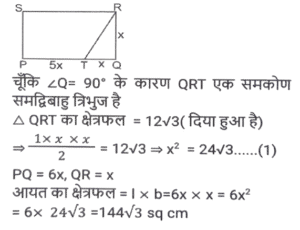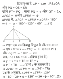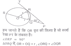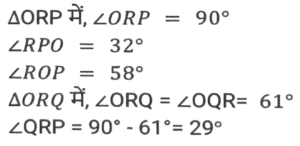 ज्यामिति (Part-II)Total Questions: 5031. PT केंद्र O वाले वृत्त के बिंदु R पर एक स्पर्श रेखा है। SQ व्यास है, जिसे बढ़ाने पर यह स्पर्श रेखा PT से P पर मिलता है। यदि ∠SPT = 32° है, तो कोण QRP का मान क्या होगा ? [SSC CPO 11/12/2019 (Morning)](a) 32°(b) 58°(c) 30°(d) 29°Correct Answer: (d) 29°Solution:32. PQRS एक आयत है। T, PQ पर ऐसा बिंदु है कि RTQ एक समद्विबाहु त्रिभुज बन जाता है तथा PT = 5QT है। यदि त्रिभुज RTQ का क्षेत्रफल 12√3 वर्ग सेमी है, तो आयत PQRS का क्षेत्रफल ज्ञात करें। [SSC CPO 09/12/2019 (Morning)](a) 142v3 cm²(b) 134√3 cm²(c) 144√3 cm²(d) 142 cm²Correct Answer: (c) 144√3 cm²Solution:33. यदि त्रिभुज PQR में, ∠P = 120°, S पर PS⊥ QR और PQ + QS = SR है, तो कोण Q का मान ज्ञात करें। [SSC CGL Tier II (13/09/2019)](a) 20°(b) 50°(c) 40°(d) 30°Correct Answer: (c) 40°Solution:34. एक वृत्त चतुर्भुज ABCD के भीतर स्थित है जो AB, BC, CD और AD को क्रमशः P, Q, R और S पर स्पर्श करता है और ∠B = 90° है। यदि AD = 24 सेमी, AB = 27 सेमी और DR = 6 सेमी है, तो वृत्त की परिधि ज्ञात करें। [SSC CGL Tier II (12/09/2019)](a) 20π(b) 18π(c) 15π(d) 12πCorrect Answer: (b) 18πSolution:35. एक सम बहुभुज के आतंरिक कोणों का योग 1260° है। इस बहुभुज के एक बाह्य तथा एक आतंरिक कोण में अंतर ज्ञात करें [SSC CGL Tier II (12/09/2019)](a) 105°(b) 100°(c) 120°(d) 90°Correct Answer: (b) 100°Solution:36. एक समलम्ब ABCD में, DC II AB, AB = 12 सेमी और DC = 7.2 सेमी है। इसके विकर्णों के मध्य बिंदुओं को जोड़ने वाली रेखाखंड की लंबाई ज्ञात करें । [SSC CGL Tier II (11/09/2019)](a) 2.6(b) 4.8(c) 2.4(d) 3.6Correct Answer: (c) 2.4Solution:37. यदि किसी सम बहुभुज का प्रत्येक आतंरिक कोण (128 4/7)° है, तो इसके विकर्णों की संख्या और इसकी भुजाओं की संख्या का योग ज्ञात करें । [SSC CGL Tier II (11/09/2019)](a) 15(b) 19(c) 17(d) 21Correct Answer: (d) 21Solution:38. एक चतुर्भुज ABCD किसी वृत्त के भीतर स्थित है जिसका केंद्र O है। यदि ∠BOC = 92° और ∠ADC = 112° है, तो ∠ABO ज्ञात करें। [SSC CHSL 11/07/2019 (Evening)](a) 22°(b) 24°(c) 28°(d) 26°Correct Answer: (b) 24°Solution:39. त्रिभुज ABC का परिमाप 24 सेमी है तथा इसकी भुजा BC = 9 सेमी है। AD, ∠BAC का कोण समद्विभाजक है जबकि। अंतः केंद्र है। AI : ID किसके बराबर है? [SSC CHSL 11/07/2019 (Afternoon)](a) 7:5(b) 5:2(c) 3:2(d) 5:3Correct Answer: (d) 5:3Solution:40. एक वृत्त के वृत्त खंड का क्षेत्रफल A है जिसका केंद्रीय कोण 60° है। इस वृत्त की परिधि C है। A किसके बराबर है ? [SSC CHSL 10/07/2019 (Evening)](a) c²/6π(b) c²/18π(c) c²/24π(d) c²/4πCorrect Answer: (c) c²/24πSolution:Submit Quiz« Previous12345Next »