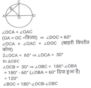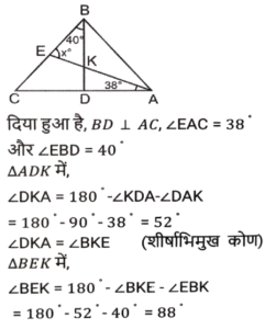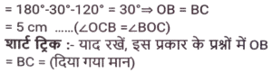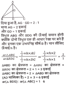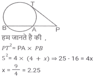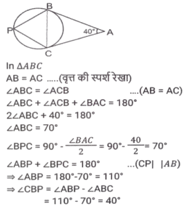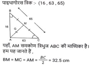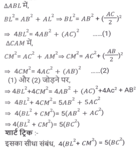 ज्यामिति (Part-III)Total Questions: 501. त्रिभुज △ABC में, BD, AC पर लम्ब है। E, BC पर स्थित ऐसा बिंदु है कि ∠BEA = x° है। यदि ∠EAC = 38° और ∠EBD = 40° है, तो x का मान क्या होगा ? [SSC CHSL 03/07/2019 (Morning)](a) 88°(b) 68°(c) 78°(d) 72°Correct Answer: (a) 88°Solution:2. एक वृत्त किसी चतुर्भुज ABCD के भीतर स्थित है जो भुजा AB, BC, CD तथा DA को क्रमशः P, Q, R और S पर स्पर्श करता है। यदि AS = 8 सेमी, BC = 11 सेमी और CR = 5 सेमी है, तो AB की लंबाई (सेमी में) ज्ञात करें। [SSC CHSL 02/07/2019 (Evening)](a) 12(b) 13(c) 16(d) 14Correct Answer: (d) 14Solution:3. △ABC में, ∠A = 90° है। यदि BL और CM मध्यिकाएं हैं, तो : [SSC CHSL 02/07/2019 (Evening)](a) 4(BL² + CM² ) = 3BC²(b) 4(BL² + CM² ) = 5BC²(c) 3(BL² + CM² ) = 4BC²(d) 5(BL² + CM² ) = 4BC²Correct Answer: (b) 4(BL² + CM² ) = 5BC²Solution:4. त्रिज्या 15 सेमी तथा 9 सेमी वाले दो संकेंद्री वृत्त हैं। बड़े वृत्त की जीवा की लंबाई (सेमी में) कितनी होगी जो छोटे वृत्त पर स्पर्श रेखा है ? [SSC CHSL 02/07/2019 (Morning)](a) 24(b) 18(c) 20(d) 25Correct Answer: (a) 24Solution:5. एक बिंदु A से एक वृत्त पर AB और AC स्पर्श रेखाएं इस प्रकार खींची जाती हैं कि ∠BAC = 40° है। BA के समानांतर एक जीवा CP खींची जाती है। ∠CBP का मान है: [SSC CHSL 01/07/2019 (Evening)](a) 55°(b) 45°(c) 35°(d) 40°Correct Answer: (d) 40°Solution:6. केंद्र O वाले एक वृत्त में, AD व्यास है तथा AC जीवा है। B, AC पर स्थित बिंदु है जो इस प्रकार है कि OB = 5 सेमी तथा ∠OBA = 60° है। यदि ∠DOC = 60° है, तो BC की लंबाई ज्ञात करें [SSC CHSL 01/07/2019 (Evening)](a) 4(b) 3√5(c) 5√3(d) 5Correct Answer: (d) 5Solution:7. एक वृत्त की जीवाएं AB और CD को जब बढ़ाया जाता है तो वे वृत्त के बाहर बिंदु P पर मिलती हैं। यदि AB = 6 सेमी, CD = 3 सेमी और PD = 5 सेमी है, तो PB का मान क्या होगा ? [SSC CGL 11/06/2019 (Morning)](a) 6 cm(b) 6.25 cm(c) 5 cm(d) 4 cmCorrect Answer: (d) 4 cmSolution:8. त्रिभुज ABC में, AB = 16 सेमी, AC = 63 सेमी, BC = 65 सेमी है। A से भुजा BC के मध्य बिंदु M तक एक सीधी रेखा AM खींची जाती है। AM की लंबाई (सेमी में) ज्ञात करें। [SSC CGL 10/06/2019 (Evening)](a) 32.5(b) 24.5(c) 23.5(d) 31.5Correct Answer: (a) 32.5Solution:9. त्रिभुज ABC में, AD माध्यिका है तथा G, AD पर ऐसा बिंदु है कि AG: GD = 2:1 है, तो ar(Δ BDG) : (Δ ABC) का मान ज्ञात करें। [SSC CGL 10/06/2019 (Afternoon)](a) 1:4(b) 1:9(c) 1:6(d) 1:3Correct Answer: (c) 1:6Solution:10. वृत्त के बाहर एक बिंदु P से, PAB एक छेदक रेखा तथा PT वृत्त की एक स्पर्श रेखा है एवं A, B और T वृत्त पर स्थित बिंदु हैं। यदि PT = 5 सेमी, PA = 4 सेमी तथा AB = x सेमी है, तो x का मान किसके बराबर होगा ? [SSC CGL 10/06/2019 (Afternoon)](a) 2.25(b) 2.75(c) 2.45(d) 1.75Correct Answer: (a) 2.25Solution:Submit Quiz12345Next »