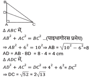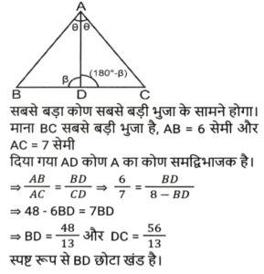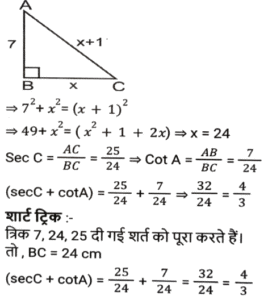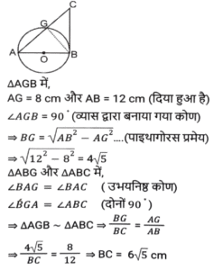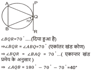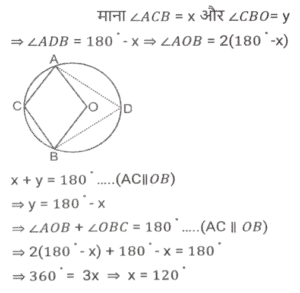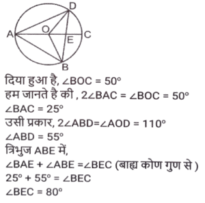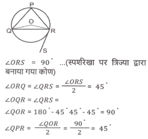 ज्यामिति (Part-III)Total Questions: 5011. माना कि O एक वृत्त का केंद्र है तथा AC इसका व्यास है। BD एक जीवा है जो AC को E पर काटती है। बिंदु A को B और D पर मिलाया जाता है। यदि ∠BOC = 50° और ∠AOD = 110° है, तो ∠BEC = ? [SSC CGL 10/06/2019 (Morning)](a) 80°(b) 70°(c) 55°(d) 90°Correct Answer: (a) 80°Solution:12. त्रिभुज ABC में, जिसमें B समकोण है, AB = 7 सेमी और (AC - BC) = 1 सेमी है। (secC + cotA) का मान ज्ञात करें। [SSC CGL 10/06/2019 (Morning)](a) 19/24(b) 4/3(c) 3/4(d) 1Correct Answer: (b) 4/3Solution:13. केंद्र O वाले एक वृत्त में, PQR इस पर स्थित बिंदु Q पर एक स्पर्श रेखा है। AB वृत्त में एक जीवा है जो स्पर्श रेखा से इस प्रकार समानांतर है कि ∠BQR = 70° है । ∠AQB का मान ज्ञात करें । [SSC CGL 07/06/2019 (Evening)](a) 40°(b) 60°(c) 55°(d) 35°Correct Answer: (a) 40°Solution:14. एक समद्विबाहु त्रिभुज का आधार तथा उसकी ऊंचाई क्रमशः 10 सेमी और 12 सेमी है। प्रत्येक बराबर भुजा की लंबाई (सेमी में) ज्ञात करें। [SSC CGL 07/06/2019 (Evening)](a) 10(b) 7.5(c) 8.5(d) 13Correct Answer: (d) 13Solution:15. ABCD एक चतुर्भुज है जिसकी भुजा AB, A, B, C और D से गुजरने वाले वृत्त का व्यास है। यदि ∠ADC = 130° है, तो कोण BAC का मान ज्ञात करें : [SSC CGL 07/06/2019 (Afternoon)](a) 40°(b) 45°(c) 35°(d) 50°Correct Answer: (a) 40°Solution:16. त्रिभुज ABC में, कोण A समकोण है। AC और BC की लंबाई क्रमशः 6 सेमी और 10 सेमी है। बिंदु D, AB पर इस प्रकार स्थित है कि BD = 4 सेमी है। CD की लंबाई (सेमी में) ज्ञात करें । [ SSC CGL 07/06/2019 (Afternoon)](a) 2√13(b) 3√10(c) 2√10(d) 3√13Correct Answer: (a) 2√13Solution:17. AB एक वृत्त का व्यास है जिसका केंद्र O है। CB, B पर वृत्त की स्पर्श रेखा है। AC, वृत्त को G पर काटती है है। यदि वृत्त की त्रिज्या 6 सेमी है तथा AG = 8 सेमी है, तो BC की लंबाई ज्ञात करें। [SSC CGL 07/06/2019 (Morning)](a) 2√5(b) 6√6(c) 2√6(d) 6√5Correct Answer: (d) 6√5Solution:18. केंद्र O वाले एक वृत्त में, ACBO एक समानांतर चतुर्भुज है जिसमें C छोटी चाप AB पर स्थित एक बिंदु है। कोण AOB का मान ज्ञात करें। [SSC CGL 06/06/2019 (Afternoon)](a) 150°(b) 100°(c) 110°(d) 120°Correct Answer: (d) 120°Solution:19. त्रिभुज PQR के शीर्ष बिंदु एक वृत्त पर अवस्थित हैं जिसका केंद्र O है। SR बिंदु R पर वृत्त की स्पर्श रेखा है। यदि QR, ∠ORS को द्विभाजित करता है, तो कोण RPQ का माप ज्ञात करें। [SSC CGL 06/06/2019 (Afternoon)](a) 60°(b) 45°(c) 40°(d) 30°Correct Answer: (b) 45°Solution:20. त्रिभुज ABC में, जिसकी भुजाएं 6 सेमी, 7 सेमी और 8 सेमी की हैं, सबसे बड़े कोण का कोण समद्विभाजक सामने की भुजा को दो खंड में विभाजित करता है। छोटे खंड की लंबाई ज्ञात करें [SSC CGL 06/06/2019 (Afternoon)](a) 24/5(b) 21/5(c) 48/13(d) 56/13Correct Answer: (c) 48/13Solution:Submit Quiz« Previous12345Next »