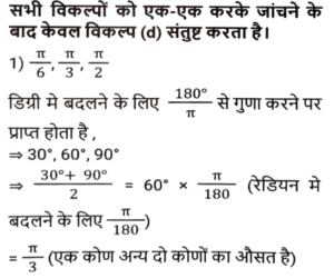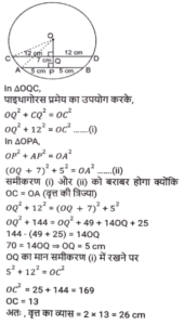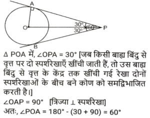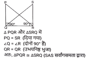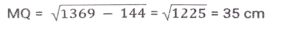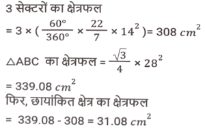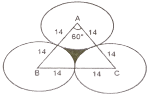 ज्यामिति (Part-III)Total Questions: 5041. यदि एक समबाहु त्रिभुज की दो भुजाओं का योग 16 cm है, तो तीसरी भुजा ज्ञात कीजिए। [SSC CGL 09/09/2024 (1st Shift)](a) 1.4 cm(b) 16 cm(c) ज्ञात नहीं किया जा सकता है(d) 8 cmCorrect Answer: (d) 8 cmSolution:माना, समबाहु त्रिभुज की भुजा = xप्रश्न के अनुसार,2x = 16 ⇒ x = 8 सेमीहम जानते हैं कि एक समबाहु त्रिभुज की सभी भुजाएँ एक दूसरे के बराबर होती हैं इसलिए तीसरी भुजा 8 सेमी होगी।42. मान लीजिए कि, O वृत्त का केंद्र है और AB और CD, त्रिज्या की समान भुजा पर दो समानांतर जीवाएं हैं। OP, AB के लंबवत है और OQ, CD के लंबवत है। यदि AB = 10 cm है, CD = 24 cm और PQ = 7 cm है, तो वृत्त का व्यास (cm में) _________ होगा। [SSC CGL 09/09/2024 (1st Shift)](a) 26(b) 13(c) 12(d) 24Correct Answer: (a) 26Solution:43. 22 cm और 10 cm त्रिज्या वाले दो वृत्तों के केंद्रों के बीच की दूरी 37 cm है। यदि इन वृत्तों की सीधी उभयनिष्ठ अनुस्पर्श रेखा के स्पर्श बिंदु (points of contact) M और Q हैं, तो रेखाखंड MQ की लंबाई ज्ञात कीजिए। [SSC CGL 09/09/2024 (1st Shift)](a) 35 cm(b) 39 cm(c) 29 cm(d) 25 cmCorrect Answer: (a) 35 cmSolution:44. बिंदु P और S रेखा खंड QR के एक ही ओर इस प्रकार हैं कि ∠PQR = 90°, <SRQ = 90° और PQ = SR है। सही कथन का चयन कीजिए। [SSC CGL 09/09/2024 (2nd Shift)](a) ΔPQR ≅ ΔSRQ RHS द्वारा(b) ΔPQR ≅ ΔSQR SAS द्वारा(c) ΔPQR ≅ ΔSQR RHS द्वारा(d) ΔPQR ≅ ΔSRQ SAS द्वाराCorrect Answer: (d) ΔPQR ≅ ΔSRQ SAS द्वाराSolution:45. त्रिभुज के कोण इस प्रकार हैं कि एक कोण अन्य दो कोणों का औसत है, तो कोण निम्नलिखित में से कौन-से होंगे ? [SSC CGL 09/09/2024 (2nd Shift)](a) 4(b) 3(c) 2(d) 1Correct Answer: (d) 1Solution:46. मान लीजिए C एक वृत्त है जिसका केंद्र O है और P, C का एक बाह्य बिंदु है। मान लीजिए PA और PB, C की दो स्पर्शरखाएं हैं तथा A और B क्रमशः स्पर्शिता बिंदु (points of tangency) हैं। यदि PA और PB एक दूसरे से 60° के कोण पर आनत हैं, तो ∠POA ज्ञात कीजिए। [SSC CGL 09/09/2024 (2nd Shift)](a) 40°(b) 60°(c) 80°(c) 80°Correct Answer: (b) 60°Solution:47. दो त्रिभुज EFG और HIJ सर्वांगसम हैं। यदि ΔEFG का क्षेत्रफल 124 cm² है, तो AHIJ का क्षेत्रफल कितना होगा? [SSC CGL 09/09/2024 (3rd Shift)](a) 124 cm²(b) 248 cm²(c) 62 cm²(d) 31 cm²Correct Answer: (a) 124 cm²Solution:अवधारणाः सर्वांगसम त्रिभुजों का क्षेत्रफल सदैव समान होता है।अतः, arΔHIJ = arΔEFG = 124 cm²48. निम्नलिखित में से किस मानदंड को लागू करने से दो त्रिभुजों को सर्वांगसम सिद्ध नहीं किया जा सकता है? [SSC CGL 10/09/2024 (1st Shift)](a) कोण-भुजा-कोण(b) कोण-कोण-कोण(c) भुजा-भुजा-भुजा(d) भुजा-कोण-भुजाCorrect Answer: (b) कोण-कोण-कोणSolution:सर्वांगसमता कोण-कोण-कोण (AAA) मानदंड लागू करने पर, दो त्रिभुजों को कभी भी सर्वांगसम सिद्ध नहीं किया जा सकता49. 18 cm और 12 cm त्रिज्या वाले दो वृत्त एक दूसरे को बाह्य रूप से स्पर्श करते हैं। उनकी सीधी उभयनिष्ठ स्पर्शरखा की लंबाई (cm में) ज्ञात कीजिए। [SSC CGL 10/09/2024 (1st Shift)](a) 15√6(b) 10√6(c) 12√6(d) 18√6Correct Answer: (c) 12√6Solution:50. एक समबाहु त्रिभुज की भुजा 28 cm है। प्रत्येक शीर्ष को केंद्र मानकर, त्रिभुज की भुजा की आधी लंबाई के बराबर त्रिज्या वाले एक वृत्त को चित्रित किया गया है। त्रिभुज के उस भाग का क्षेत्रफल ज्ञात कीजिए, जो वृत्त में शामिल नहीं है (π = 22/7 और √3 = 1.73 का उपयोग कीजिए)। [SSC CGL 10/09/2024 (1st Shift)](a) 30.89 cm²(b) 38.08 cm²(c) 31.08 cm²(d) 39.08 cm²Correct Answer: (c) 31.0