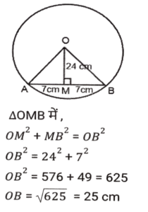 2. यदि किसी वृत्त में 14 cm लंबाई की एक जीवा इसके केंद्र से 24 cm की दूरी पर है, तो वृत्त की त्रिज्या की लंबाई ज्ञात कीजिए। [SSC CGL 23/09/2024 (3rd Shift)]