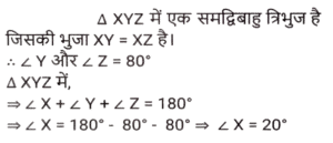 5. त्रिभुज XYZ एक समद्विबाहु त्रिभुज है जिसकी भुजाएँ XY = XZ हैं। यदि कोण Y की माप 80° है, तो कोण X की माप क्या है? [SSC CGL 24/09/2024 (1st Shift)]