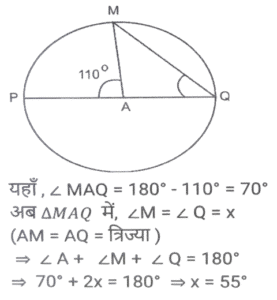 6. PQ, केंद्र A वाले एक वृत्त का व्यास है। M, वृत्त की परिधि पर एक बिंदु है। यदि m∠MAP = 110°, तो m∠MQA का मान ज्ञात कीजिए। [SSC CGL 24/09/2024 (1st Shift)]