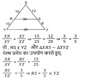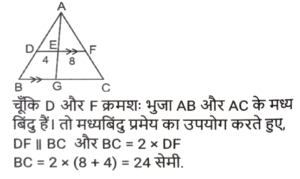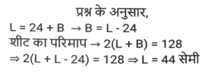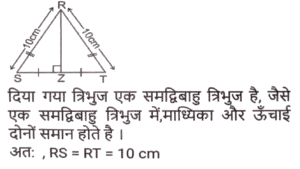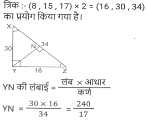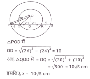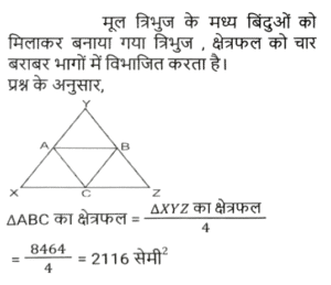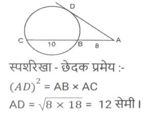 ज्यामिति (Part-IX)Total Questions: 5031. ΔABC में, D और F क्रमशः भुजा AB और AC के मध्य बिंदु हैं। E रेखाखंड DF पर एक ऐसा बिंदु है कि DE : EF = 1 : 2 है। यदि DE = 4 cm है, तो BC इनमें से किसके बराबर है? [Graduate Level 27/06/2023 (Shift - 4)](a) 20 cm(b) 26 cm(c) 22 cm(d) 24 cmCorrect Answer: (d) 24 cmSolution:32. R और S क्रमशः ΔXYZ की भुजाओं XY और XZ के बिंदु हैं। साथ ही, XR = 15 cm, XY = 25 cm, XS = 12 cm और XZ = 20 cm है। RS ____________ के बराबर है [Graduate Level 27/06/2023 (Shift - 4)](a) 2/5 YZ(b) 5/3 YZ(c) 3/5 YZ(d) 3/4 YZCorrect Answer: (c) 3/5 YZSolution:33. मान लें कि A, B, C, ΔXYZ की भुजाओं क्रमश: XY, YZ और XZ के मध्य-बिंदु हैं। यदि ΔXYZ का क्षेत्रफल 8464 cm² है, तो ΔABC का क्षेत्रफल ("cm²" में) ज्ञात करें। [Higher Secondary 27/06/2023 (Shift - 3)](a) 2116(b) 1812(c) 1516(d) 3112Correct Answer: (a) 2116Solution:34. यदि त्रिज्याओं का योग और दो वृत्तों के केंद्रों के बीच की दूरी बराबर हो, तो : [SSC CHSL Tier II (26/06/2023)](a) वृत्त संकेंद्रिक होते हैं।(b) वृत्त बाहरी रूप से स्पर्श करते हैं।(c) वृत्त आंतरिक रूप से स्पर्श करते हैं।(d) वृत्त एक दूसरे को काटते हैं।Correct Answer: (b) वृत्त बाहरी रूप से स्पर्श करते हैं।Solution:35. AD एक वृत्त की स्पर्श रेखा है और ABC एक छेदक रेखा है। यदि AB = 8 cm और BC = 10 cm है, तो AD की लंबाई ज्ञात कीजिए । [SSC CHSL Tier II (26/06/2023)](a) 144 cm(b) 12.5 cm(c) 13.45 cm(d) 12 cmCorrect Answer: (d) 12 cmSolution:36. किसी वृत्त के केंद्र पर एक जीवा xy द्वारा अंतरित कोण 180 डिग्री है। यदि जीवा की लंबाई 36 सेमी है, तो इस वृत्त की त्रिज्या कितनी होगी ? [SSC CHSL 09/03/2023 (1st Shift)](a) 24 cm(b) 18 cm(c) 27 cm(d) 21 cmCorrect Answer: (b) 18 cmSolution:37. दो संकेंद्रित वृत्तों की त्रिज्याएँ x cm और 26 सेमी हैं। P और S बड़े वृत्त पर बिंदु है और Q और R छोटे वृत्त पर बिंदु हैं। यदि PQRS एक सीधी रेखा है और QR = 40 सेमी और PS = 48 सेमी है, तो x का मान क्या है? (x < 26 cm) [SSC CHSL 09/03/2023 (4th Shift)](a) 11√5 सेमी(b) 10√5 सेमी(c) 12√5 सेमी(d) 9√5 सेमीCorrect Answer: (b) 10√5 सेमीSolution:38. △XYZ में, ∠Y = 90 डिग्री और YN, XZ के लंबवत है। यदि XY = 30 सेमी और xz = 34 सेमी तो YN का मान क्या है? [SSC CHSL 09/03/2023 (4th Shift)](a) 280/17 सेमी(b) 210/17 सेमी(c) 220/17 सेमी(d) 240/17 सेमीCorrect Answer: (d) 240/17 सेमीSolution:39. किसी △RST में, भुजा ST पर Z एक बिंदु है और SZ = ZT है। यदि ∠RSZ = 90° और RS = 10 सेमी है, तो RT का मान क्या है? [SSC CHSL 09/03/2023 (4th Shift)](a) 15 सेमी(b) 10 सेमी(c) 8 सेमी(d) 12 सेमीCorrect Answer: (b) 10 सेमीSolution:40. एक आयताकार कागज़ की लंबाई उसकी चौड़ाई से 24 cm अधिक है और उसका परिमाप 128 cm है। इस कागज़ की लंबाई ज्ञात कीजिए। [SSC CHSL 10/03/2023 (2nd Shift)](b) 44 cm(a) 20 cm(c) 48 cm(d) 34 cmCorrect Answer: (b) 44 cmSolution:Submit Quiz« Previous12345Next »