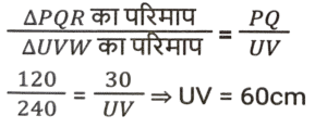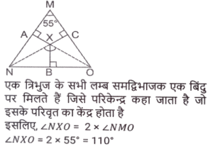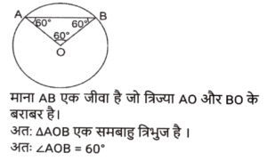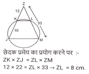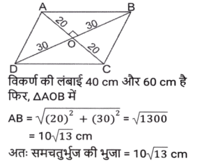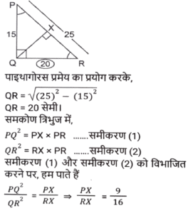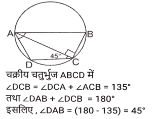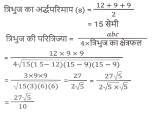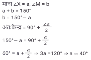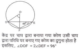 ज्यामिति (Part-IX)Total Questions: 5041. एक त्रिभुज की भुजाएँ 12 cm, 9 cm और 9 cm हैं। इस त्रिभुज के परिवृत्त की त्रिज्या कितनी है ? [SSC CHSL 10/03/2023 (3rd Shift)](a) 181/√5(b) 27/√5(c) 27√5/10(d) 54/√5Correct Answer: (c) 27√5/10Solution:42. सभी बिंदु D, E और F, O केंद्र वाले एक वृत की परिधि पर स्थित हैं। यदि कोण DEF= 48° है, तो कोण DOF का संभावित मान कितना है ? [SSC CHSL 13/03/2023 (3rd Shift)](a) 84°(b) 96°(c) 90°(d) 48°Correct Answer: (b) 96°Solution:43. ABCD एक चक्रीय चतुर्भुज है, AB वृत का व्यास है। यदि कोण ∠ACD = 45° है, तो ∠BAD का मान क्या है? [SSC CHSL 13/03/2023 (4th Shift)](a) 90°(b) 45°(c) 135°(d) 35°Correct Answer: (b) 45°Solution:44. किसी समचतुर्भुज के विकर्णों की लंबाई 40 cm और सेमी cm है। इस समचतुर्भुज की भुजा की लंबाई कितनी है ? [SSC CHSL 13/03/2023 (4th Shift)](a) 50√3 cm(b) 20√3 cm(c) 10√13 cm(d) 40√13 cmCorrect Answer: (c) 10√13 cmSolution:45. किसी वृत्त की जीवा AB की लंबाई वृत्त की त्रिज्या के बराबर है। जीवा द्वारा वृत्त के केंद्र पर अंतरित कोण क्या होगा ? [SSC CHSL 14/03/2023 (2nd Shift)](a) 40°(b) 60°(c) 30°(d) 50°Correct Answer: (b) 60°Solution:46. JKLM एक चक्रीय चतुर्भुज है जिसमें ∠K , ∠M के सम्मुख है। जब JK और ML को आगे बढ़ाया जाता है, तो वे बिंदु Z पर मिलते हैं। JK = 10 cm, KZ = 12 cm और MZ = 33 सेमी हैं। LZ की लंबाई कितनी है ? [SSC CHSL 14/03/2023 (2nd Shift)](a) 9 cm(b) 8 cm(c) 10 cm(d) 12 cmCorrect Answer: (b) 8 cmSolution:47. M, ΔXYZ का अन्तः केन्द्र है। यदि ∠YXZ + ∠YMZ = 150 डिग्री, तो ∠YXZ का मान क्या है ? [SSC CHSL 14/03/2023 (3rd Shift)](a) 40°(b) 55°(c) 60°(d) 45°Correct Answer: (a) 40°Solution:48. ΔPQR में, ∠Q = 90 डिग्री और QX, PR पर लम्बवतहै। यदि PQ = 15 cm और PR = 25 cm, तो PX : XR का अनुपात क्या है ? [SSC CHSL 14/03/2023 (4th Shift)](a) 2 : 3(b) 7 : 18(c) 1 : 4(d) 9 : 16Correct Answer: (d) 9 : 16Solution:49. ΔPQR, ΔUVW के समरूप है। ΔPQR और ΔUVW के परिमाप क्रमशः 120 cm और 240 cm हैं। यदि PQ = 30 सेमी है, तो UV की लंबाई कितनी है ? [SSC CHSL 15/03/2023 (1st Shift)](a) 45 cm(b) 60 cm(c) 75 cm(d) 90 cmCorrect Answer: (b) 60 cmSolution:50. एक त्रिभुज MNO में, XA, XB और XC क्रमशः MN, ON और OM भुजाओं के लंब समद्विभाजक हैं जो परस्पर x पर प्रतिच्छेद करते हैं। यदि ∠NMO = 55 डिग्री है, तो ∠NXO का मान क्या है ? [SSC CHSL 15/03/2023 (2nd Shift)](a) 130°(b) 110°(c) 95°(d) 125°Correct Answer: (b) 110°Solution:Submit Quiz« Previous12345