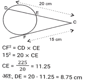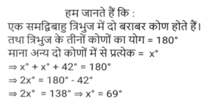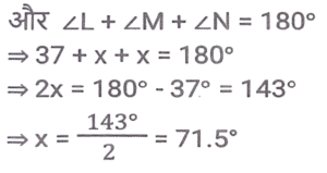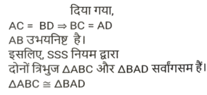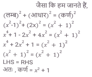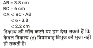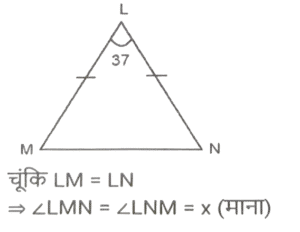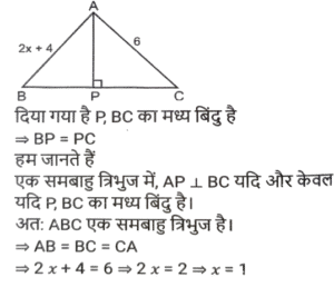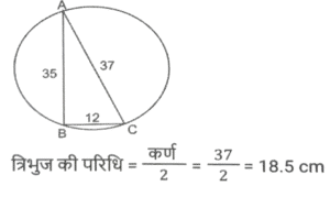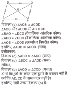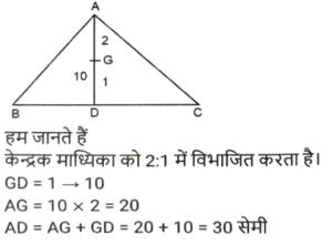 ज्यामिति (Part-VII)Total Questions: 501. छेदक रेखा CD वृत्त को E पर प्रतिच्छेदित करती है और CF वृत्त पर F पर स्पर्शरखा है। यदि छेदक रेखा CD की लंबाई 20 cm है और स्पर्शरखा CF की लंबाई 15 cm है, तो जीवा DE की लंबाई ज्ञात कीजिए। [SSC CPO 29/06/2024 (2nd Shift)](a) 3.75 cm(b) 11.25 cm(c) 9.25 cm(d) 8.75 cmCorrect Answer: (d) 8.75 cmSolution:2. एक विषमबाहु त्रिभुज ABC की दो भुजाओं की माप क्रमशः 3.8cm और 6 cm हैं। निम्नलिखित में से कौन-सी इसकी तीसरी भुजा की माप (cm में) नहीं हो सकती है? [SSC CPO 29/06/2024 (3rd Shift)](a) 3.0(b) 2.7(c) 2.4(d) 2.2Correct Answer: (d) 2.2Solution:3. यदि एक समद्विबाहु त्रिभुज का शीर्ष कोण 42° है, तो अन्य दो कोणों का माप क्या होगा? [Higher Secondary 20/06/2024 (Shift - 2)](a) 59° और 59°(b) 79° और 79°(c) 89° और 89°(d) 69° और 69°Correct Answer: (d) 69° और 69°Solution:4. ∆ABC केंद्र O वाले एक वृत्त में अंकित है। यदि AB = 35 सेमी, BC = 12 सेमी और AC = 37 सेमी है, तो फिर त्रिभुज की परित्रिज्या क्या है? [Higher Secondary 21/06/2024 (Shift - 2)](a) 13.5 cm(b) 16.5 cm(c) 18.5 cm(d) 14.5 cmCorrect Answer: (c) 18.5 cmSolution:5. एक समानांतर चतुर्भुज ABCD में, यदि शीर्ष क्रमशः क्रम (respective order) में हैं और विकर्ण AC और BD बिंदु O पर प्रतिच्छेद करते हैं, तो निम्नलिखित में से कौन-सा विकल्प सदैव सही नहीं होगा ? [Higher Secondary 21/06/2024 (Shift - 2)](a) ΔΑΟΒ ≅ ΔCOD(b) ΔAOD ≅ ΔCOD(c) ΔABC ≅ ΔADC(d) ΔBOC ≅ ΔAODCorrect Answer: (b) ΔAOD ≅ ΔCODSolution:6. ΔABC में D, BC का मध्य-बिंदु है और G केन्द्रक है। यदि GD=10 cm है, तो AD की लंबाई कितनी होगी ? [Higher Secondary 24/06/2024 (Shift - 2)](a) 20 cm(b) 10 cm(c) 15 cm(d) 30 cmCorrect Answer: (d) 30 cmSolution:7. एक त्रिभुज ABC में, P, BC का मध्यबिंदु है। यदि AB = (2x + 4) cm, AC = 6 cm और AP ⊥ BC है, तो x का मान ज्ञात कीजिए। [Higher Secondary 24/06/2024 (Shift - 2)](a) 3(b) 4(c) 1(d) 2Correct Answer: (c) 1Solution:8. △ABC और △ABD एक उभयनिष्ठ आधार AB पर हैं और AC = BD तथा BC = AD है, जैसा कि आकृति में दिखाया गया है। निम्नलिखित में से कौन-सा विकल्प सत्य है? [Higher Secondary 25/06/2024 (Shift - 4)](a) दी गई आकृति में कोई सर्वांगसम त्रिभुज नहीं है(b) ΔΑΒΟ ≅ ΔΑΒΟ(c) ∆АВС ≅ ∆BAD(d) ΔABC ≅ ΔADBCorrect Answer: (c) ∆АВС ≅ ∆BADSolution:9. एक समद्विबाहु △LMN में, LM = LN, और ∠MLN = 37° है। ∠MNL को ज्ञात कीजिए। [Higher Secondary 26/06/2024 (Shift - 2)](a) 70.0°(b) 65.0°(c) 71.5°(d) 60.5°Correct Answer: (c) 71.5°Solution:10. यदि x² -1, 2x और x² + 1 एक समकोण त्रिभुज की तीन भुजाएँ हैं, तो निम्नलिखित में से कौन-सा इसका कर्ण हो सकता है ? [Graduate Level 20/06/2024 (Shift - 3)](a) x² + 1(b) x²(c) 2x(d) x²-1Correct Answer: (a) x² + 1Solution:Submit Quiz12345Next »