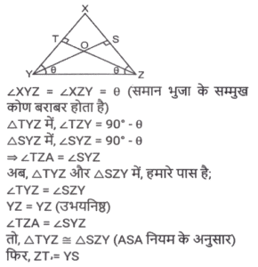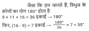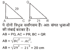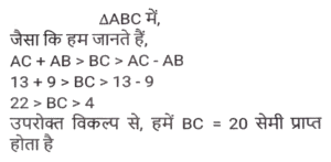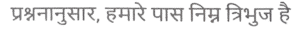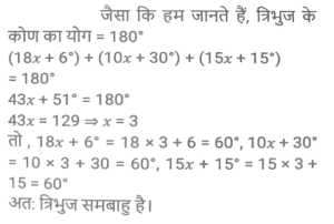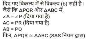 ज्यामिति (Part-VII)Total Questions: 5011. PQ किसी वृत्त का व्यास हैऔर PS एक जीवा है। यदि PQ, 82 cm है और PS, 80 cm है, तो वृत्त के केंद्र से PS की दूरी (cm में) कितनी है? [Graduate Level 20/06/2024 (Shift - 3)](a) 18(b) 9(c) 39(d) 24Correct Answer: (b) 9Solution:12. यदि एक त्रिभुज के कोण 9 : 11 : 16 के अनुपात में हैं, तो सबसे बड़े कोण और सबसे छोटे कोण के बीच का अंतर ज्ञात कीजिए। [Graduate Level 21/06/2024 (Shift - 3)](a) 30°(b) 25°(c) 40°(d) 35°Correct Answer: (d) 35°Solution:13. ∆ABC और ∆PQR, AB = 7m BC = 8 m, AC = 9m PQ = 7m QR = 8m और PR = 9 m है। इन त्रिभुजों के लिए निम्नलिखित में से कौन सा विकल्प सत्य है ? [Graduate Level 21/06/2024 (Shift - 3)](a) ∆CBA ≅ ∆PQR(b) ∆ABC ≅ ∆PQR(c) ∆ABC ≅ ∆RQP(d) ∆ABC ≅ ∆QRPCorrect Answer: (b) ∆ABC ≅ ∆PQRSolution:ΔABC और ΔPQR में,AB = PQ = 7cmBC = QR = 8cmAC = PR = 9cmफिर, ΔABC ≅ ΔPQR (SSS नियम द्वारा)14. त्रिभुज के गुणधर्मों के बारे में सही कथन का चयन कीजिये। [Graduate Level 24/06/2024 (Shift - 3)](a) दो भुजाओं का योग सदैव तीसरी भुजा से अधिक होता है।(b) दो भुजाओं का योग तीसरी भुजा के बराबर हो सकता है।(c) दो भुजाओं का योग सदैव तीसरी भुजा के बराबर होता है।(d) दो भुजाओं का योग सदैव तीसरी भुजा से कम होता है।Correct Answer: (a) दो भुजाओं का योग सदैव तीसरी भुजा से अधिक होता है।Solution:त्रिभुज में दो भुजाओं का योग सदैव तीसरी भुजा से अधिक होता है।15. △PQR और △ABC दो सर्वांगसम त्रिभुज हैं। यदि △PQR का क्षेत्रफल 225 cm² है, तो △ABC का क्षेत्रफल ज्ञात कीजिए। [Graduate Level 25/06/2024 (Shift - 3)](a) 15 cm²(b) 112.5 cm²(c) 25 cm²(d) 225 cm²Correct Answer: (d) 225 cm²Solution:दो सर्वांगसम त्रिभुजों का क्षेत्रफल सदैव बराबर होता है।अतः,△PQR का क्षेत्रफल = △ABC का क्षेत्रफल = 225 cm²16. यदि एक त्रिभुज के तीन कोण (18x + 6°), (10x + 30°) और (15x + 15°), हैं, तो यह ________ त्रिभुज है। [Graduate Level 25/06/2024 (Shift - 3)](a) विषमबाहु(b) समबाहु(c) समद्विबाहु(d) समकोणCorrect Answer: (b) समबाहुSolution:17. △XYZ एक समद्विबाहु त्रिभुज इस प्रकार है कि XY = XZ है। यह दिया गया है कि YS ⊥ XZ और ZT ⊥ XY है। YS और ZT के बीच क्या संबंध है? [Graduate Level 26/06/2024 (Shift - 3)](a) YS > ZT(b) YS = 2 ZT(c) YS < ZT(d) YS = ZTCorrect Answer: (d) YS = ZTSolution:18. △ABC में, AB = 9 cm और AC = 13 cm है, तो BC की लंबाई क्या हो सकती है ? [Graduate Level 26/06/2024 (Shift - 4)](a) 4 cm(b) 2 cm(c) 22 cm(d) 20 cmCorrect Answer: (d) 20 cmSolution:19. निम्नलिखित आकृति में, ∠A = ∠P और AC = PR है। ∆PQR और ∆ABC के सर्वांगसम होने के लिए निम्नलिखित में से किस विकल्प का संतुष्ट होना आवश्यक है ? [Graduate Level 26/06/2024 (Shift - 4)](a) ASS मानदंड द्वारा BC = QR(b) SAS मानदंड द्वारा AB = PQ(c) SSA मानदंड द्वारा BC = QR(d) S SA मानदंड द्वारा AB = PQCorrect Answer: (b) SAS मानदंड द्वारा AB = PQSolution:20. मान लीजिए कि ABC और PQR दो सर्वांगसम त्रिभुज इस प्रकार हैं कि ∠A = ∠P = 90° है। यदि BC = 29 cm, PR = 21 cm है, तो AB का मान (cm में) ज्ञात कीजिए। [SSC CHSL Tier II (02/11/2023)](a) 23(b) 19(c) 20(d) 22Correct Answer: (c) 20Solution:Submit Quiz« Previous12345Next »