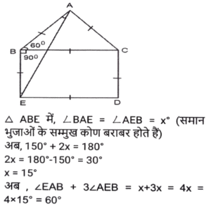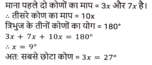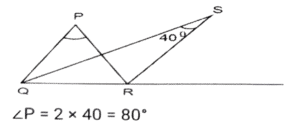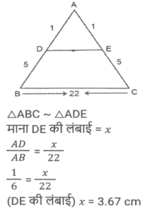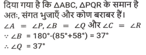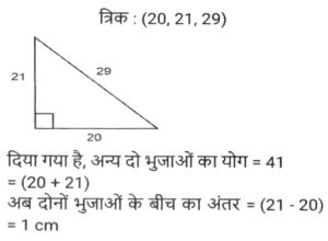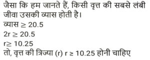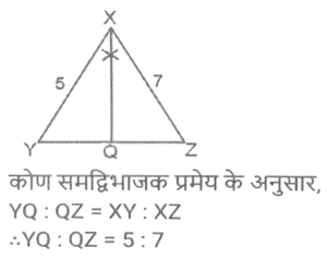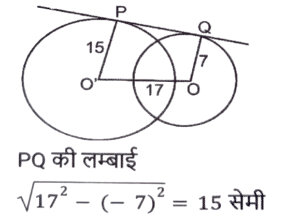 ज्यामिति (Part-VII)Total Questions: 5021. ∆ABC में, ∠A = 85° और ∠C = 58° है। यदि ∆PQR, ∆ABC के समरूप है और संगत है तो ∠Q ज्ञात कीजिए। [SSC CHSL Tier II (02/11/2023)](a) 37°(b) 85°(c) 58°(d) 73°Correct Answer: (a) 37°Solution:22. △XYZ में, यदि XY = 5 cm, XZ = 7 cm और Q, YZ पर एक बिंदु इस प्रकार है कि XQ, ∠X को समद्विभाजित करता है, तो YQ : QZ का मान ज्ञात कीजिए।. [SSC CHSL Tier II (10/01/2024)](a) 5:7(b) 7:12(c) 7:5(d) 5:12Correct Answer: (a) 5:7Solution:23. एक त्रिभुज के दो कोणों की माप 3: 7 के अनुपात में है। यदि इन दोनों मापों का योग तीसरे कोण की माप के बराबर है, तो सबसे छोटा कोण ज्ञात कीजिए। [SSC CHSL Tier II (10/01/2024)](a) 27°(b) 3°(c) 9°(d) 36°Correct Answer: (a) 27°Solution:24. एक समबाहु त्रिभुज ABC एक वर्ग BCDE के ऊपर स्थित है। ∠EAB + 3∠AEB का मान कितना होगा? [SSC CGL Tier II (26/10/2023)](a) 60°(b) 80°(c) 280°(d) 240°Correct Answer: (a) 60°Solution:25. यदि वृत्त की एक जीवा 20.5 cm दी गई है, तो वृत्त की त्रिज्या (r) ____________ होनी चाहिए। [SSC CGL Tier II (26/10/2023)](a) r = 10cm(b) r < 10.25(c) r > 10.25(d) r ≥ 10.25Correct Answer: (d) r ≥ 10.25Solution:26. यदि किसी समकोण त्रिभुज का कर्ण 29 cm है, और अन्य दो भुजाओं का योग 41 cm हो, तो अन्य दो भुजाओं के बीच का अंतर ज्ञात कीजिए। [SSC CPO 03/10/2023 (1st Shift)](a) 2 cm(b) 5 cm(c) 10 cm(d) 1 cmCorrect Answer: (d) 1 cmSolution:27. एक त्रिभुज ABC के लिए, D और E, AB और AC पर दो बिंदु हैं जो इस प्रकार हैं कि AD = 1/6 AB, AE = 1/6 AC होता है। यदि BC = 22 cm है, तो DE ज्ञात कीजिए। (दो दशमलव स्थान तक विचार करें) [SSC CPO 03/10/2023 (2nd Shift)](a) 3.67 cm(b) 1.67 cm(c) 1.33 cm(d) 3.33 cmCorrect Answer: (a) 3.67 cmSolution:28. एक वृत्त के त्रिज्यखंड का केंद्रीय कोण 45° और चाप की लंबाई 22 cm है। वृत्त की त्रिज्या ज्ञात कीजिए। (π = 22/7 का उपयोग करें) [SSC CPO 03/10/2023 (2nd Shift)](a) 28 cm(b) 35 cm(c) 36 cm(d) 32 cmCorrect Answer: (a) 28 cmSolution:29. 0 और O' केंद्रों वाले दो वृत्तों में, दोनों वृत्तों के केंद्रों के बीच की दूरी 17 सेमी है। वृत्तों के बीच एक सीधी उभयनिष्ठ स्पर्शरखा के संपर्क बिंदु P और Q हैं। यदि दोनों वृत्तों की त्रिज्याएं क्रमशः 7 सेमी और 15 सेमी हैं तो PQ की लंबाई किसके बराबर है? [SSC CPO 03/10/2023 (3rd Shift)](a) 15 सेमी(b) 22 सेमी(c) 10 सेमी(d) 17 सेमीCorrect Answer: (a) 15 सेमीSolution:30. PQR एक त्रिभुज है। आंतरिक कोण ∠Q और बाह्य कोण ∠R के समद्विभाजक S पर प्रतिच्छेद करते हैं। यदि ∠QSR = 40° है, तो ∠P है: [SSC CPO 04/10/2023 (1st Shift)](a) 80°(b) 60°(c) 40°(d) 30°Correct Answer: (a) 80°Solution:Submit Quiz« Previous12345Next »