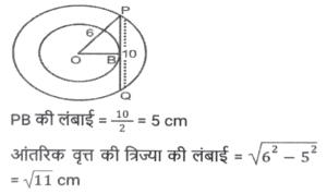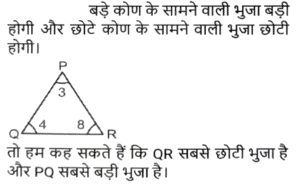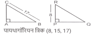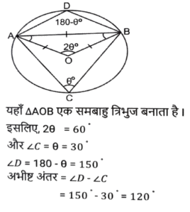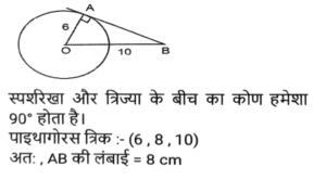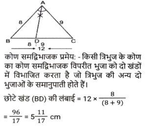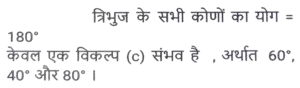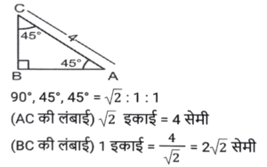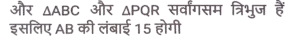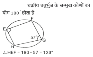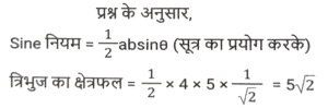 ज्यामिति (Part-VII)Total Questions: 5031. E, F, G, और H चक्रीय चतुर्भुज बनाने वाले एक वृत्त की परिधि पर स्थित चार बिंदु हैं। यदि ∠FGH = 57° है, तो ∠HEF का माप क्या होगा ? [SSC CPO 04/10/2023 (1st Shift)](a) 33°(b) 143°(c) 123°(d) 93°Correct Answer: (c) 123°Solution:32. Δ PQR में, ∠P: ∠Q : ∠R = 3 : 4 : 8 है। त्रिभुज की सबसे छोटी भुजा और सबसे बड़ी भुजा क्रमशः __________ है। [SSC CPO 04/10/2023 (2nd Shift)](a) QR और PR(b) PQ और PR(c) PQ और QR(d) QR और PQ,Correct Answer: (d) QR और PQ,Solution:33. त्रिभुज ABC में, यदि ∠B = 90° , ∠C = 45° और AC = 4 cm, है तो BC का मान __________ है। [SSC CPO 04/10/2023 (2nd Shift)](a) 4 cm(b) 2 √2 cm(c) 4 √2 cm(d) √2 cmCorrect Answer: (b) 2 √2 cmSolution:34. उस त्रिभुज का क्षेत्रफल ज्ञात कीजिए, जिसकी दो भुजाओं की लंबाइयां 4 cm और 5 cm हैं, और उनके बीच का कोण 45° है। [SSC CPO 04/10/2023 (2nd Shift)](a) 7 √2 cm²(b) 4 √2 cm²(c) 6 √2 cm²(d) 5 √2 cm²Correct Answer: (d) 5 √2 cm²Solution:35. मान लीजिए ABC और PQR दो सर्वांगसम त्रिभुज इस प्रकार हैं कि ∠A = ∠P = 90° है। यदि BC = 17 cm, PR 8 cm है, तो AB का मान (cm में) ज्ञात कीजिए। [SSC CPO 04/10/2023 (2nd Shift)](a) 9(b) 14(c) 12(d) 15Correct Answer: (d) 15Solution:36. दो संकेंद्रित वृत्तों में से, बाह्य वृत्त की त्रिज्या 6 cm है, और इसकी 10 cm लंबाई वाली जीवा PQ, आंतरिक वृत्त की स्पर्श रेखा है। आंतरिक वृत्त की त्रिज्या (cm मैं) ज्ञात कीजिए। [SSC CPO 05/10/2023 (2nd Shift)](a) √11(b) √7(c) √13(d) 4Correct Answer: (a) √11Solution:37. किसी वृत्त की जीवा, उसकी त्रिज्या के बराबर है। वृत्त के लघु चाप और दीर्घ चाप पर इस जीवा द्वारा अंतरित कोणों के बीच का अंतर ज्ञात कीजिए। [SSC CPO 05/10/2023 (3rd Shift)](a) 30°(b) 120°(c) 150°(d) 60°Correct Answer: (b) 120°Solution:38. 8 सेमी, 9 सेमी और 12 सेमी भुजाओं वाले △ABC में, सबसे बड़े कोण का कोण समद्विभाजक सम्मुख भुजाओं को दो खंडों में विभाजित करता है। छोटे खंड की लंबाई कितनी होगी? [SSC CPO 05/10/2023 (3rd Shift)](a) 5 11/17 सेमी(b) 6 13/17 सेमी(c) 4 11/17 सेमी(d) 3 9/17 सेमीCorrect Answer: (a) 5 11/17 सेमीSolution:39. 6 cm त्रिज्या वाले एक वृत्त के बिंदु A पर एक स्पर्श रेखा AB, केंद्र O से होकर एक रेखा से बिंदु B पर मिलती है। यदि OB = 10 cm है. तो AB की लंबाई (cm में) ____________ के बराबर है। [SSC CHSL 02/08/2023 (1st Shift)](a) 5(b) 6(c) 4(d) 8Correct Answer: (d) 8Solution:40. कोणों का निम्नलिखित में से कौन सा समुच्चय एक त्रिभुज बनाता है? [SSC CHSL 02/08/2023 (2nd Shift)](a) 60° 70° 80°(b) 60° 70° 30°(c) 60° 40° 80°(d) 60° 50° 80°Correct Answer: (c) 60° 40° 80°Solution:Submit Quiz« Previous12345Next »