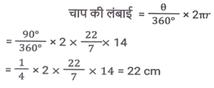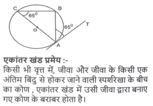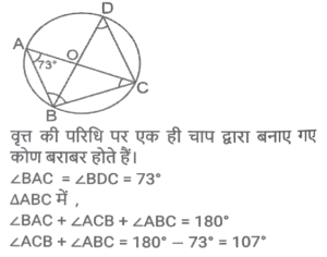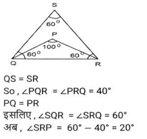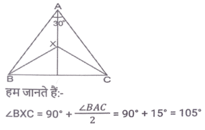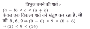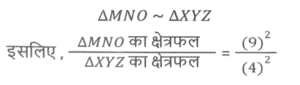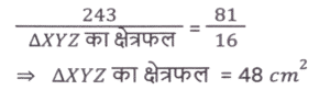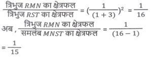 ज्यामिति (Part-VII)Total Questions: 5041. दो समरूप त्रिभुज MNO और XYZ दिए गए हैं, जिनकी भुजाओं का अनुपात 9 : 4 है। यदि बड़े त्रिभुज का क्षेत्रफल 243 वर्ग सेमी है, तो छोटे त्रिभुज का क्षेत्रफल क्या होगा? [SSC CHSL 02/08/2023 (3rd Shift) ](a) 162 sq.cm(b) 28 sq.cm(c) 48 sq.cm.(d) 16 sq.cmCorrect Answer: (c) 48 sq.cm.Solution:42. 14 cm त्रिज्या वाले एक वृत्त में, एक चाप केंद्र पर 90° का कोण अंतरित करता है। चाप की लंबाई (cm में) ___________ के बराबर है। (π = 22/7 का प्रयोग करें) [SSC CHSL 02/08/2023 (3rd Shift)](a) 22(b) 18(c) 20(d) 24Correct Answer: (a) 22Solution:43. AB वृत्त की एक जीवा है और इसका व्यास AOC इस प्रकार है कि कोण ACB = 65° है। यदि AT बिंदु A पर वृत्त की स्पर्श रेखा है, तो कोण BAT किसके बराबर होगा? [SSC CHSL 02/08/2023 (4th Shift)](a) 65°(b) 75°(c) 55°(d) 40°Correct Answer: (a) 65°Solution:44. ΔPQR और ΔSQR दोनों एक उभयनिष्ठ आधार QR पर समद्विबाहु त्रिभुज इस प्रकार हैं कि P और S, QR की एक ही दिशा में स्थित हैं। यदि ∠QSR = 60° और ∠QPR = 100° है, तो ∠SRP का मान ज्ञात कीजिए । [SSC CHSL 03/08/2023 (1st Shift)](a) 80°(b) 60°(c) 100°(d) 20°Correct Answer: (d) 20°Solution:45. दी गई भुजाओं वाला कौन-सा विकल्प एक त्रिभुज बनाता है ? [SSC CHSL 03/08/2023 (2nd Shift)](a) 8, 6, 9(b) 100, 200, 300(c) 10, 25, 11(d) 8, 2, 6Correct Answer: (a) 8, 6, 9Solution:46. एक त्रिभुज PQR में, QR को S तक बढ़ाया जाता है। यदि ∠PRS = (9x - 15)°, ∠RPQ = (2x)°, और PQR = (4x + 15)° है, तो x का मान क्या होगा? [SSC CHSL 03/08/2023 (3rd Shift)](a) 55°(b) 20°(c) 10°(d) 75°Correct Answer: (c) 10°Solution:बाह्य कोण प्रमेय का उपयोग करके:-2x° + 4x + 15° = 9x - 15°3x=30° ⇒ x = 10°47. यदि △PQR और △DEF में, ∠P = 52° , ∠Q = 74° , ∠R = 54°, ∠D = 54°, ∠E = 74°, ∠F = 52° तो निम्नलिखित में से कौन सा सही है? [SSC CHSL 03/08/2023 (3rd Shift)](a) △PQR ~ △FED(b) △RQP ~ △FED(c) △PRQ ~ △FED(d) △PQR ~ △DEFCorrect Answer: (a) △PQR ~ △FEDSolution:∠P= ∠F = 52° , ∠Q= ∠E = 74° और ∠R= ∠D = 54°इसलिए, △PQR ∼ △FED48. लघु चाप BC केंद्र O वाले वृत्त के दीर्घ त्रिज्यखंड की परिधि पर क्रमशः बिंदु A और D पर कोण BAC और BDC को अंतरित करता है। यदि ∠BDC = 73°, तो (∠ABC +∠ACB) का मान (डिग्री में) क्या है? [SSC CHSL 03/08/2023 (4th Shift)](a) 117°(b) 107°(c) 103°(d) 113°Correct Answer: (b) 107°Solution:49. ΔABC में, ∠ABC और ∠ACB के आंतरिक समद्विभाजक x पर मिलते हैं और ∠BAC = 30° है। ∠BXC की माप क्या है? [SSC CHSL 03/08/2023 (4th Shift)](a) 120°(b) 115°(c) 105°(d) 150°Correct Answer: (c) 105°Solution:50. त्रिभुज RST में, M और N, RS और RT पर दो बिंदु इस प्रकार है कि MN, त्रिभुज RST के आधार ST के समानांतर है। यदि RM = 1/3 MS, और ST = 5.6 cm है, तो का त्रिभुज RMN का क्षेत्रफल/समलंब MNST का क्षेत्रफल अनुपात क्या होगा ? [SSC CHSL 04/08/2023 (1st Shift)](a) 14/15(b) 15/16(c) 1/15(d) 1/16Correct Answer: (c) 1/15Solution:Submit Quiz« Previous12345