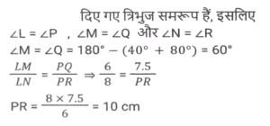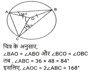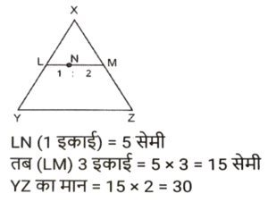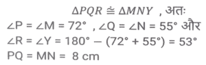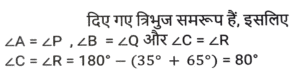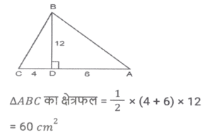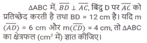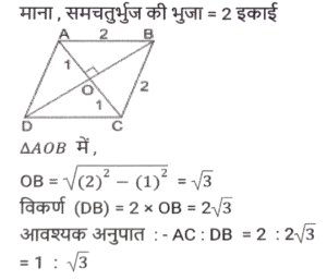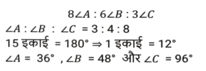 ज्यामिति (Part-VIII)Total Questions: 5031. यदि त्रिभुज ABC और PQR समरूप हैं और यदि ∠A = 35° , ∠B = 65° , तो ∠R = _________ है। [SSC CHSL 10/08/2023 (3rd Shift)](a) 80°(b) 90°(c) 35°(d) 65°Correct Answer: (a) 80°Solution:32. यदि एक समचतुर्भुज का एक विकर्ण उसकी भुजा के बराबर है, तो समचतुर्भुज के विकर्णों का अनुपात क्या होगा ? [SSC CHSL 10/08/2023 (3rd Shift)](a) √3 : √6(b) √2 : 1(c) √2 : √3(d) 1 : √3Correct Answer: (d) 1 : √3Solution:33. एक त्रिभुज ABC में; 8 ∠A = 6 ∠B = 3∠C है, तो ∠A, ∠B और C की डिग्री की माप क्या है? [SSC CHSL 10/08/2023 (4th Shift)](a) 48°, 96°, 36°(b) 36°, 96°, 48°(c) 36°, 48°, 96°,(d) 96°, 48°, 36°Correct Answer: (c) 36°, 48°, 96°,Solution:34. दो समरूप त्रिभुज अर्थात् △LMN ~ △PQR दिए गए हैं, जिनके कोण और भुजा की माप इस प्रकार है: कोण L = 40° कोण N = 80° LM = 6 cm, LN = 8 cm और PQ = 7.5 cm है। कोण Q और भुजा PR का क्रमशः मान ज्ञात कीजिए। [SSC CHSL 10/08/2023 (4th Shift)](a) 60°, 20 cm(b) 50°, 6.5 cm(c) 40°, 10 cm(d) 60°, 10 cmCorrect Answer: (d) 60°, 10 cmSolution:35. विस्तार से बताइए ? [SSC CHSL 11/08/2023 (2nd Shift)](a) 45(b) 50(c) 60(d) 75Correct Answer: (c) 60Solution:36. यदि △PQR ≅ △MNY और PQ = 8 cm, ∠Q = 55° और ∠P = 72° है। निम्नलिखित में से कौन सा विकल्प सही है ? [SSC CHSL 11/08/2023 (3rd Shift)](a) NY = 8cm, ∠Y = 72°(b) NM = 8cm, ∠M = 53°(c) NM = 8cm, ∠Y = 53°(d) NY = 8cm, ∠N = 55°Correct Answer: (c) NM = 8cm, ∠Y = 53°Solution:37. एक समकोण त्रिभुज की समकोण के आसन्न दो भुजाओं की लंबाई 1.6 cm और 6.3 cm हैं। कर्ण की लंबाई ज्ञात कीजिए। [SSC CHSL 11/08/2023 (3rd Shift)](a) 6.7 cm(b) 7.5 cm(c) 6.5 cm(d) 7 cmCorrect Answer: (c) 6.5 cmSolution:38. AB और BC केंद्र O वाले वृत्त की दो जीवाएँ हैं। दोनों जीवाएँ केंद्र O के दोनों ओर हैं। बिंदु A और बिंदु C केंद्र O से इस प्रकार जुड़े हैं कि ∠BAO = 36° और ∠BCO = 48° है। लघु चाप AC द्वारा केंद्र पर अंतरित कोण की डिग्री की माप क्या है ? [SSC CHSL 11/08/2023 (3rd Shift)](a) 136°(b) 144°(c) 120°(d) 168°Correct Answer: (d) 168°Solution:39. △XYZ में, L और M क्रमशः भुजाओं XY और XZ के मध्य बिंदु हैं। N, रेखा खंड LM पर एक बिंदु इस प्रकार है कि LN : NM = 1 : 2 है। यदि LN = 5 cm, तो YZ का मान ज्ञात कीजिए। [SSC CHSL 14/08/2023 (1st Shift)](a) 30 cm(b) 24 cm(c) 28 cm(d) 26 cmCorrect Answer: (a) 30 cmSolution:40. 6 cm त्रिज्या वाले दो समान वृत्त एक दूसरे को इस प्रकार प्रतिच्छेद करते हैं कि दोनों एक दूसरे के केंद्र से होकर गुजरते हैं। उभयनिष्ठ जीवा की लंबाई (cm में) कितनी है? [SSC CHSL 14/08/2023 (1st Shift)](a) 5√3(b) 6√3(c) 4√3(d) 3√3Correct Answer: (b) 6√3Solution:Submit Quiz« Previous12345Next »