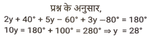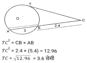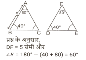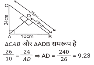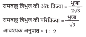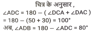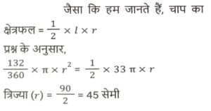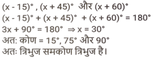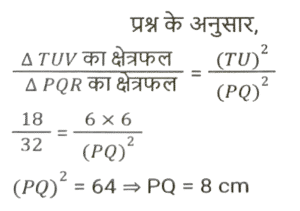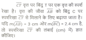 ज्यामिति (Part-VIII)Total Questions: 5041. विस्तार से बताइए ? [SSC CHSL 14/08/2023 (3rd Shift)](a) 4.2(b) 3.6(c) 3.2(d) 4.0Correct Answer: (b) 3.6Solution:42. दो समरूप त्रिभुजों TUV और PQR का क्षेत्रफल क्रमशः 18 cm² और 32 cm² है। यदि TU = 6 cm है, तो PQ बराबर होगा। [SSC CHSL 14/08/2023 (4th Shift)](a) 4 cm(b) 8 cm(c) 2 cm(d) 64 cmCorrect Answer: (b) 8 cmSolution:43. एक समबाहु त्रिभुज की प्रत्येक भुजा 18 cm है। त्रिभुज की अंतः त्रिज्या और परित्रिज्या का अनुपात कितना है? [SSC CHSL 14/08/2023 (4th Shift)](a) 2 : 1(b) 3 : 2(c) 3 : 4(d) 1 : 2Correct Answer: (d) 1 : 2Solution:44. △CAB में, ∠CAB = 90° और AD ⊥ BC है। यदि AC = 24cm , AB = 10cm है, तो AD का मान (cm में) ज्ञात कीजिए। [SSC CHSL 17/08/2023 (1st Shift)](a) 9.23(b) 8.23(c) 7.14(d) 10.23Correct Answer: (a) 9.23Solution:45. आकृति में, ∠ADB __________ के बराबर है। [SSC CHSL 17/08/2023 (1st Shift)](a) 40°(b) 60°(c) 80°(d) 50°Correct Answer: (c) 80°Solution:46. दी गई आकृति में, जीवाएँ XY = x cm और PQ = 10 cm एक दूसरे को बिंदु L पर प्रतिच्छेद करती हैं। XY की लंबाई (cm में) ज्ञात कीजिए। [SSC CHSL 17/08/2023 (1st Shift)](a) 22(b) 21(c) 20(d) 23Correct Answer: (c) 20Solution:47. 33 π cm लंबाई का एक चाप वृत्त के केंद्र पर 132° का कोण अंतरित करता है। वृत्त की त्रिज्या ज्ञात कीजिए। [SSC CHSL 17/08/2023 (2nd Shift)](a) 45 cm(b) 40 cm(c) 30 cm(d) 35 cmCorrect Answer: (a) 45 cmSolution:48. एक त्रिभुज के तीन कोण (x - 15)° , (x + 45)° और (x + 60)° हैं। त्रिभुज के प्रकार को पहचानें। [SSC CHSL 17/08/2023 (2nd Shift)](a) अधिक कोण त्रिभुज(b) समकोण त्रिभुज(c) समद्विबाहु त्रिकोण(d) समबाहु त्रिभुजCorrect Answer: (b) समकोण त्रिभुजSolution:49. दिया गया है कि △ABC ≅ △FDE और AB = 5 cm, ∠B = 40° और ∠A = 80° है। तो निम्न में से कोन-सा सत्य है? [SSC CHSL 17/08/2023 (3rd Shift)](a) DE = 5cm, ∠D = 40°(b) DE = 5cm, ∠E = 60°(c) DF = 5cm, ∠F = 60°(d) DF = 5cm, ∠E = 60°Correct Answer: (d) DF = 5cm, ∠E = 60°Solution:50. यदि एक त्रिभुज के तीन कोण (2y + 40°) , (5y - 60°) , और (3y - 80°) हैं, तो y का मान क्या है? [SSC CHSL 17/08/2023 (3rd Shift)](a) 30°(b) 24°(c) 28°(d) 26°Correct Answer: (c) 28°Solution:Submit Quiz« Previous12345