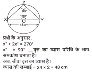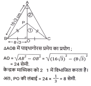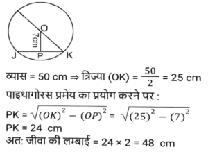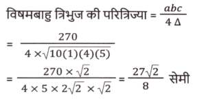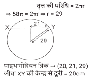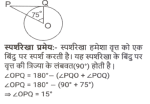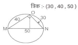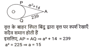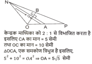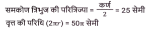 ज्यामिति (Part-X)Total Questions: 501. एक वृत्त की परिधि 58π cm है। इस वृत्त में 42 सेमी लंबाई की एक जीवा XY है। इस जीवा XY की केंद्र से दूरी कितनी है ? [SSC CHSL 15/03/2023 (2nd Shift)](a) 32 cm(b) 20 cm(c) 28 cm(d) 24 cmCorrect Answer: (b) 20 cmSolution:2. एक वृत्त एक त्रिभुज के परिगत है जिसकी भुजाएँ 30 cm, 40 cm और 50cm हैं। वृत्त की परिधि ज्ञात कीजिए। [SSC CHSL 15/03/2023 (3rd Shift)](a) 100π cm(b) 50π cm(c) 25π cm(d) 75π cmCorrect Answer: (b) 50π cmSolution:3. ΔXYZ में, बिंदु P, Q और R क्रमश: XY, YZ और XZ भुजाओं पर बिंदु हैं ∠YXZ = 50° है, XR = PR, ZR = QR और ΔRQZ = 80° है। ∠PRQ का मान क्या है? [SSC CHSL 16/03/2023 (1st Shift)](a) 80°(b) 90°(c) 75°(d) 60°Correct Answer: (a) 80°Solution:4. केंद्र से जीवा JK की दूरी 7 cm है। यदि इस वृत्त का व्यास 50 cm है, तो इस जीवा की लंबाई क्या होगी ? (cm में) [SSC CHSL 16/03/2023 (1st Shift)](a) 74(b) 96(c) 48(d) 24Correct Answer: (c) 48Solution:5. जीवा XY द्वारा वृत्त के केंद्र और परिधि पर बने कोणों का योग 270° है। यदि इस वृत्त की त्रिज्या 24 cm है, तो इस जीवा की लंबाई क्या होगी ? (cm में) [SSC CHSL 16/03/2023 (2nd Shift)](a) 60(b) 12(c) 36(d) 48Correct Answer: (d) 48Solution:6. यदि O केंद्र वाले किसी वृत की स्पर्शरखा PQ (वृत्त को Q पर स्पर्श करती है) है और कोण POQ का मान 75° है, तो कोण OPQ का मान क्या है? [SSC CHSL 16/03/2023 (4th Shift)](a) 15°(b) 35°(c) 30°(d) 25°Correct Answer: (a) 15°Solution:7. एक त्रिभुज की भुजाएं 9 cm, 6 cm और 5 cm हैं। इस त्रिभुज की परित्रिज्या का मान क्या है? (cm में) [SSC CHSL 17/03/2023 (3rd Shift)](a) 9√3/4(b) 9√3/5(c) 27√2/8(d) 9√2/2Correct Answer: (c) 27√2/8Solution:8. एक समबाहु त्रिभुज ABC में, P इस त्रिभुज का केन्द्रक है। △ABC की भुजा 16√3 cm है। भुजा BC से बिंदु P की दूरी कितनी है? [SSC CHSL 17/03/2023 (4th Shift)](a) 8 cm(b) 12 cm(c) 9 cm(d) 10 cmCorrect Answer: (a) 8 cmSolution:9. A, O केंद्र वाले वृत्त के बाहर एक बिंदु है। AP और AQ वृत्त की दो स्पर्श रेखाएँ हैं। यदि AP = a² + 14 और AQ = 239 है, तो a का मान क्या है? [SSC CHSL 20/03/2023 (1st Shift)](a) 22(b) 13(c) 15(d) 14Correct Answer: (c) 15Solution:10. ANOP की दो माध्यिकाएँ NA और OB एक दूसरे को C पर समकोण पर प्रतिच्छेद करती हैं। यदि NA = 15 cm और OB = 15 cm है, तो OA की लंबाई क्या है ? (cm में) [SSC CHSL 20/03/2023 (2nd Shift)](a) 5√5(b) 7√5(c) 6√5(d) 3√5Correct Answer: (a) 5√5Solution:Submit Quiz12345Next »