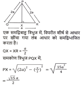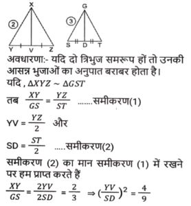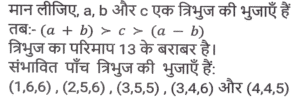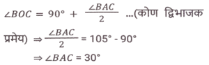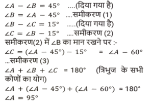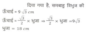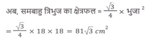 ज्यामिति (Part-X)Total Questions: 5031. △XYZ ~ △GST और XY : GS = 2 : 3, XV भुजा YZ की माध्यिका है, और GD भुजा ST की माध्यिका है। (YV/SD)² का मान ज्ञात कीजिए । [SSC CGL 03/12/2022 (2nd Shift)](a) 4/9(b) 3/5(c) 1/4(d) 2/3Correct Answer: (a) 4/9Solution:32. A, B, C त्रिभुज के तीन कोण हैं। यदि ∠A - ∠B = 45° और ∠B - ∠C = 15° है, तो ∠A = ? [SSC CGL 03/12/2022 (3rd Shift)](a) 83°(b) 85°(c) 95°(d) 75°Correct Answer: (c) 95°Solution:33. उभयनिष्ठ स्पर्श रेखाओं की संख्या ज्ञात कीजिए, यदि r₁ + r₂ = C₁ C₂ (सामान्य नोटेशन के साथ, r₁ और r₂ और C₁ & C₂ दो वृत्तों की 1 त्रिज्या और केंद्र हैं।) [SSC CGL 05/12/2022 (1st Shift)](a) 1(b) 0(c) 3(d) 4Correct Answer: (c) 3Solution:34. पूर्णांक मानों की भुजाओं वाले त्रिभुज का परिमाप 13 के बराबर है। ऐसे कितने त्रिभुज बनना संभव हैं? [SSC CGL 05/12/2022 (3rd Shift)](a) 5(b) 8(c) 7(d) 6Correct Answer: (a) 5Solution:35. एक △ABC में कोण B और कोण C के आंतरिक समद्विभाजक 105° के कोण पर प्रतिच्छेद करते हैं। कोण A का मान क्या है? [SSC CGL 05/12/2022 (3rd Shift)](a) 52.5°(b) 75°(c) 15°(d) 30°Correct Answer: (d) 30°Solution:36. 4 से.मी. त्रिज्या वाले तीन वृत्तों को आपस में स्पर्श करते हुए रखा गया है। इन तीन वृत्तों के चारों ओर एक धागा कसकर बाँधा गया है। धागे की लम्बाई क्या है? [SSC CGL 05/12/2022 (4th Shift)](a) 24 + 8π से.मी.(b) 24π + 16 से.मी(c) 32 + 16π से.मी(d) 24 + 18π से.मीCorrect Answer: (a) 24 + 8π से.मी.Solution:37. △ABC की भुजा AB और AC के मध्य बिंदु क्रमशः X और Y हैं। यदि BC + XY = 24 इकाई है, तो BC - XY का मान ज्ञात कीजिए । [SSC CGL 06/12/2022 (1st Shift)](a) 5 cm(d) 8 cm(b) 4 cm(c) 6 cmCorrect Answer: (d) 8 cmSolution:38. वृत्त के किसी दिए गए स्पर्शरखा के समांतर स्पर्श रेखाओं की संख्या कितनी होती है? [SSC CGL 06/12/2022 (4th Shift)](a) 1(b) 2(c) 3(d) 4Correct Answer: (a) 1Solution:किसी दिए गए स्पर्शरखा के साथ एक वृत्त के समानांतर स्पर्शरखाओं की संख्या हमेशा 1 होती है39. ΔPQR एक समद्विबाहु त्रिभुज है और PQ = PR = 2a इकाई, QR = a इकाई है। PX ⊥ QR खींचिए और PX की लंबाई ज्ञात कीजिए। [SSC CGL 06/12/2022 (4th Shift)](a) √5a(b) √5a/2(c) √10a/2(d) √15a/2Correct Answer: (d) √15a/2Solution:40. एक समबाहु त्रिभुज की ऊँचाई 9√3 से.मी. है। इस समबाहु त्रिभुज का क्षेत्रफल क्या है। [SSC CGL 07/12/2022 (1st Shift)](a) 92√3 से.मी.²(b) 67√3 से.मी.²(c) 49√3 से.मी.²(d) 81√3 से.मी.²Correct Answer: (d) 81√3 से.मी.²Solution:Submit Quiz« Previous12345Next »