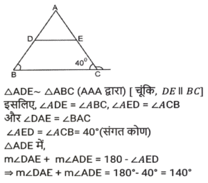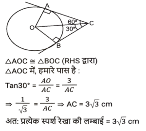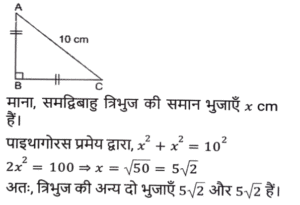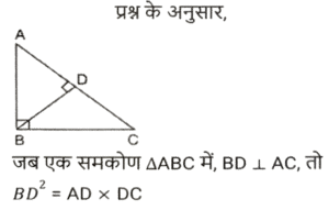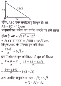 ज्यामिति (Part-XI)Total Questions: 5011. ∆ABC, में, DE || BC इस प्रकार है कि A - D - B और A - E - C है। यदि m ∠ACB = 40º है, तो m∠DAE + m∠ADE = ___________ क्या होगा ? [SSC CPO 09/11/2022 (Morning)](a) 240°(b) 120°(c) 140°(d) 230°Correct Answer: (c) 140°Solution:12. यदि 3 cm त्रिज्या वाले एक वृत्त की दो स्पर्श रेखाएँ एक दूसरे से 60° के कोण पर झुकी हों, तो प्रत्येक स्पर्श रेखा की लंबाई कितनी है? [SSC CPO 09/11/2022 (Afternoon)](a) 3√3/4 cm(b) 3√3 cm(c) 3 cm(d) 6 cmCorrect Answer: (b) 3√3 cmSolution:13. दी गई आकृति में, O केंद्र वाले वृत्त की त्रिज्या 10 cm है। केंद्र P वाले वृत्त की त्रिज्या x है। STR, चित्र में दिखाए अनुसार दो वृत्तों के बिंदु R और S पर एक उभयनिष्ठ स्पर्श रेखा है। RT = 16 cm और TS = 24 cm है। x का मान (cm में) क्या है? [SSC CPO 09/11/2022 (Evening)](a) 15(b) 16(c) 12(d) 18Correct Answer: (a) 15Solution:14. दिए गए वृत्त में जिसका व्यास AB है, X का मान ज्ञात कीजिए। [SSC CPO 10/11/2022 (Afternoon)](a) 40°(b) 20°(c) 30°(d) 50°Correct Answer: (a) 40°Solution:15. यदि 30 cm त्रिज्या वाले एक वृत्त के चाप की लंबाई 19 cm है, तो वृत्त के केंद्र पर अंतरित कोण (अंश में, दो दशमलव स्थानों तक पूर्णांकित) ज्ञात कीजिए। ( π = 22/7 का प्रयोग करें) [SSC CPO 11/11/2022 (Morning)](a) 51.25(b) 16.27(c) 36.27(d) 46.25Correct Answer: (c) 36.27Solution:16. यदि एक समद्विबाहु समकोण त्रिभुज का कर्ण 10 cm है, तो अन्य दो भुजाओं की लंबाई (cm में) __________ हैं। [SSC CPO 11/11/2022 (Evening)](a) 10√2 और 10√2(b) 8√2 और 8√2(c) 6√2 और 6√2(d) 5√2 और 5√2Correct Answer: (d) 5√2 और 5√2Solution:17. ABC एक समद्विबाहु समकोण त्रिभुज है। ∠ABC = 90º और AB = 12cm l त्रिभुज ABC के अंतगर्त वृत्त की त्रिज्या का उसके परिगत वृत्त की त्रिज्या से अनुपात क्या है? [SSC CGL Tier II (08/08/2022)](a) 6-√2 : 3√2(b) 2-√2 : √2(c) 6-3√2 : 1√2(d) 6-3√2 : 6√2Correct Answer: (b) 2-√2 : √2Solution:18. ABC एक समकोण त्रिभुज है और कोण ABC = 90 डिग्री है। BD, AC की भुजा पर एक लम्ब है। BD² का मान क्या है? [SSC CGL Tier II (08/08/2022)](a) AD × DC(b) BC × AB(c) BC × CD(d) AD × ACCorrect Answer: (a) AD × DCSolution:19. ABC और PQR दो त्रिभुज हैं। AB = PQ = 6 cm, BC = QR = 10cm ओर AC = PR = 8 cm यदि कोण ABC = x डिग्री है, तो कोण PRQ का मान क्या है? [SSC CGL Tier II (08/08/2022)](a) (180-x) डिग्री(b) x डिग्री(c) (90-x) डिग्री(d) (90+ x) डिग्रीCorrect Answer: (c) (90-x) डिग्रीSolution:20. x,y और z एक त्रिभुज की भुजाएँ हैं। यदि z सबसे बड़ी भुजा है और x² + y² > z² हो, तो त्रिभुज एक _________ है। [SSC CGL Tier II (08/08/2022)](a) समद्विबाहु समकोण त्रिभुज(b) न्यूनकोण त्रिभुज(c) अधिक कोण त्रिभुज(d) समकोण त्रिभुजCorrect Answer: (b) न्यूनकोण त्रिभुजSolution:x² + y² > z², जहां z सबसे लंबी भुजा है और x, y दो छोटी भुजाएं हैं। यहां बना त्रिभुज एक न्यूनकोण त्रिभुज है क्योंकि सबसे लंबी भुजा के वर्ग अन्य दो छोटी भुजाओं के वर्गों के योग से कम होते हैं।Submit Quiz« Previous12345Next »