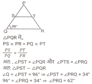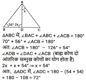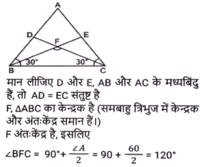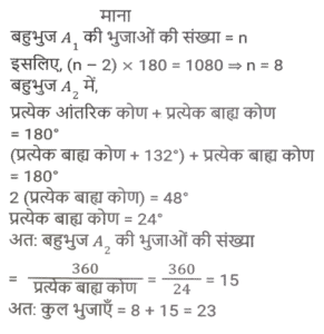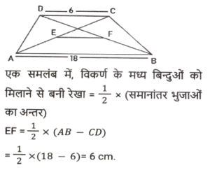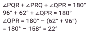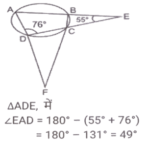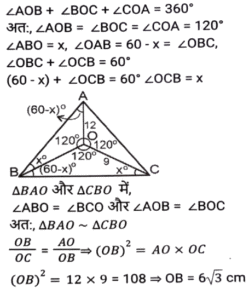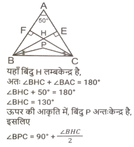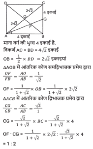 ज्यामिति (Part-XII)Total Questions: 5021. S और T ∆PQR की क्रमशः PQ और PR भुजाओं पर इस प्रकार बिंदु हैं कि PS × PR = PQ × PT. यदि ∠Q = 96° और ∠PST= ∠PRQ + 34°, तो ∠QPR = ? [SSC CGL Tier II (29/01/2022)](a) 26°(b) 24°(c) 22°(d) 25°Correct Answer: (c) 22°Solution:22. ∆ABC के अंदर में O एक ऐसा बिंदु है कि OA = 12cm OC = 9 cm ∠AOB = ∠BOC = ∠COA और ∠ABC = 60° OB की लंबाई (cm में) क्या है? [SSC CGL Tier II (29/01/2022)](a) 6√2(b) 6√3(c) 4√3(d) 4√6Correct Answer: (b) 6√3Solution:23. ABCD एक चतुर्भुज है जिसमें AB II DC, E और F क्रमशः विकर्ण AC और BD के मध्यबिंदु हैं। यदि AB = 18cm और CD = 6cm तो EF =? [SSC CGL Tier II (29/01/2022)](a) 12(b) 9(c) 6(d) 8Correct Answer: (c) 6Solution:24. A₁ और A₂ दो सम बहुभुज हैं। A₁ के सभी आंतरिक कोणों का योग 1080° है। A₂ का प्रत्येक आंतरिक कोण इसके बाहरी कोण से 132° अधिक है। A₁ और A₂ भुजाओं की संख्या का योग है: [SSC CGL Tier II (03/02/2022)](a) 21(b) 22(c) 23(d) 24Correct Answer: (c) 23Solution:25. ABCD एक चक्रीय चतुर्भुज है। भुजाएँ AB और DC, बढ़ाये जाने पर, E पर मिलती हैं और भुजाएँ AD और BC बढ़ाये जाने पर F पर मिलती हैं। यदि ∠ADC = 76° और ∠AED = 55° तो ∠AFB का मान है: [SSC CGL Tier II (03/02/2022)](a) 34°(b) 26°(c) 29°(d) 27°Correct Answer: (d) 27°Solution:26. ∆ABC में, D और E क्रमशः BC और AB की भुजाओं पर इस प्रकार स्थित बिंदु हैं कि ∠ACB = ∠DEB है। यदि AB = 12 cm, BE = 5 cm और BD : CD = 1 :2 है, तो BC का मान है: [SSC CGL Tier II (03/02/2022)](a) 8√3 cm(b) 5√5 cm(c) 6√5 cm(d) 6√3 cmCorrect Answer: (c) 6√5 cmSolution:27. एक वर्ग ABCD में, विकर्ण AC और BD, O पर प्रतिच्छेद करते हैं। ∠CAB का कोण समद्विभाजक क्रमशः BD और BC को F और G पर मिलता है। OF : CG बराबर है: [SSC CGL Tier II (03/02/2022)](a) 1 : 2(b) 1 : 3(c) 1 : √2(d) 1 : √3Correct Answer: (a) 1 : 2Solution:28. △ABC में, ∠A = 50º BE और CF क्रमशः AC और AB पर, बिंदु E और F पर लंबवत हैं। BE और CF, H पर प्रतिच्छेद करते हैं। ∠HBC और ∠HCB के समद्विभाजक P पर प्रतिच्छेद करते हैं। ∠BPC बराबर है: [SSC CGL Tier II (03/02/2022)](a) 155°(b) 100°(c) 115°(d) 120°Correct Answer: (a) 155°Solution:29. समबाहु △ABC में, D और E क्रमशः AB और AC की भुजाओं पर इस प्रकार स्थित बिंदु हैं कि AD = CE, BE और CD, F पर प्रतिच्छेद करती है। ∠CFB का माप (डिग्री में) है: [SSC CGL Tier II (03/02/2022)](a) 120°(b) 135°(c) 125°(d) 105°Correct Answer: (a) 120°Solution:30. △ABC में, D, BC पर एक ऐसा बिंदु है कि ∠ADB = 2 ∠DAC, ∠BAC = 70° और ∠B = 56° है। ∠ADC का माप क्या है? [SSC CGL Tier II (03/02/2022)](a) 72°(b) 54°(c) 74°(d) 81°Correct Answer: (a) 72°Solution:Submit Quiz« Previous12345Next »