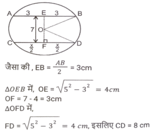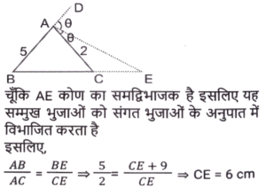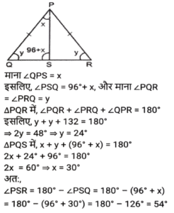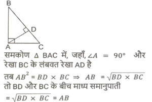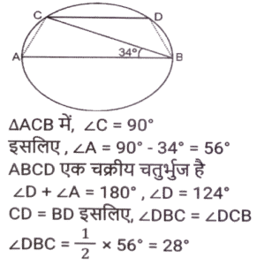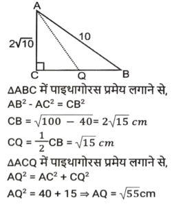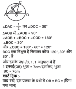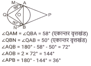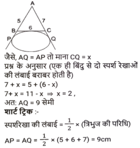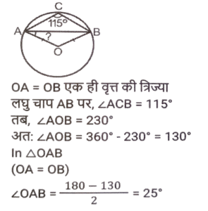 ज्यामिति (Part-XII)Total Questions: 5031. ∆PQR में, PQ = PR और S, QR पर एक ऐसा बिंदु है कि ∠PSQ = 96° + ∠QPS और ∠QPR = 132° I ∠PSR का माप क्या है? [SSC CGL Tier II (03/02/2022)](a) 45°(b) 56°(c) 54°(d) 52°Correct Answer: (c) 54°Solution:32. ∆ABC में, ∠BAC = 90°, BC पर A से AD लम्ब खींचा जाता है। निम्नलिखित में से कौन सा BD और BC के बीच का माध्य आनुपात है? [SSC MTS 05/10/2021 (Morning)](a) AD(b) AB(c) CD(d) ACCorrect Answer: (b) ABSolution:33. एक त्रिभुज ABC में AB : AC = 5 : 2. BC = 9 सेमी। BA को D तक बढ़ाया जाता है, और कोण CAD का समद्विभाजक E पर BC से मिलता है। CE की लंबाई (सेमी में) क्या है? [SSC CGL 13/08/2021 (Afternoon)](a) 9(b) 10(c) 6(d) 3Correct Answer: (c) 6Solution:34. केंद्र O वाले एक वृत्त में AD व्यास है और AC जीवा है। बिंदु B, AC पर इस प्रकार है कि OB = 7 सेमी और ∠OBA = 60° है। यदि ∠DOC = 60° है, तो BC की लंबाई (से.मी. में) क्या है? [SSC CGL 13/08/2021 (Afternoon)](a) 7(b) 9(c) 5(d) 3.5Correct Answer: (a) 7Solution:35. ∆ABC में, C = 90º और Q, BC का मध्यबिंदु है। यदि AB = 10 सेमी और AC = 2√10 सेमी, तो AQ की लंबाई है। [SSC CGL 13/08/2021 (Evening)](a) √55 cm(b) 5√3 cm(c) 5√2 cm(d) 3√5 cmCorrect Answer: (a) √55 cmSolution:36. केंद्र O और त्रिज्या 5 सेमी वाले एक वृत्त में। AB और CD दो समानांतर जीवाएँ हैं जिनकी लंबाई क्रमशः 6 सेमी और x सेमी है और जीवाएँ केंद्र O के विपरीत दिशा में हैं। जीवाओं के बीच की दूरी 7 सेमी है। [SSC CGL 16/08/2021 (Morning)](a) 12(b) 8(c) 10(d) 9Correct Answer: (b) 8Solution:37. केंद्र O वाले एक वृत्त में, AB एक व्यास है और CD एक जीवा इस प्रकार है कि ∠ABC = 34° और CD = BD है। ∠DBC का माप क्या है? [SSC CGL 16/08/2021 (Morning)](a) 30°(b) 24°(c) 32°(d) 28°Correct Answer: (d) 28°Solution:38. △ABC केंद्र O वाले एक वृत्त में इस प्रकार अंकित है कि ∠ACB = 115°, O को A से जोड़ा जाता है। ∠OAB का माप क्या है? [SSC CGL 16/08/2021 (Evening)](a) 30°(b) 20°(c) 25°(d) 35°Correct Answer: (c) 25°Solution:39. एक त्रिभुज ABC की भुजाएँ 5 सेमी, 6 सेमी और 7 सेमी हैं। AB बढ़ाने पर एक वृत्त को P पर स्पर्श करता है और AC को भी बढ़ाने पर उसी वृत्त को Q पर स्पर्श करता है। AQ की लंबाई (सेमी में) ज्ञात कीजिए। [SSC CGL 17/08/2021 (Morning)](a) 13(b) 12(c) 9(d) 11Correct Answer: (c) 9Solution:40. बिंदु A और B केंद्र O वाले एक वृत्त पर हैं। PAM और PBN वृत्त के बाहर एक बिंदु P से क्रमशः A और B पर वृत्त की स्पर्श रेखाएँ हैं। बिंदु Q दीर्घ चाप AB पर इस प्रकार है कि QAM = 58° और ∠QBN = 50° है, तो ∠APB की माप ज्ञात कीजिए। [SSC CGL 17/08/2021 (Evening)](a) 30°(b) 32°(c) 36°(d) 40°Correct Answer: (c) 36°Solution:Submit Quiz« Previous12345Next »