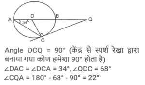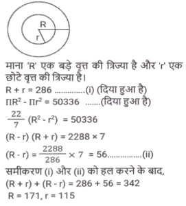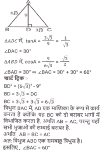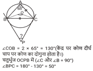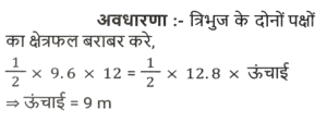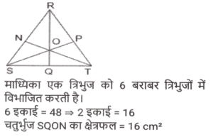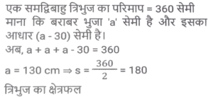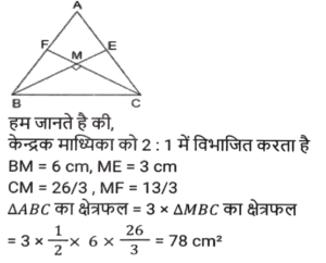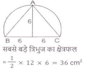 ज्यामिति (Part-XIII)Total Questions: 3521. सबसे बड़े त्रिभुज का क्षेत्रफल (cm²), जो 6 सेमी त्रिज्या के अर्धवृत्त में अंकित किया जा सकता है: [SSC CHSL 11/08/2021 (Evening)](a) 36(b) 34(c) 35(d) 38Correct Answer: (a) 36Solution:22. एक त्रिभुज ABC का शीर्षलंब AD = 9 सेमी है। यदि AB = 6√3 cm और CD = 3√3 cm है, तो ∠A का माप क्या होगा? [SSC CHSL 12/04/2021 (Morning)](a) 90º(b) 30º(c) 45º(d) 60ºCorrect Answer: (d) 60ºSolution:23. △ABC एक वृत्त में इस प्रकार खींचा गया है कि AC = BC और ∠BAC = 65°। बिंदु B और C से दो स्पर्श रेखाएँ खींची जाती हैं जो बिंदु P पर प्रतिच्छेद करती हैं। ∠BPC का माप क्या है? [SSC CHSL 12/08/2021 (Afternoon)](a) 52.5°(b) 50º(c) 55°(d) 32.5°Correct Answer: (b) 50ºSolution:24. एक त्रिभुज की दो भुजाएँ 12.8 मी और 9.6 मी हैं। यदि त्रिभुज की ऊंचाई 12 मीटर है, जो 9.6 मीटर के अनुरूप है, तो इसकी ऊंचाई (मी में) 12.8 मीटर के अनुरूप क्या है? [SSC CHSL 13/04/2021 (Afternoon)](a) 12(b) 9(c) 10(d) 8Correct Answer: (b) 9Solution:25. AB, केंद्र D वाले वृत्त का एक व्यास है। वृत्त के बिंदु C पर स्पर्श रेखा, AB को बढ़ाने पर बिंदु Q पर मिलती है। यदि ∠BAC = 34° है, तो ∠CQA (डिग्री में) का माप होगा: [SSC CHSL 15/04/2021 (Morning)](a) 26°(b) 36°(c) 22°(d) 24°Correct Answer: (c) 22°Solution:26. एक समद्विबाहु त्रिभुज का परिमाप 3.6 m है और इसका आधार प्रत्येक समान भुजा से 30 सेमी छोटा है। त्रिभुज का क्षेत्रफल (in m²) क्या है? [SSC CHSL 15/04/2021 (Afternoon)](a) 0.6(b) 0.72(c) 0.54(d) 0.8Correct Answer: (a) 0.6Solution:27. दो वृत्तों की त्रिज्याओं का योग 286 सेमी है और संकेंद्रित वृत्तों के बीच का क्षेत्रफल 50336 सेमी है। दोनों वृत्तों की त्रिज्या (सेमी² में) क्या है? [SSC CHSL 15/04/2021 (Afternoon)](a) 115 और 91(b) 115 और 171(c) 91 और 84(d) 171 और 84Correct Answer: (b) 115 और 171Solution:28. ∆RST की तीन माध्यिकाएँ RQ, SP और TN बिंदु O पर प्रतिच्छेद करती हैं। यदि ∆RST का क्षेत्रफल 48 cm² है, तो चतुर्भुज SQON का क्षेत्रफल (cm²) है: [SSC CHSL 15/04/2021 (Evening)](a) 20(b) 12(c) 16(d) 18Correct Answer: (c) 16Solution:29. 42 मीटर और 35 मीटर त्रिज्या के दो गोलाकार फुटबॉल मैदानों को एक बड़े गोलाकार मैदान से बदला जाना है। इस नए मैदान की त्रिज्या क्या होगी यदि नए मैदान का क्षेत्रफल दो छोटे मैदानों के क्षेत्रफल के योग के बराबर हो? (मीटर में) [SSC CHSL 15/04/2021 (Evening)](a) √2979(b) √2981(c) √2999(d) √2989Correct Answer: (d) √2989Solution:30. ∆ABC में, माध्यिकाएँ BE और CF एक दूसरे के लंबवत हैं और M पर प्रतिच्छेद करती हैं। यदि BE = 9 सेमी और CF = 13 सेमी है, तो △ABC का क्षेत्रफल (cm²) होगा: [SSC CHSL 15/4/2021 (Evening)](a) 75(b) 78(c) 76(d) 68Correct Answer: (b) 78Solution:Submit Quiz« Previous1234Next »